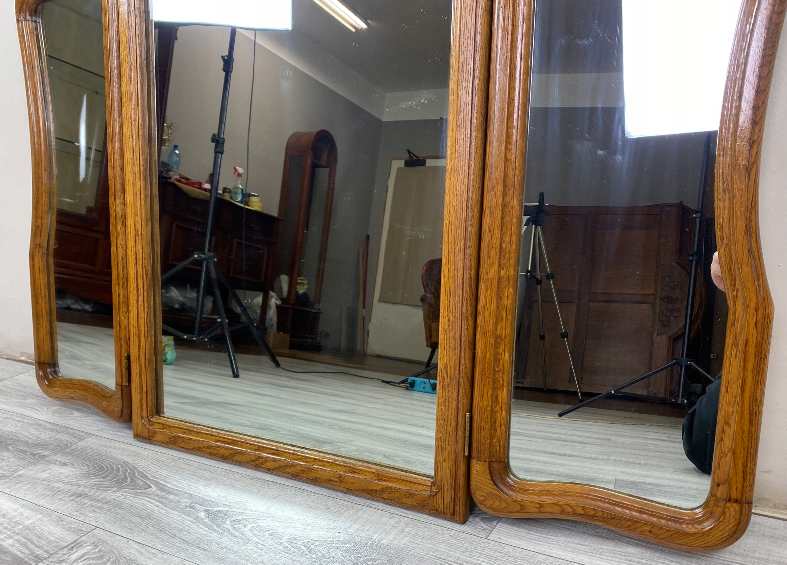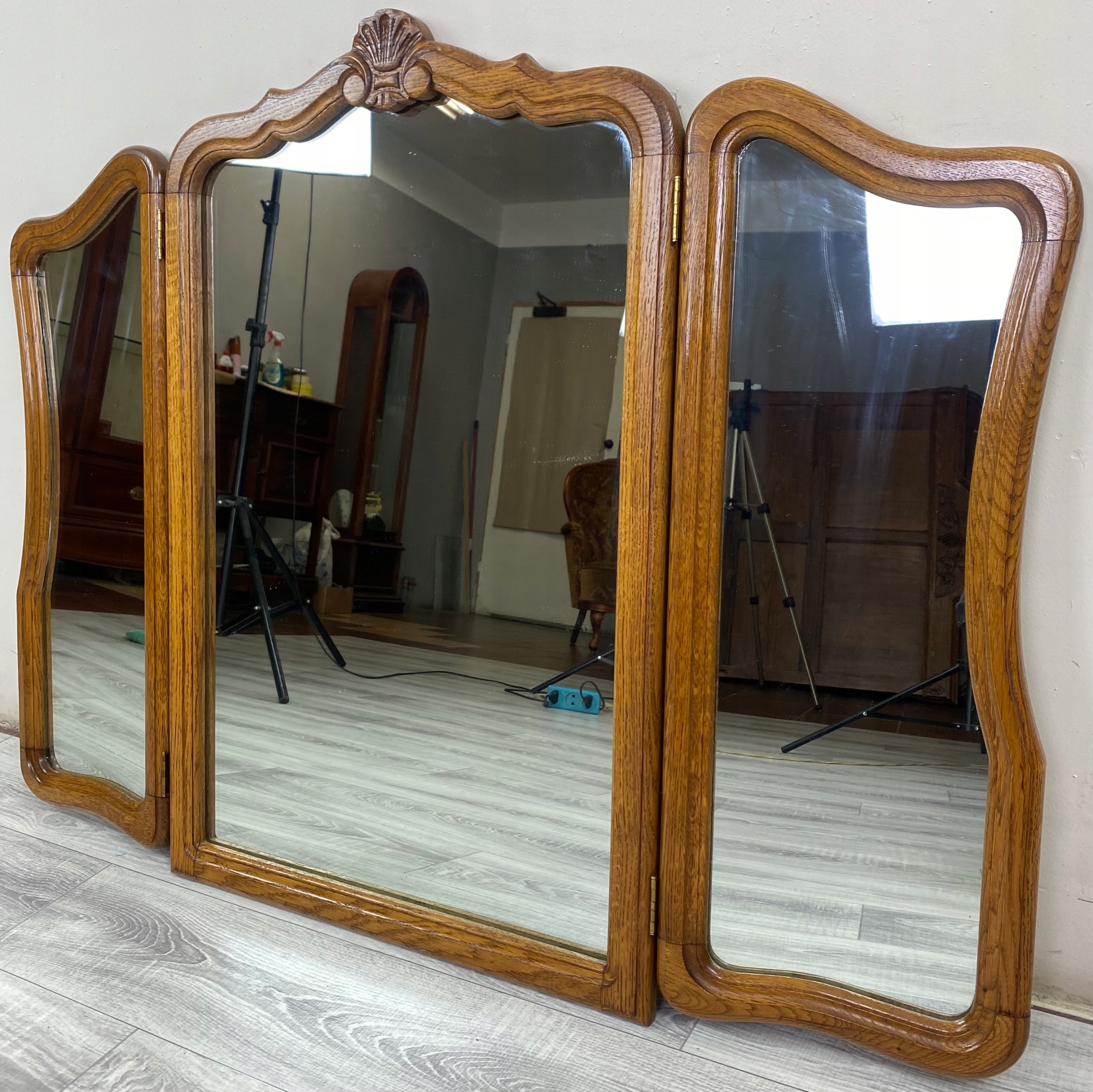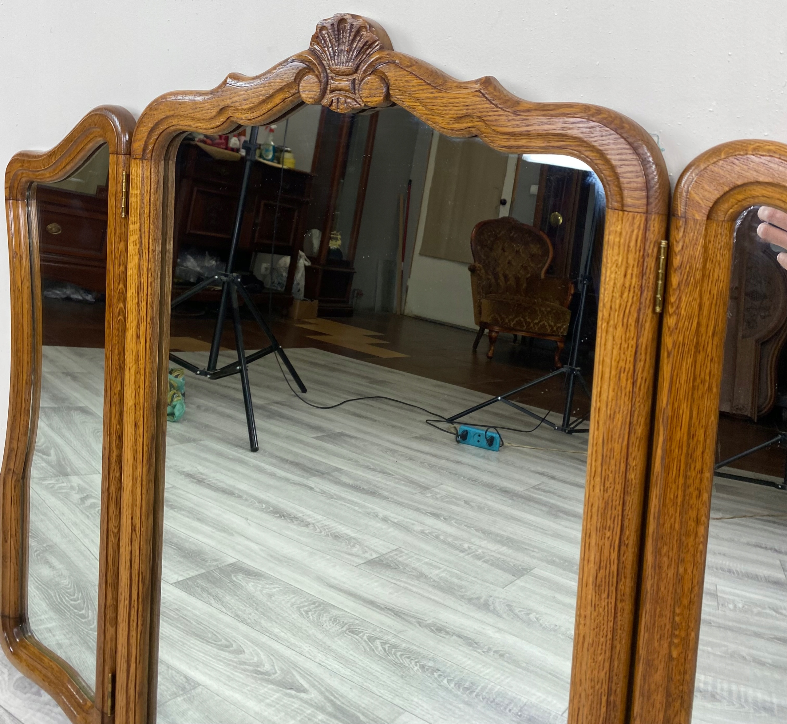 Дзеркало складається з трьох стекол - одного більшого, середнього і два. менші, бічні, які рухливі завдяки петлям. Таке розташування дозволяє зручно встановлювати стулки під різними кутами, що дозволяє бачити відображення з кількох ракурсів одночасно - ідеальне рішення для туалетного столика або шафи.