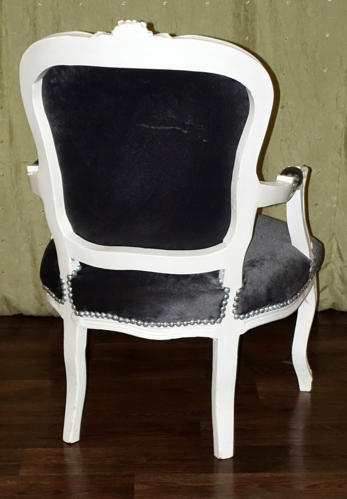 Новий предмет меблів, який не використовувався, виготовлений у сучасному, старовинному стилі, щоб виглядати під старовину. Дерево античного білого кольору. Оббивка з плюшевого матеріалу сталевого кольору; оздоблено зі смаком.