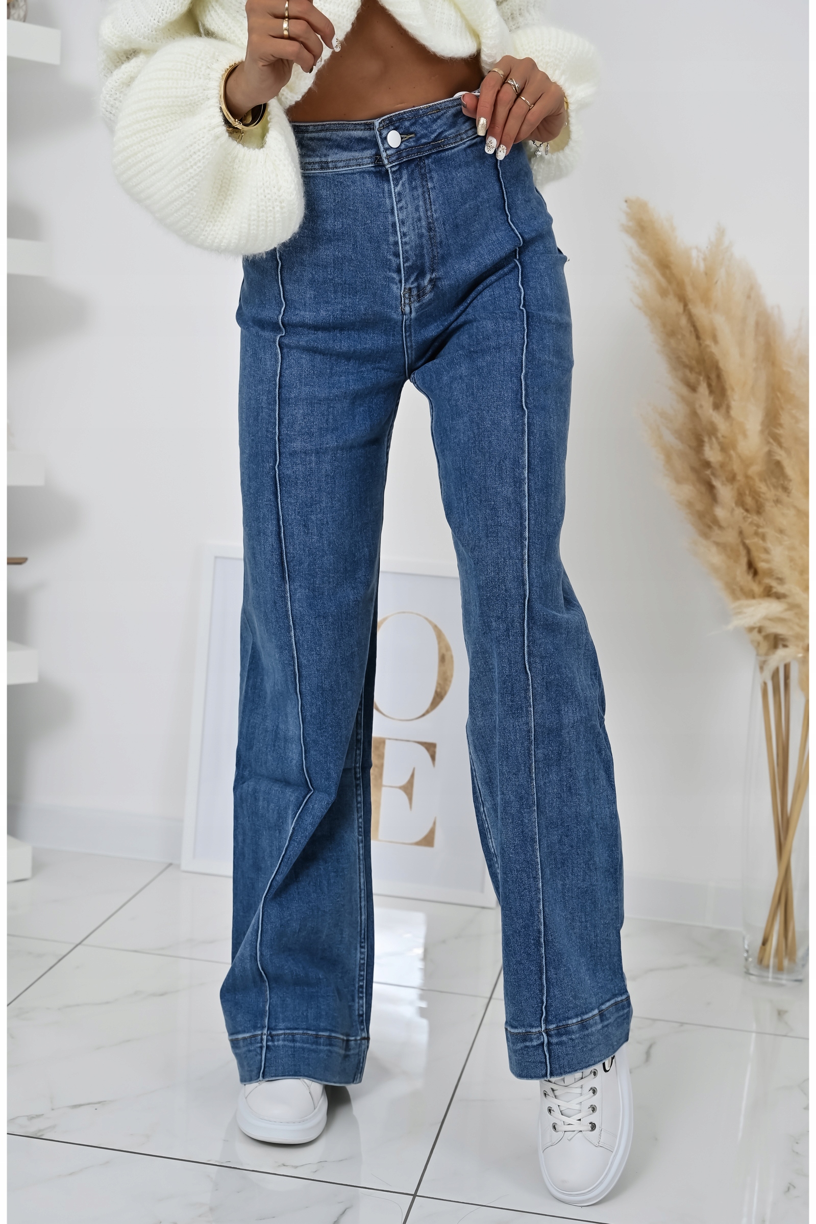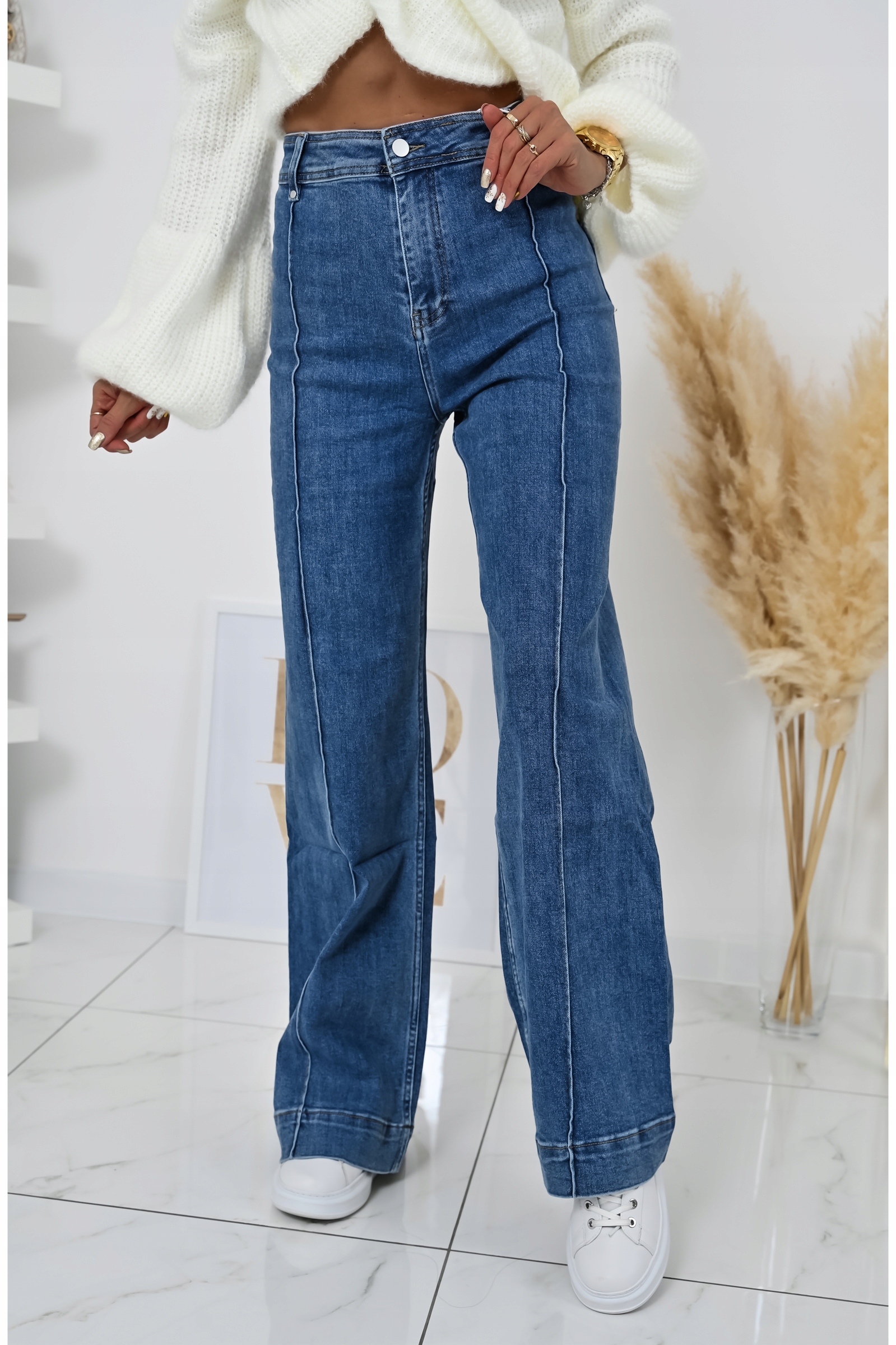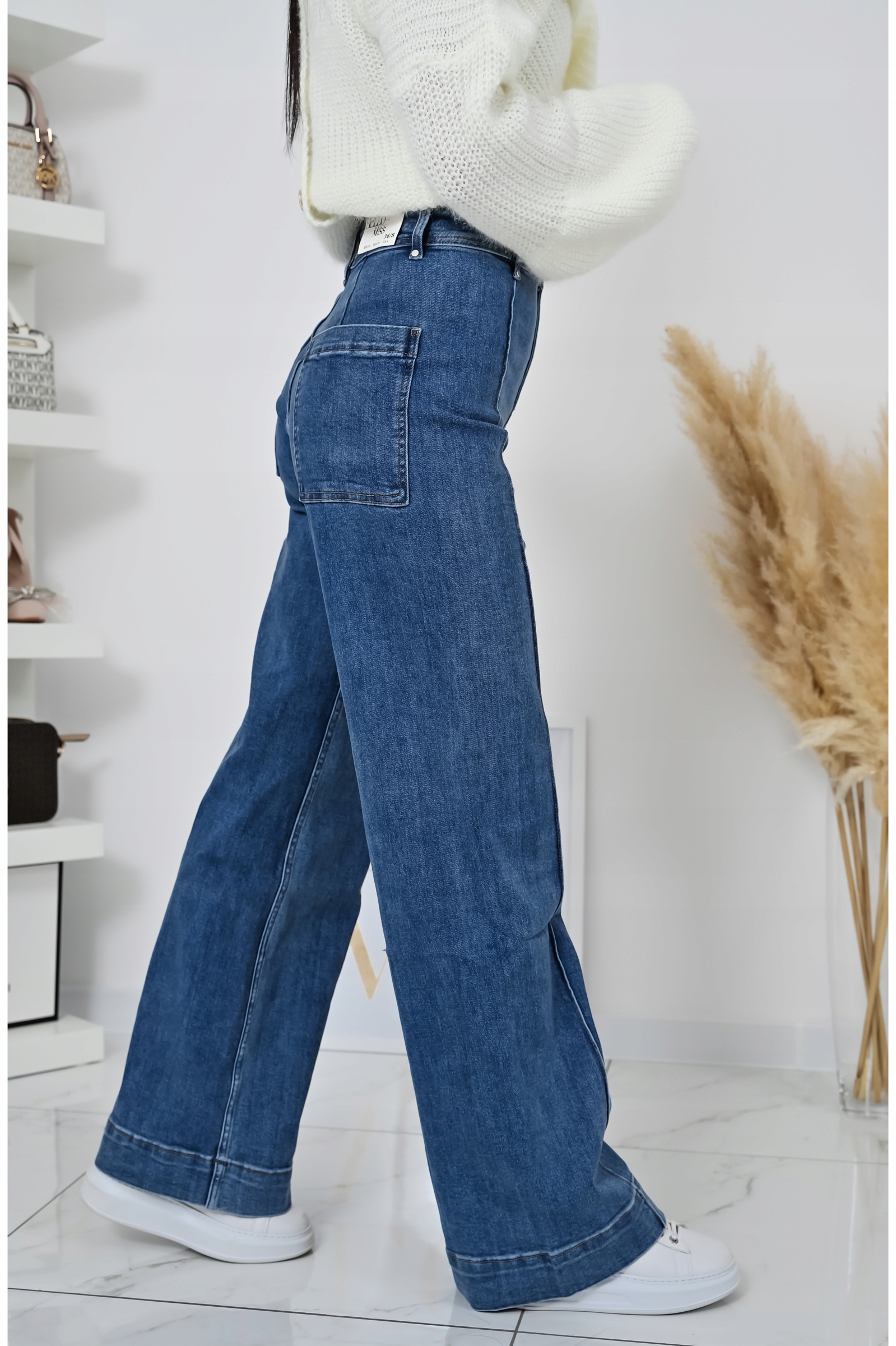 Модні жіночі джинси з високою талією класичного синього відтінку, які гарно формують фігуру.