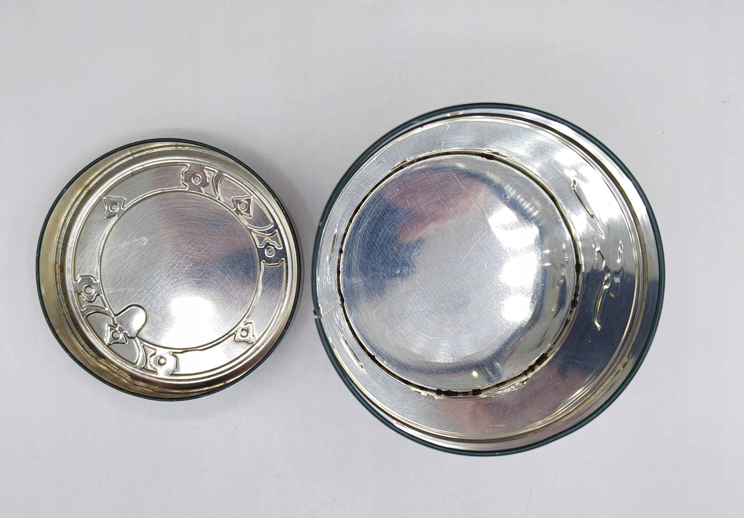 виготовлений з металу. Він не покритий деяким папером, це прекрасний принт, який безпосередньо закладений на метал. Розміри: висота 13,5 см, діаметр 11 см, вага: 130 г. Використовується, в місцях він має невеликі вм'ятини - все ще дуже гарні. Live виглядати так само приємно, як на знімках.