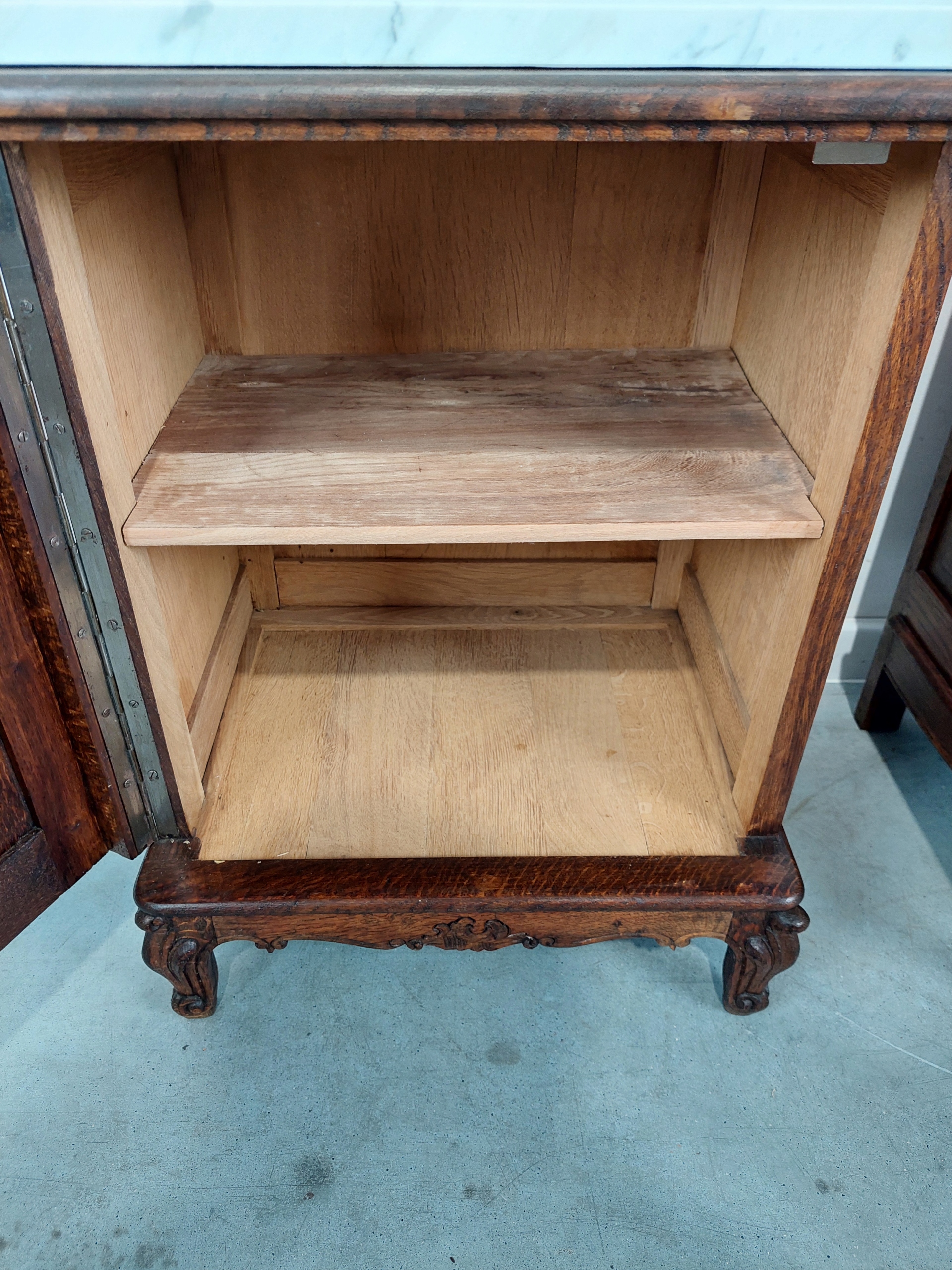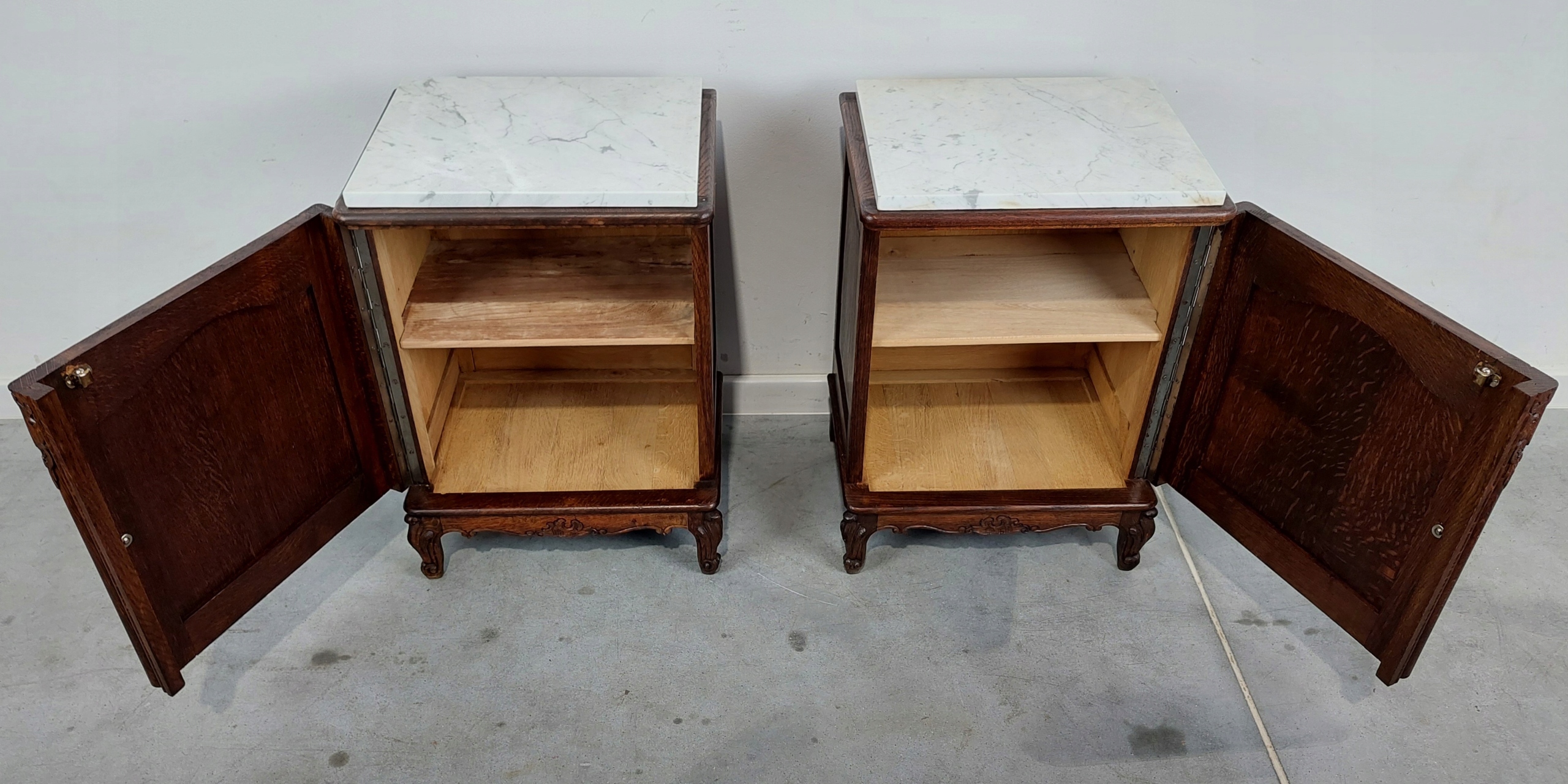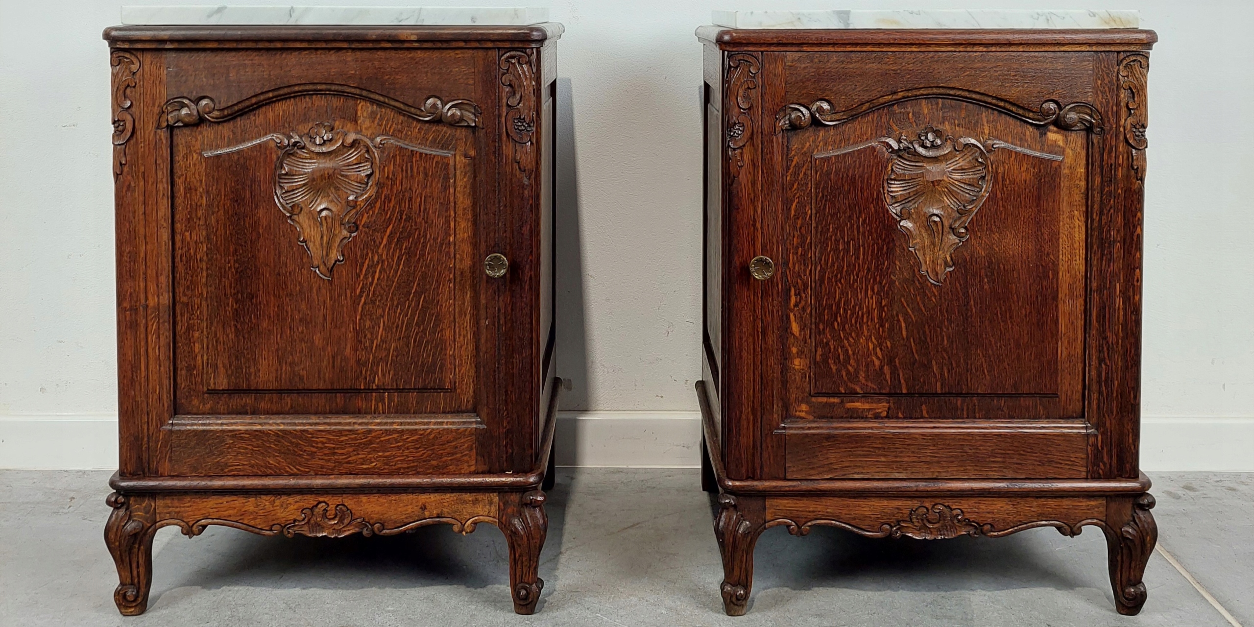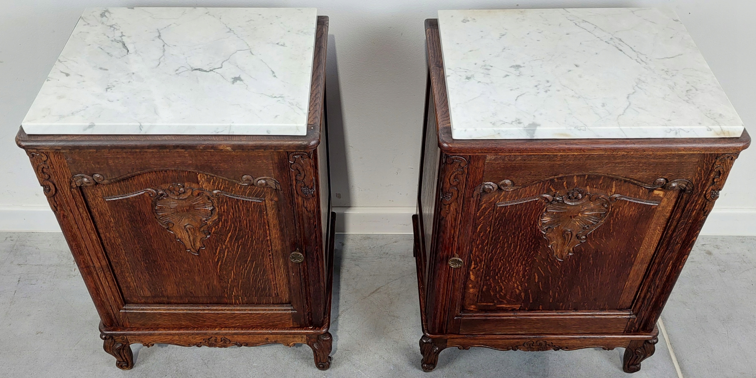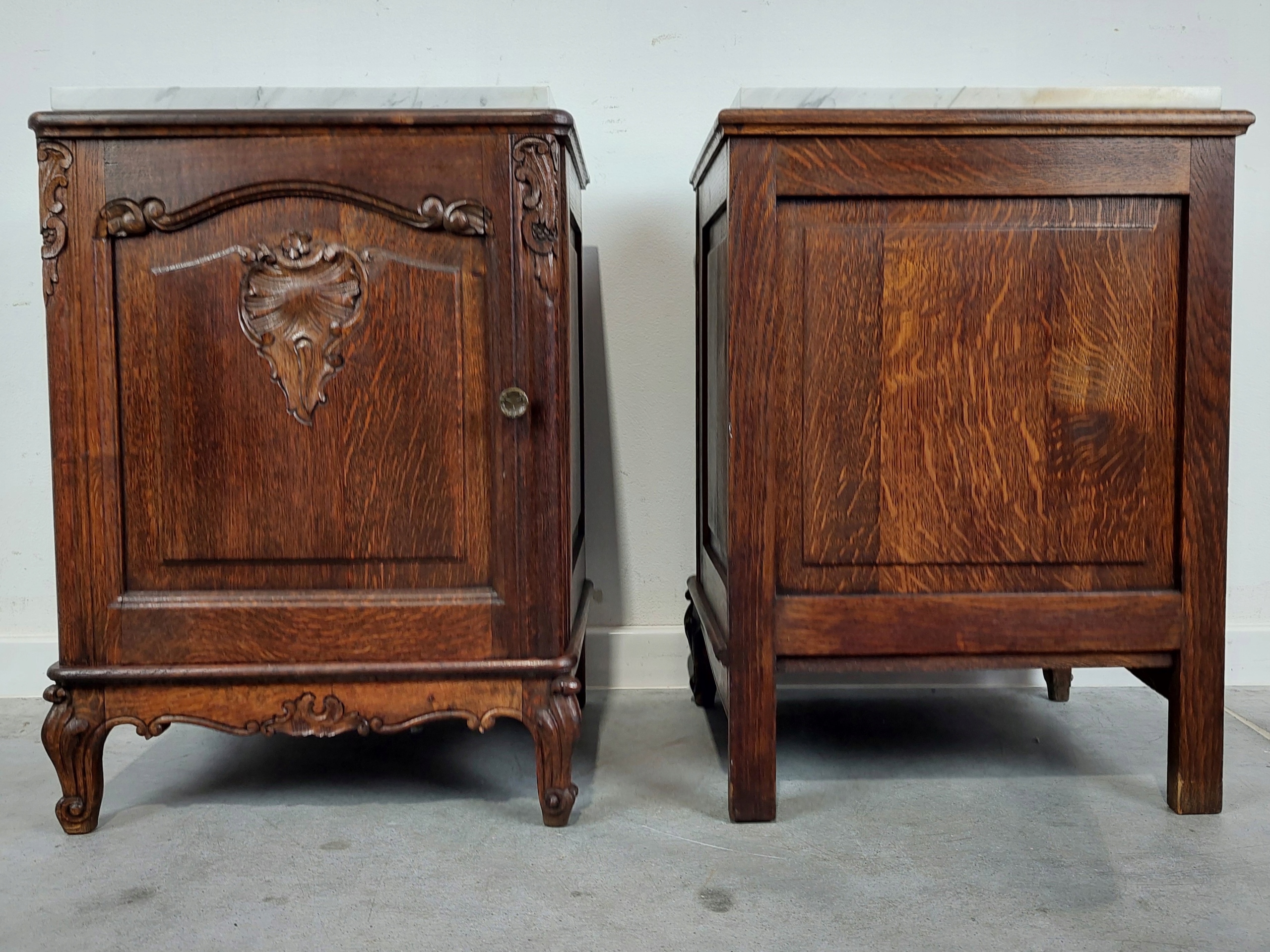 Стильні дубові тумбочки привезені з Франції. Унікальна модель в стилі рококо, масив меблів з дуба, багато різьблені фасади. Стаціонарно закріплена мармурова плита на стільницях. Меблі мають типові сліди використання та знаходяться у відмінному стані (враховуючи вік, дата створення близько 1920 року). Ціна вказана за комплект (2шт). Деталі описані та показані на фотографіях.