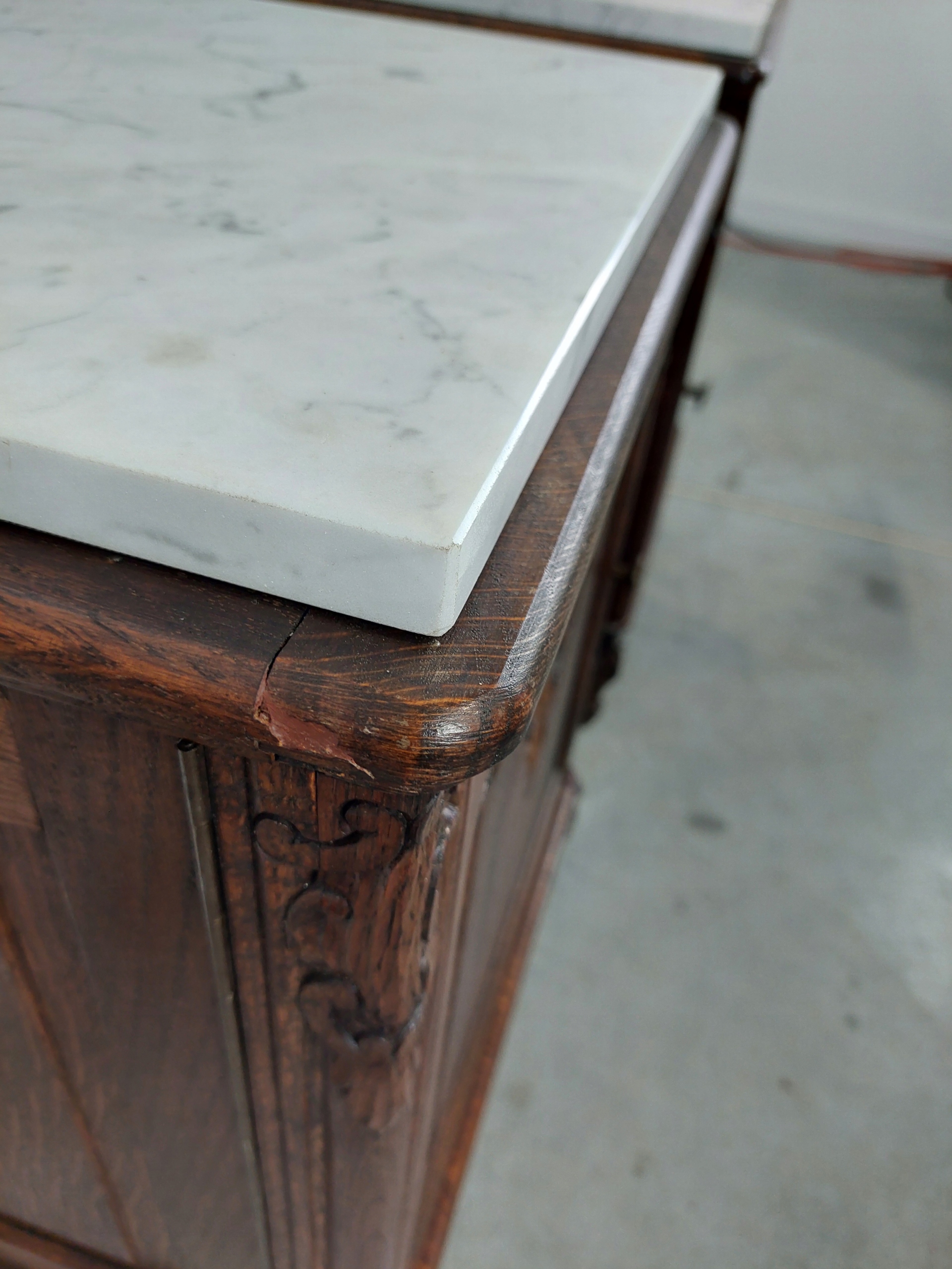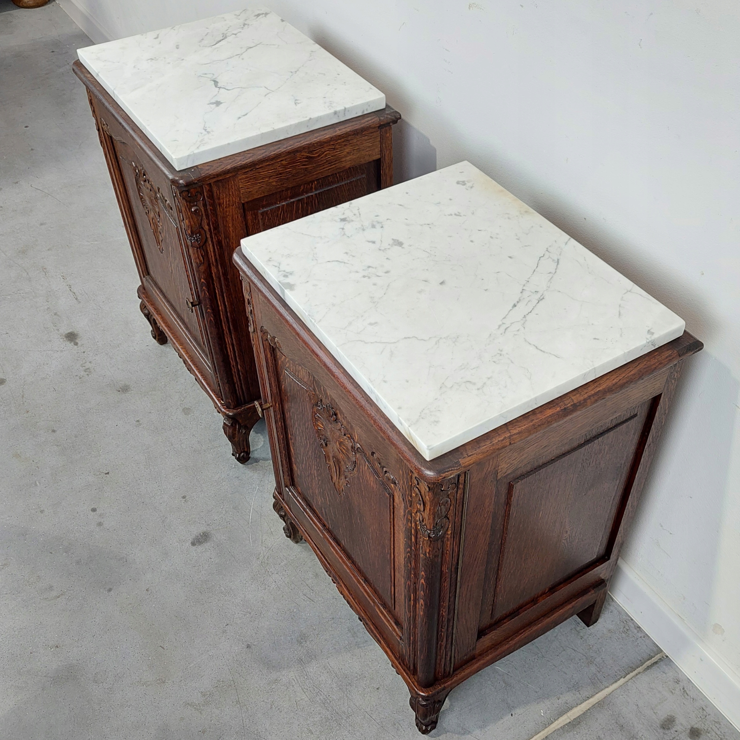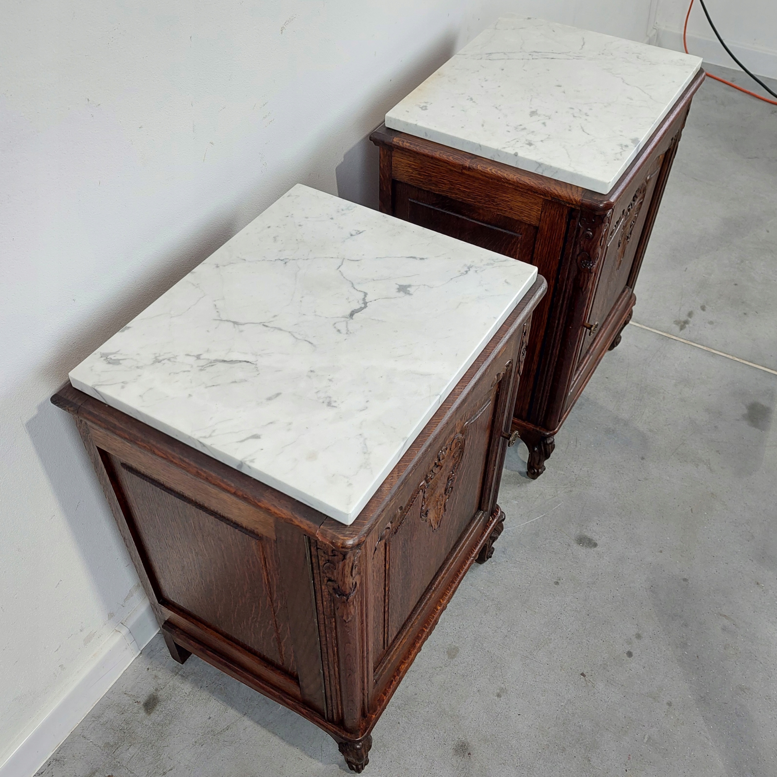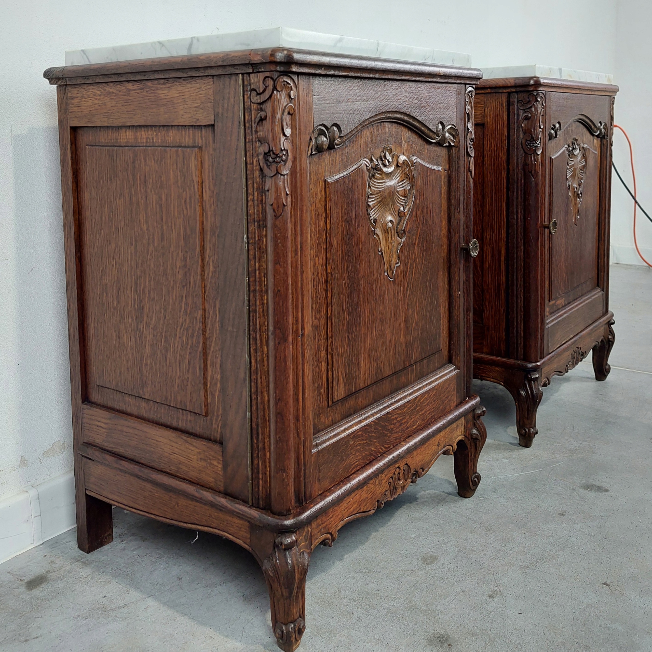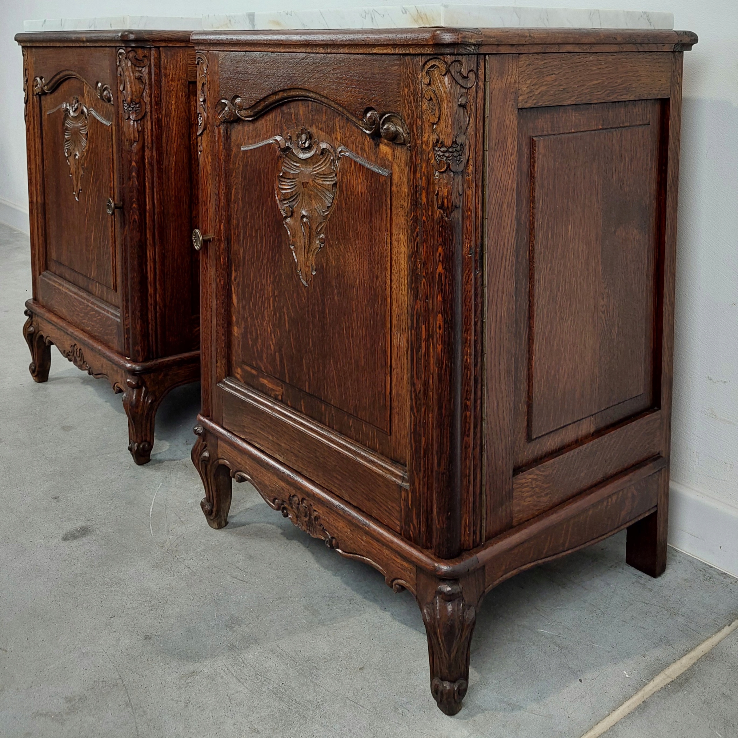 Стильні дубові тумбочки привезені з Франції. Унікальна модель в стилі рококо, масив меблів з дуба, багато різьблені фасади. Стаціонарно закріплена мармурова плита на стільницях. Меблі мають типові сліди використання та знаходяться у відмінному стані (враховуючи вік, дата створення близько 1920 року). Ціна вказана за комплект (2шт). Деталі описані та показані на фотографіях.