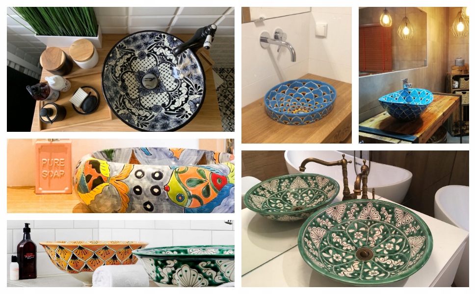 Перевірте також нашу пропозицію мексиканських умивальників і мідних умивальників ручної кування. Крім того, декорована настінна та підлогова плитка з різних куточків світу.