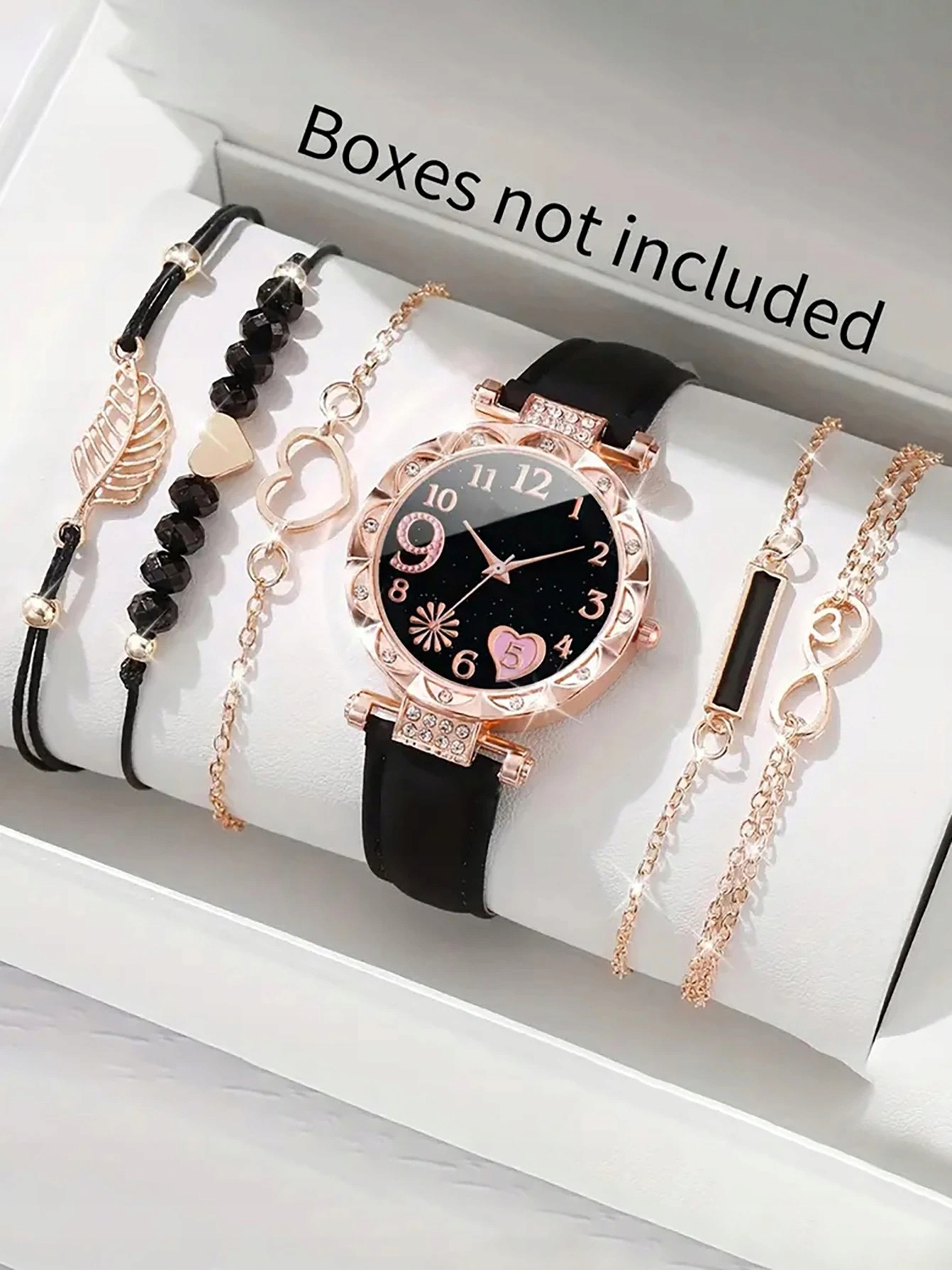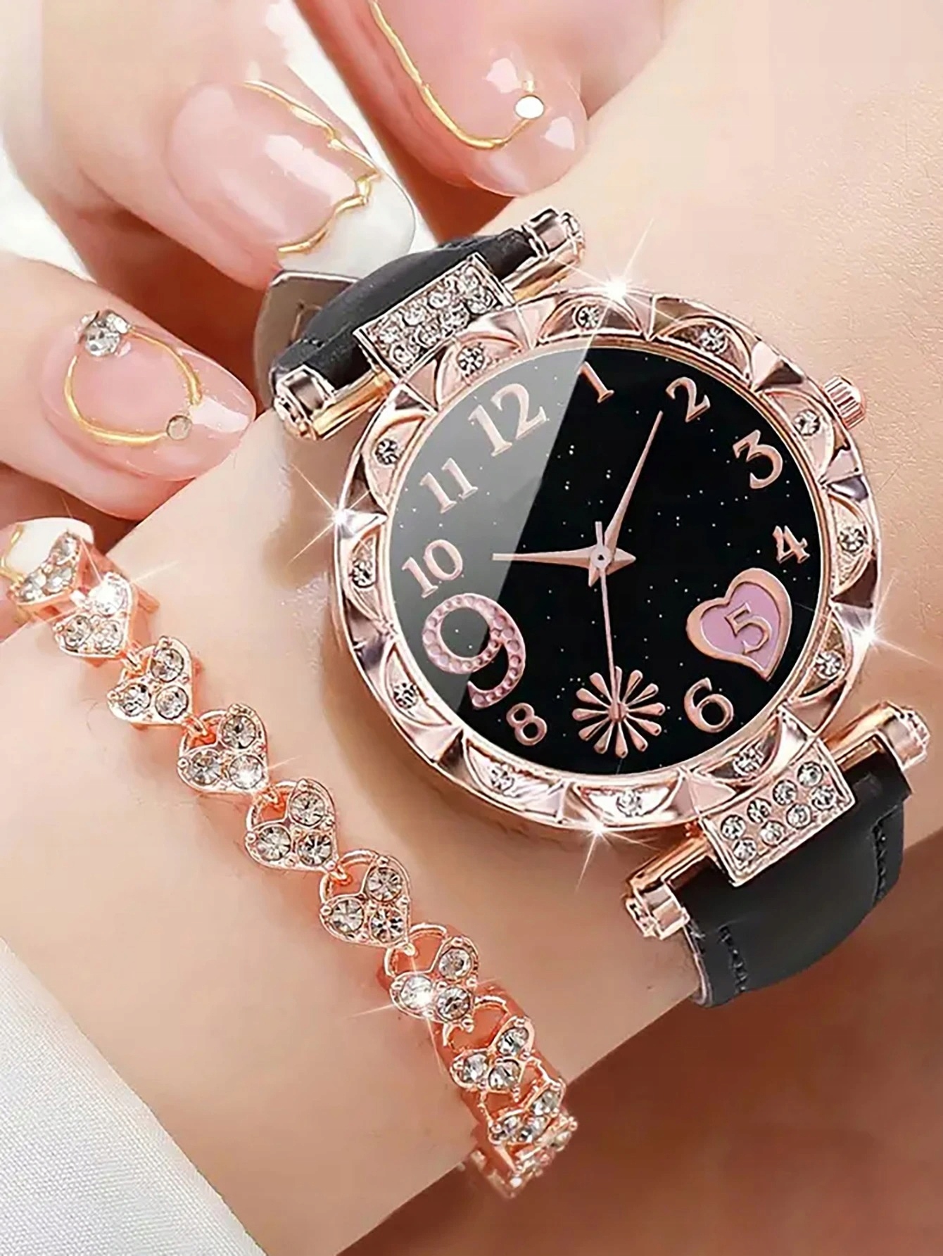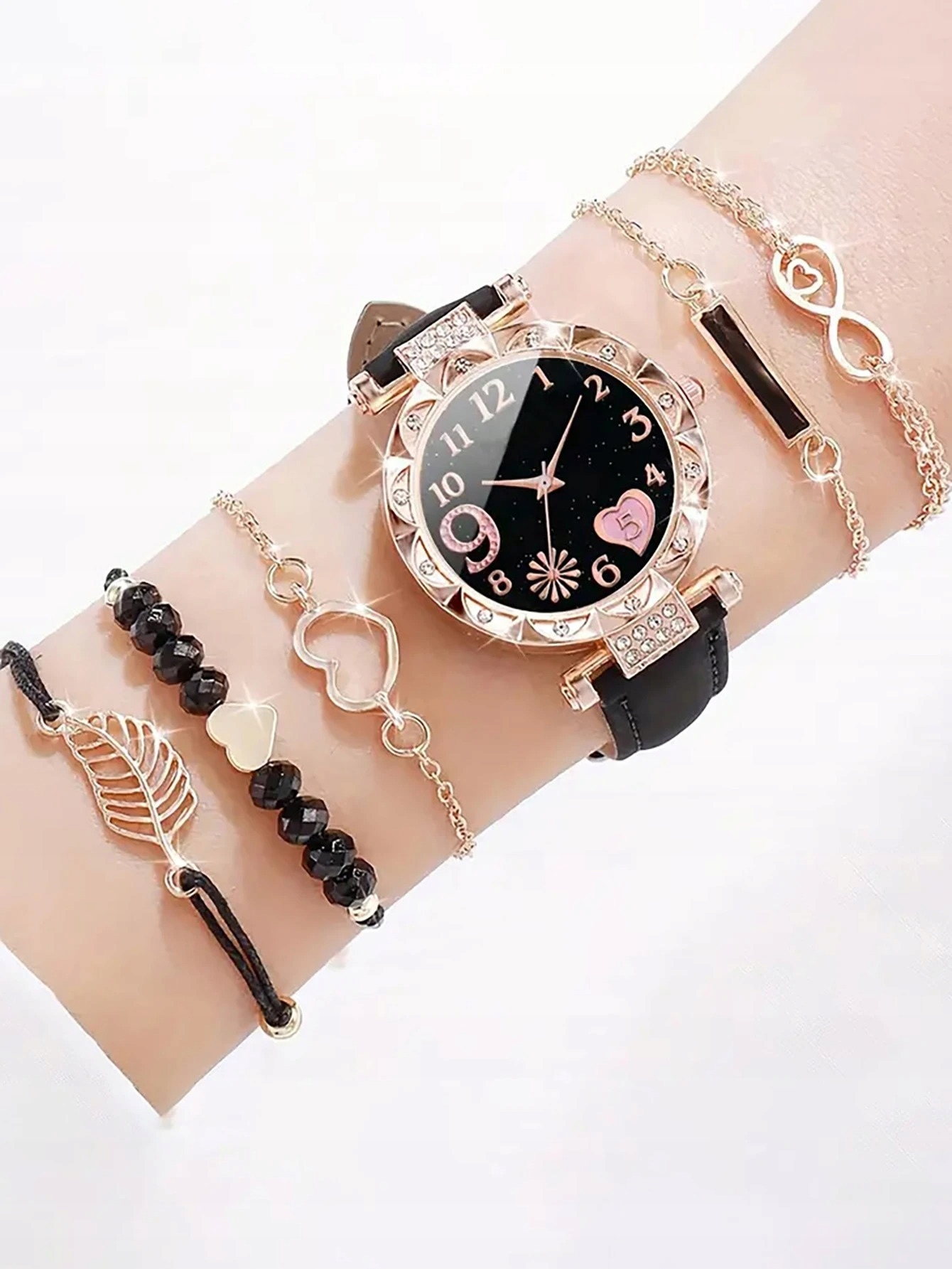 Stylish, classic alloy diamond set, women's quartz watch with mirror and crystals, with a set of leather feathers bracelets