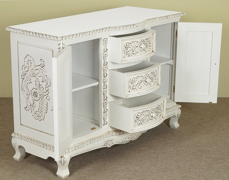 Предмет продажу новий, стильний комод. Меблі виготовлені з добірного масиву червоного дерева найвищої якості, пофарбовані антикварною, фабрично витриманою білою фарбою. Ця модель характеризується ретельною, трудомісткою різьбою, виконаною з максимальною увагою до деталей найкращими майстрами.