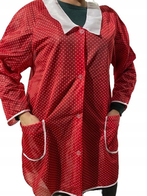 Жіночий захисний фартух з довгим рукавом. Дуже зручний крій з коміром, що застібається на гудзики. Має дві великі бічні кишені, дуже корисні під час роботи.