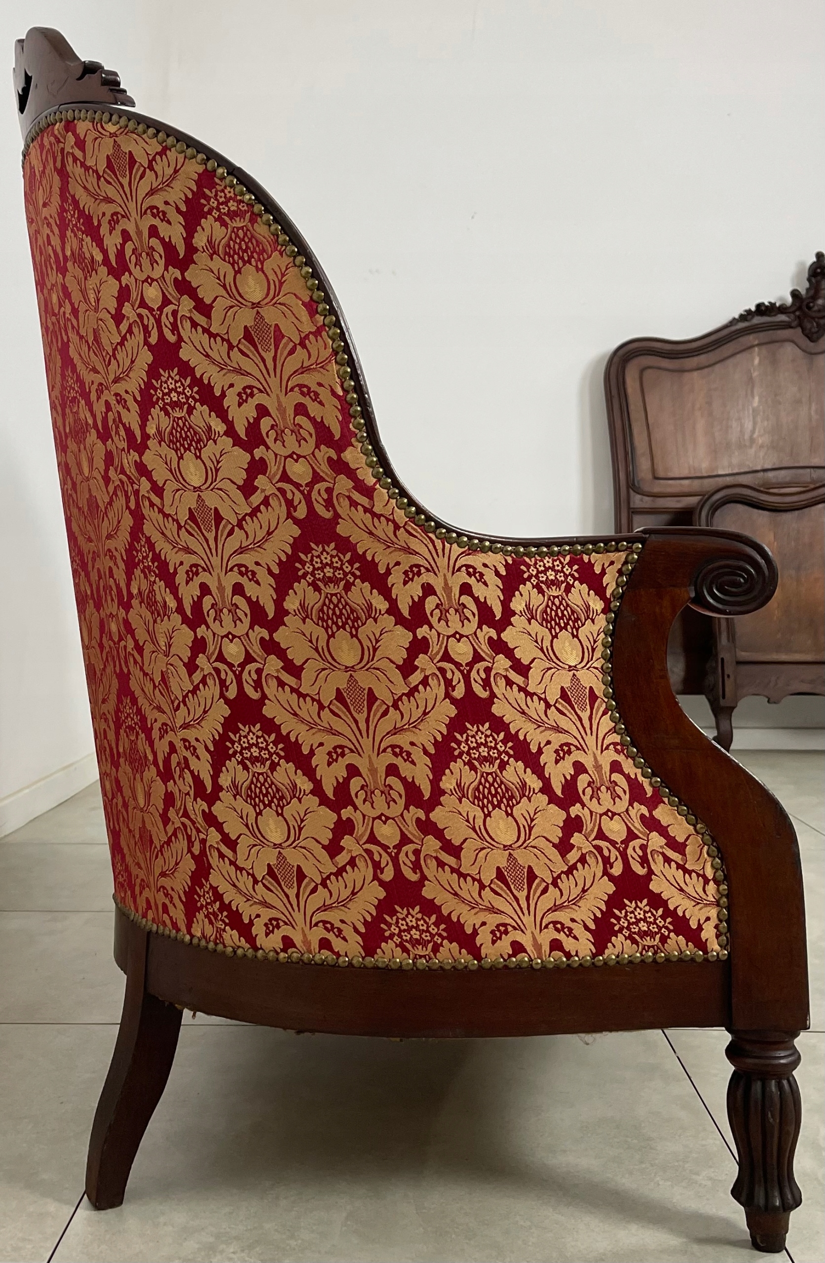Оббивка покрита високоякісною тканиною бордового кольору з золотистим рослинним візерунком, що ідеально підкреслює історичний характер меблів і надає їй палацового шарму.