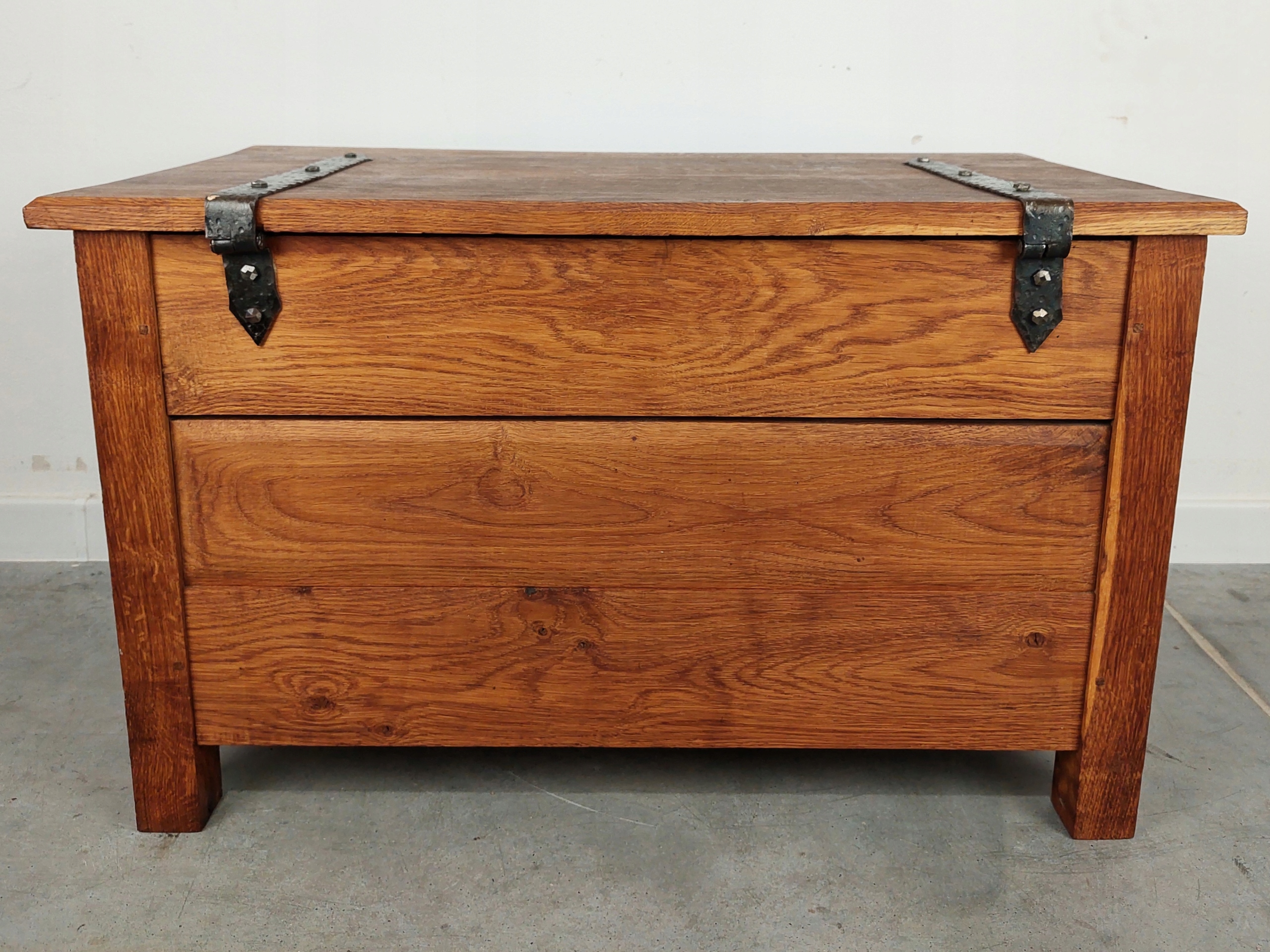 Стильне сидіння / багажник - комод - тумба для взуття. Унікальний предмет меблів, чудової різьби, з потужними кованими петлями. Все з масиву дуба. Меблі мають незначні сліди використання та через вік можливі сліди ремонту. Деталі показано на фотографіях нижче.