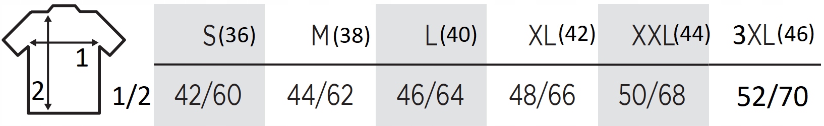 - Центр таблиці є плоскими виміряними розмірами: ширина під пахвами (1) / на довжину t -сорочки (2)