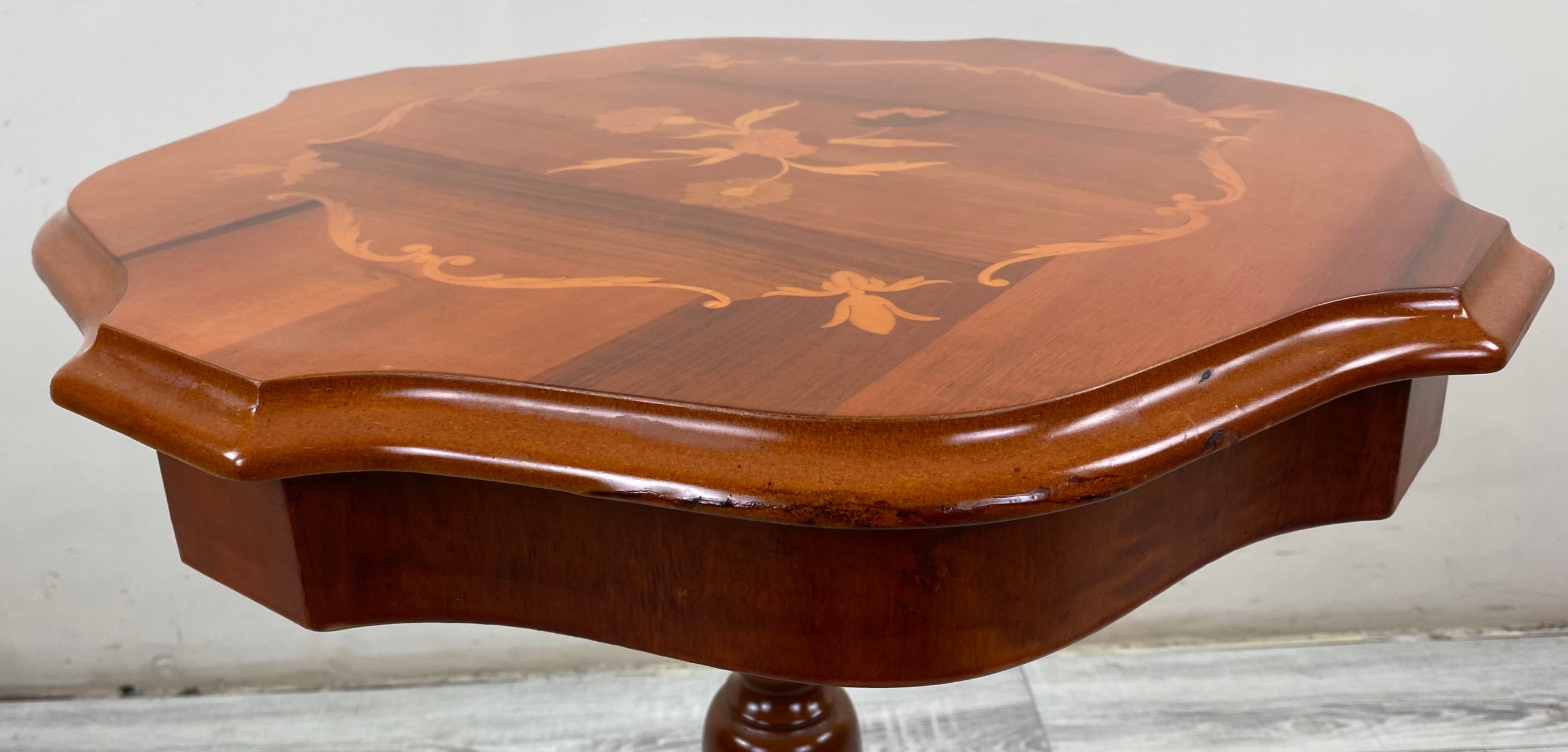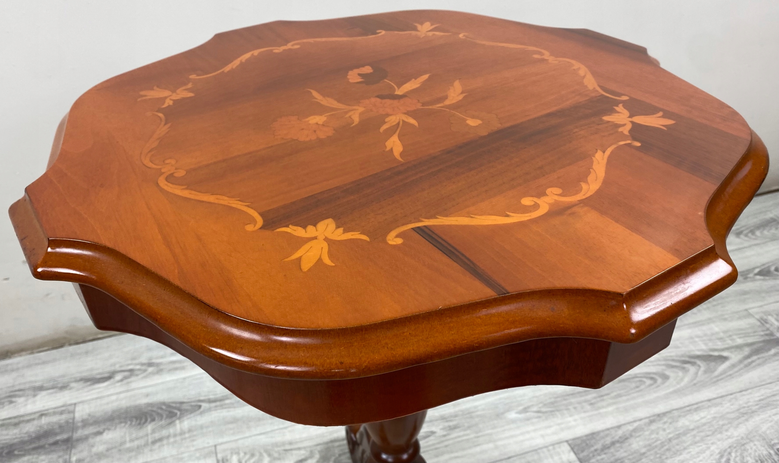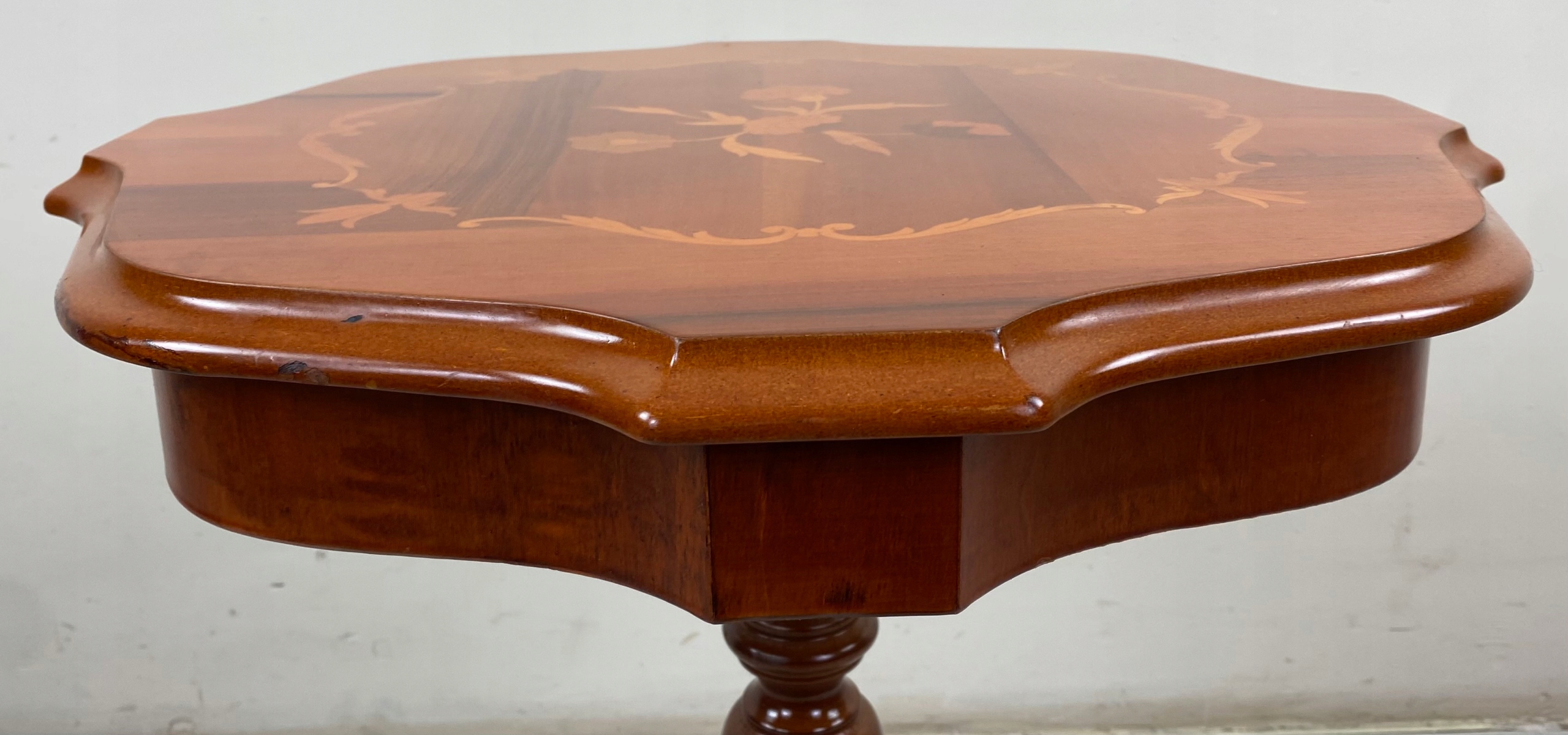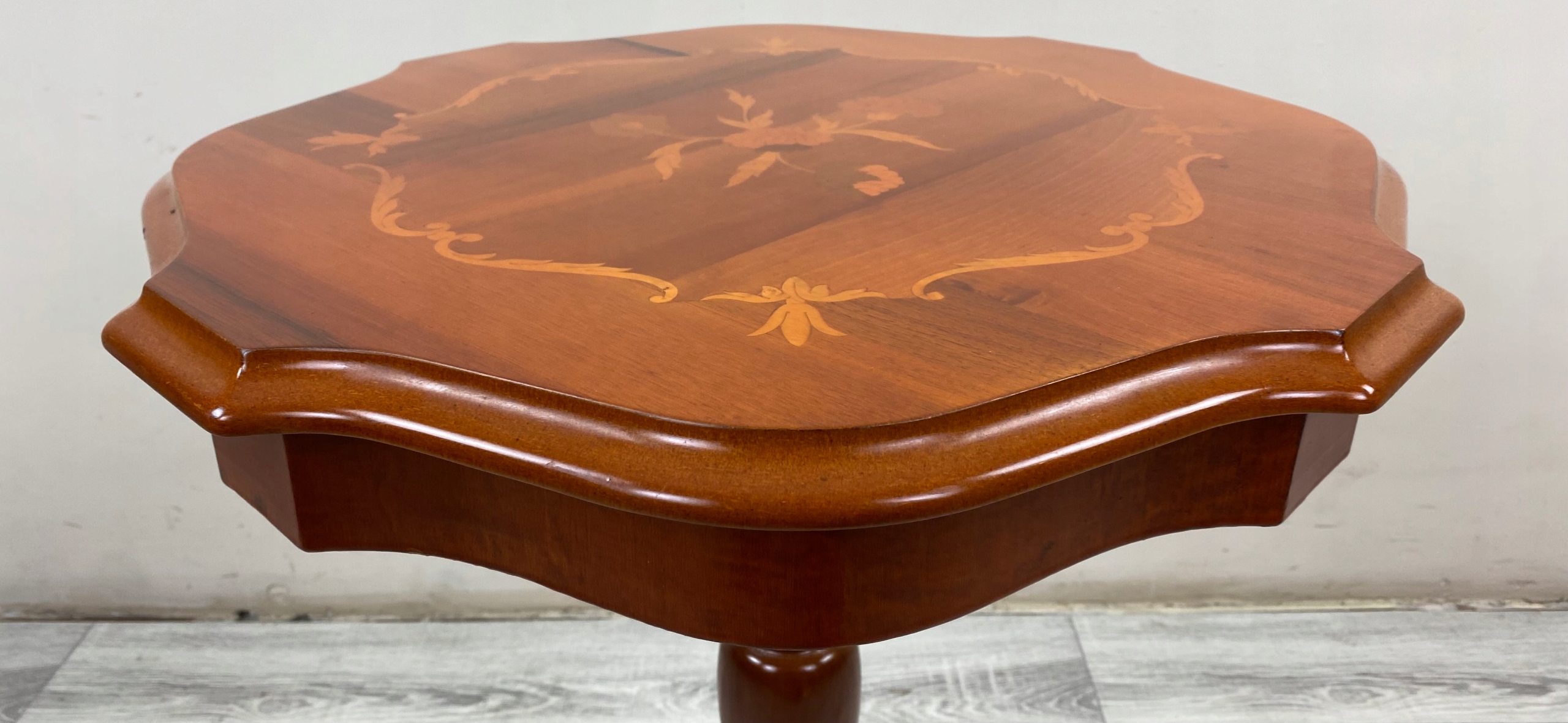 Стільниця має багатокутний, хвилястий контур, що надає всьому предмету легкості та декоративності. Його поверхня прикрашена тонкою рослинною інкрустацією - ніжні, симетричні квіткові мотиви зі світлого дерева чудово контрастують із теплим медово-коричневим відтінком шпону. Це елегантне, але не перебільшене оздоблення, характерне для меблів, призначених для прикраси вітальні, а не для показної пишноти.