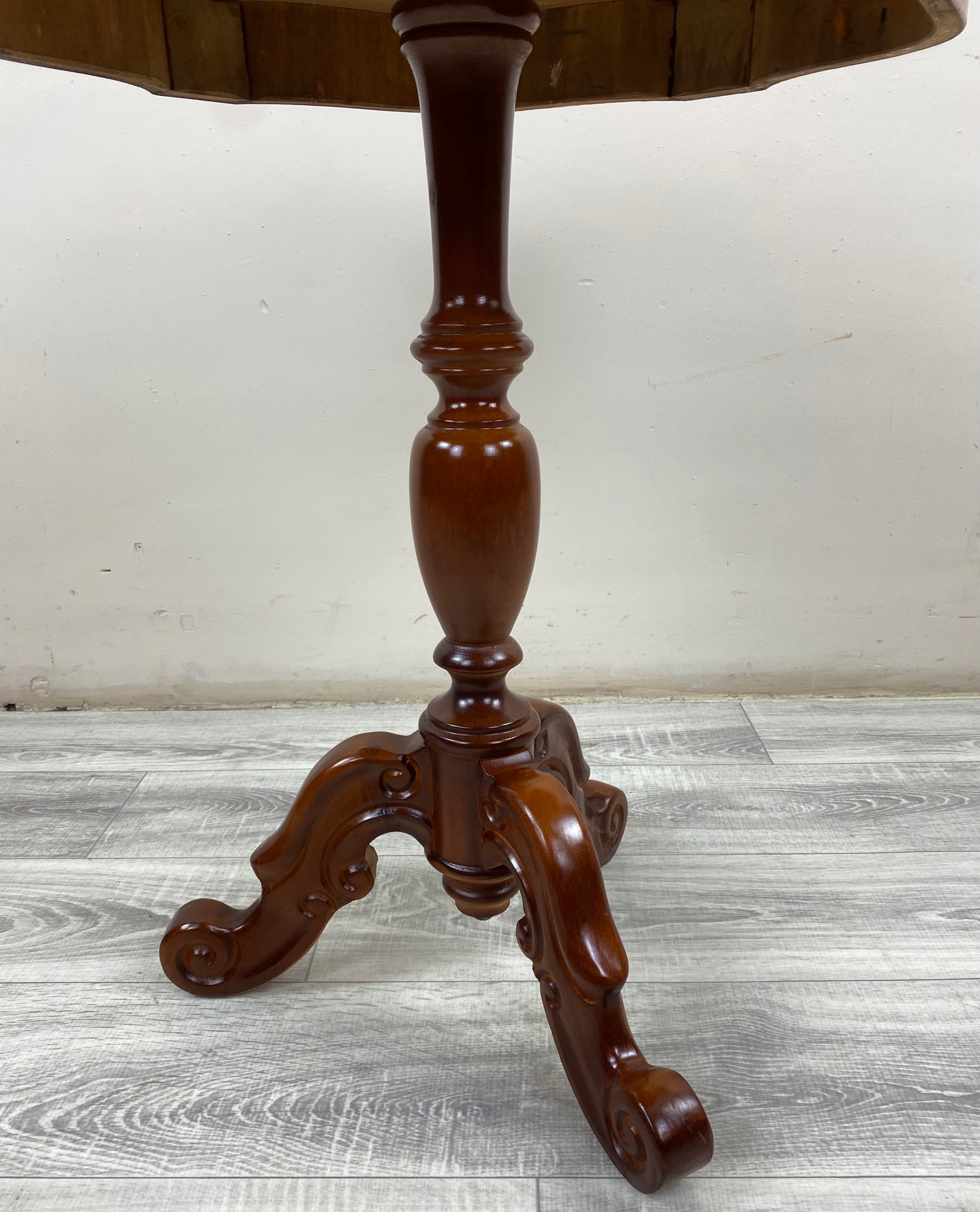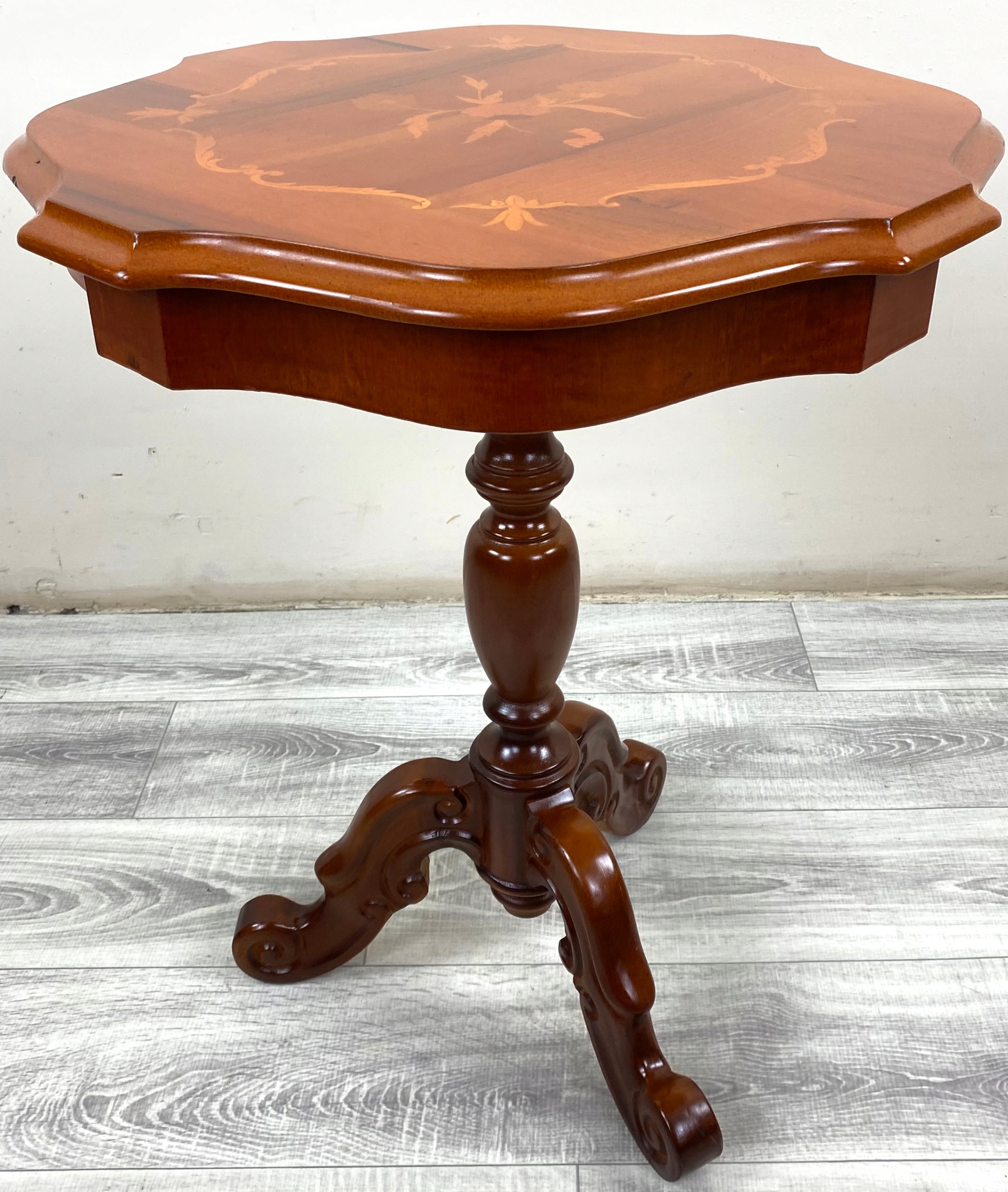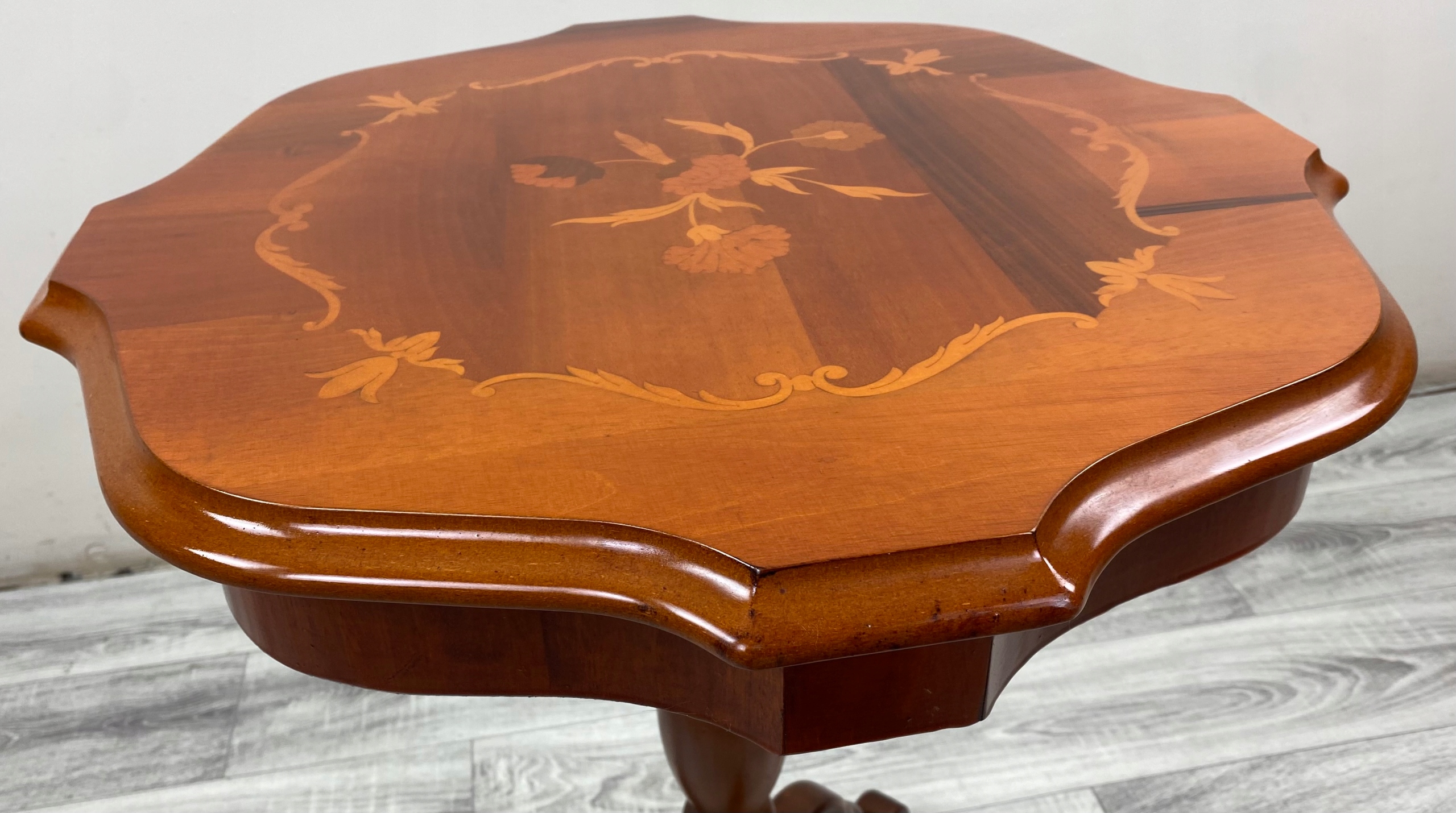 Стільниця має багатокутний, хвилястий контур, що надає всьому предмету легкості та декоративності. Його поверхня прикрашена тонкою рослинною інкрустацією - ніжні, симетричні квіткові мотиви зі світлого дерева чудово контрастують із теплим медово-коричневим відтінком шпону. Це елегантне, але не перебільшене оздоблення, характерне для меблів, призначених для прикраси вітальні, а не для показної пишноти.