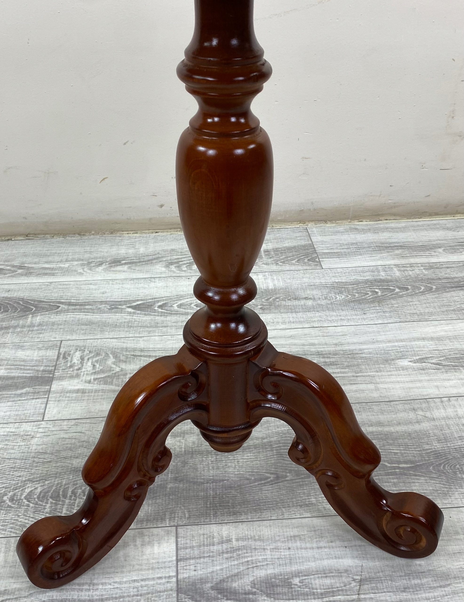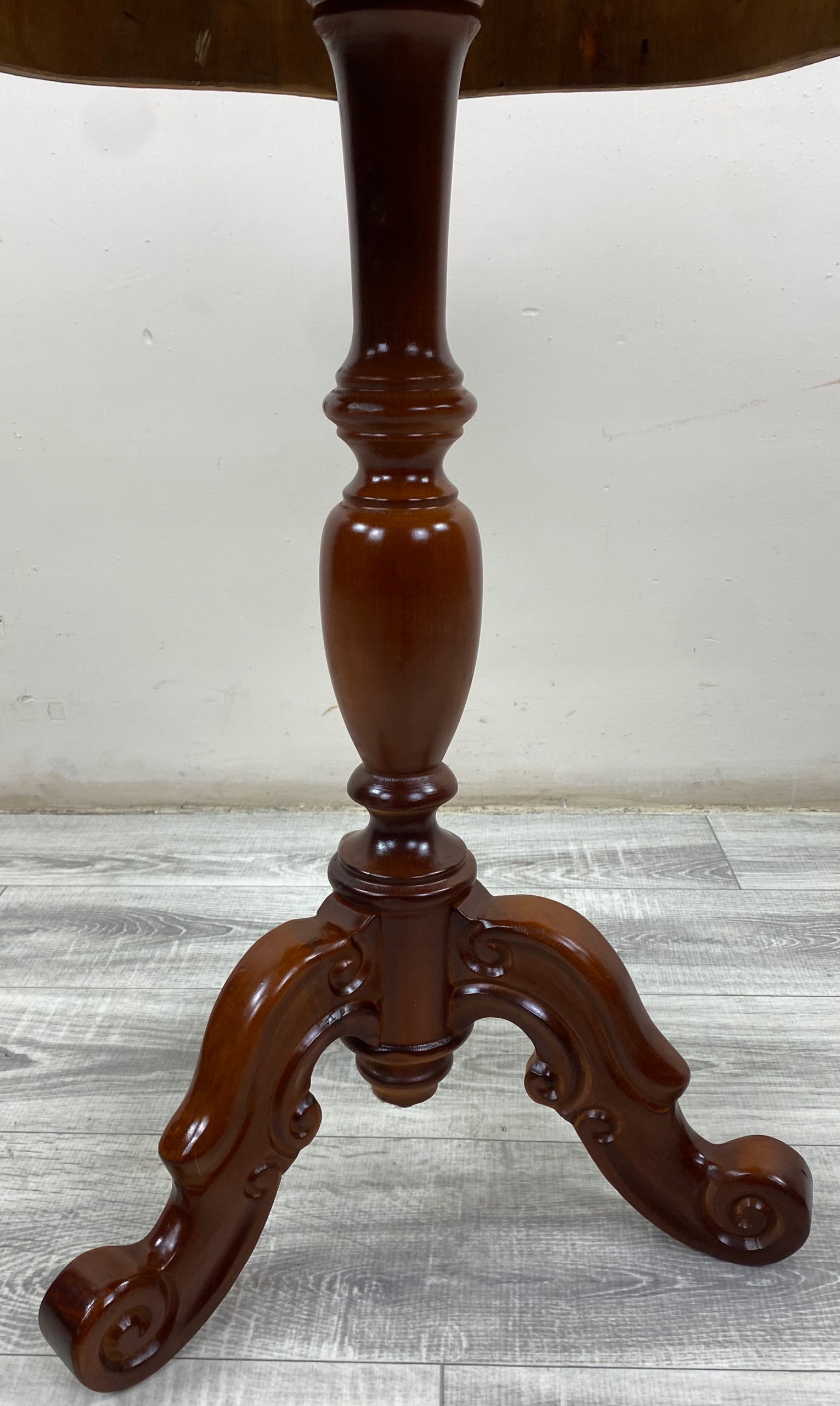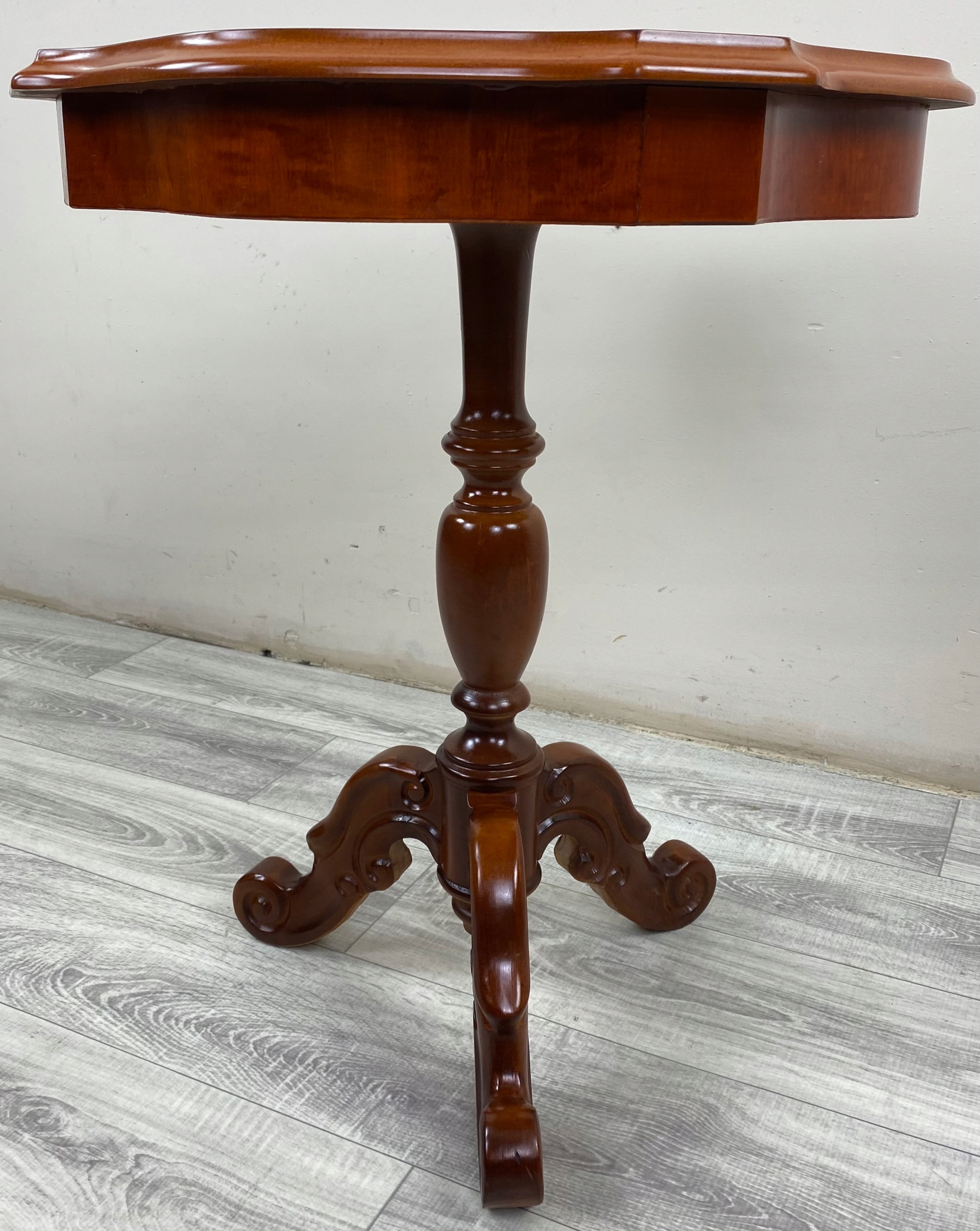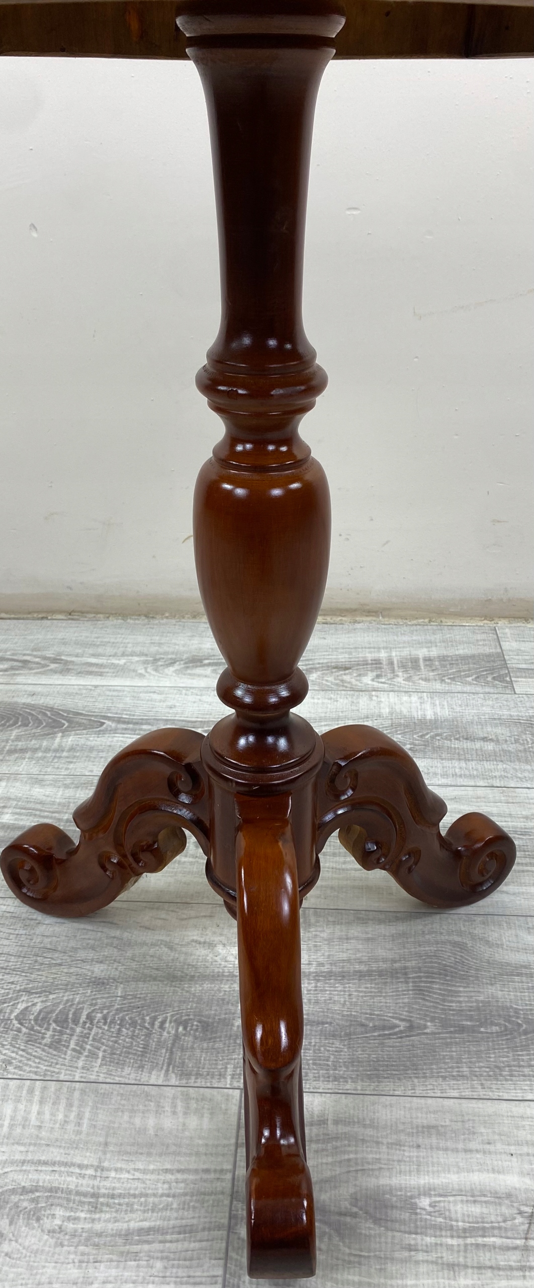 Стільниця має багатокутний, хвилястий контур, що надає всьому предмету легкості та декоративності. Його поверхня прикрашена тонкою рослинною інкрустацією - ніжні, симетричні квіткові мотиви зі світлого дерева чудово контрастують із теплим медово-коричневим відтінком шпону. Це елегантне, але не перебільшене оздоблення, характерне для меблів, призначених для прикраси вітальні, а не для показної пишноти.