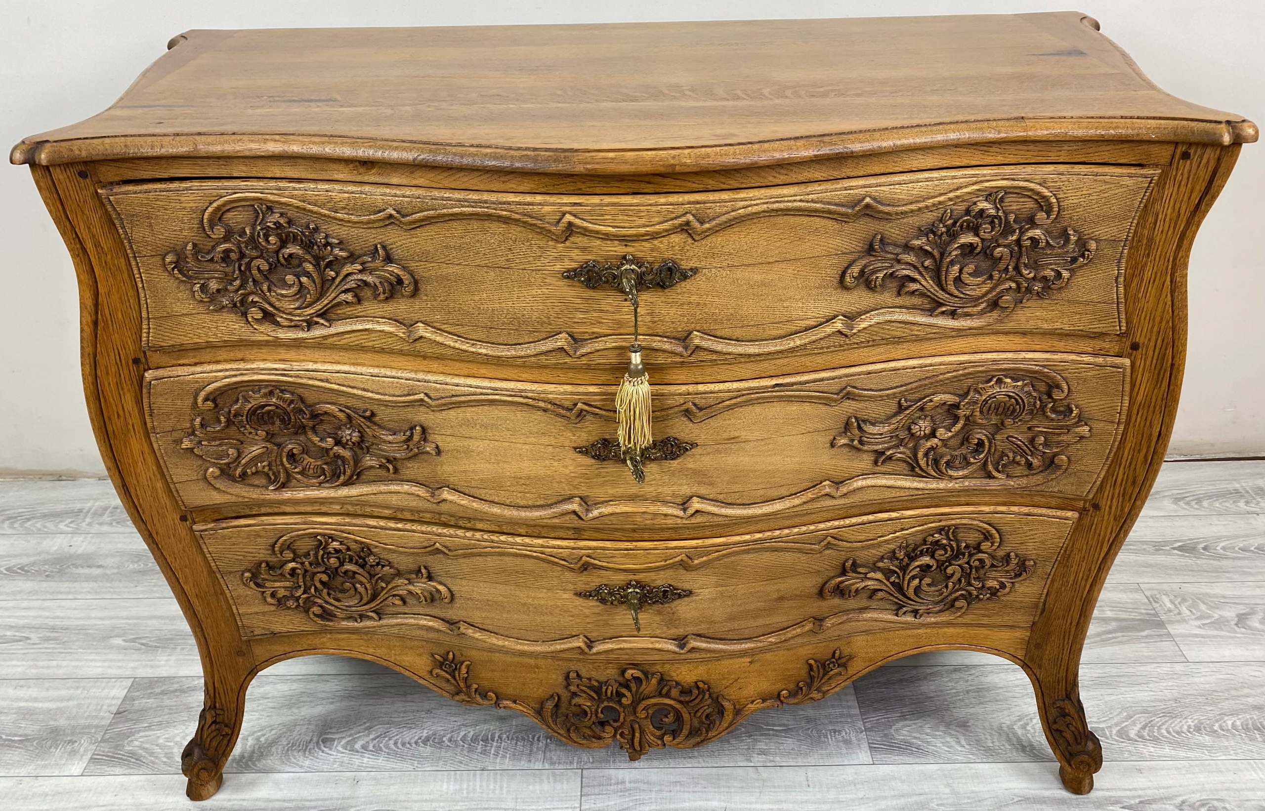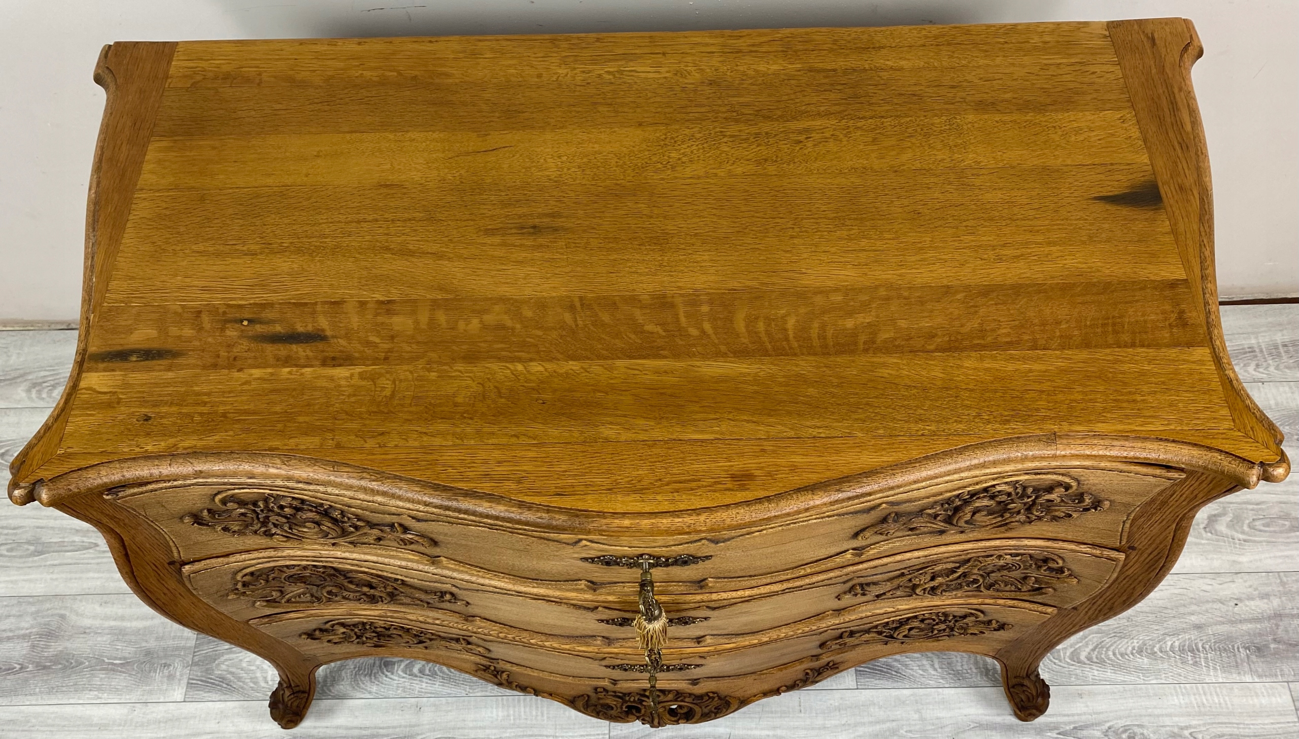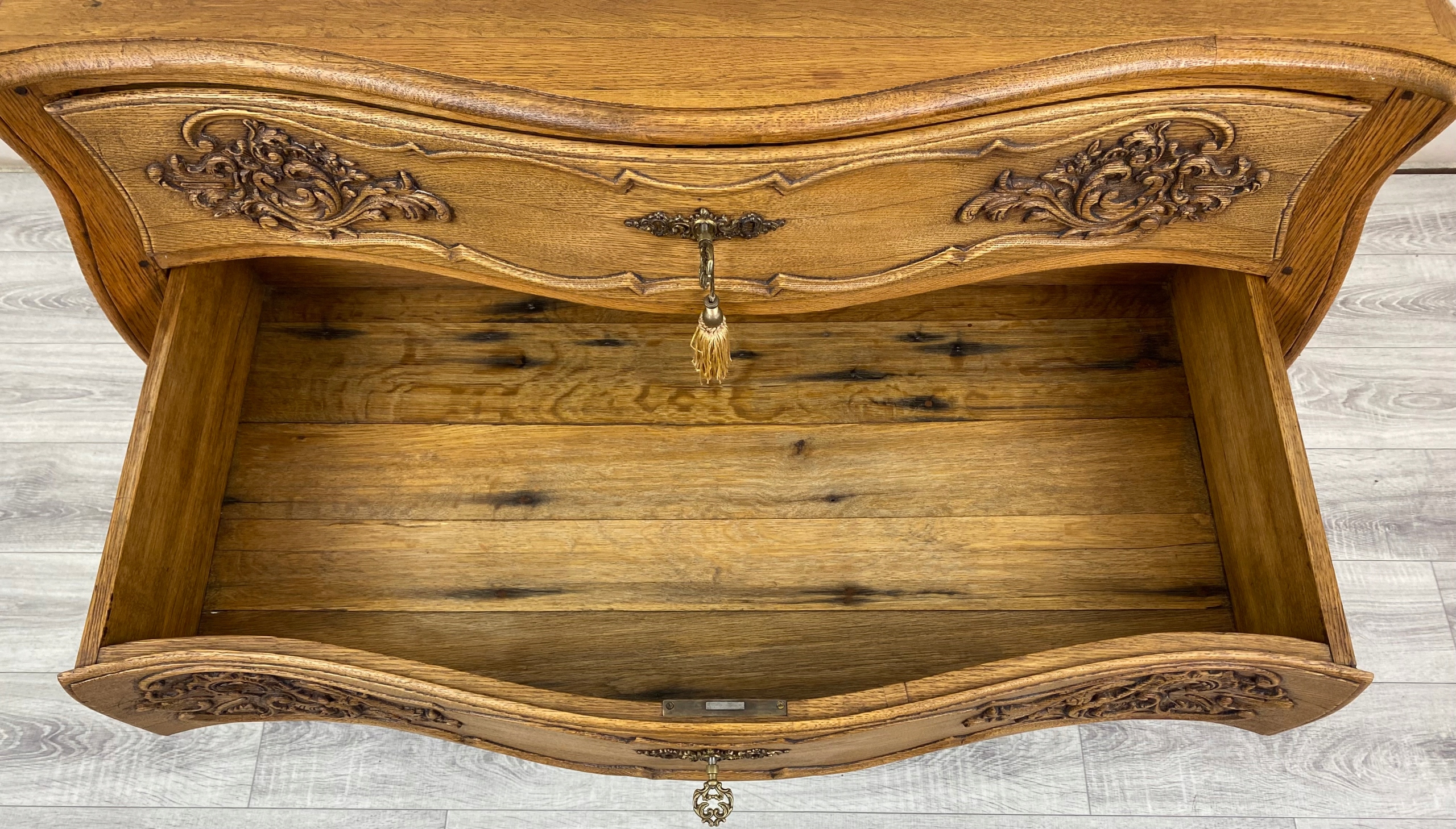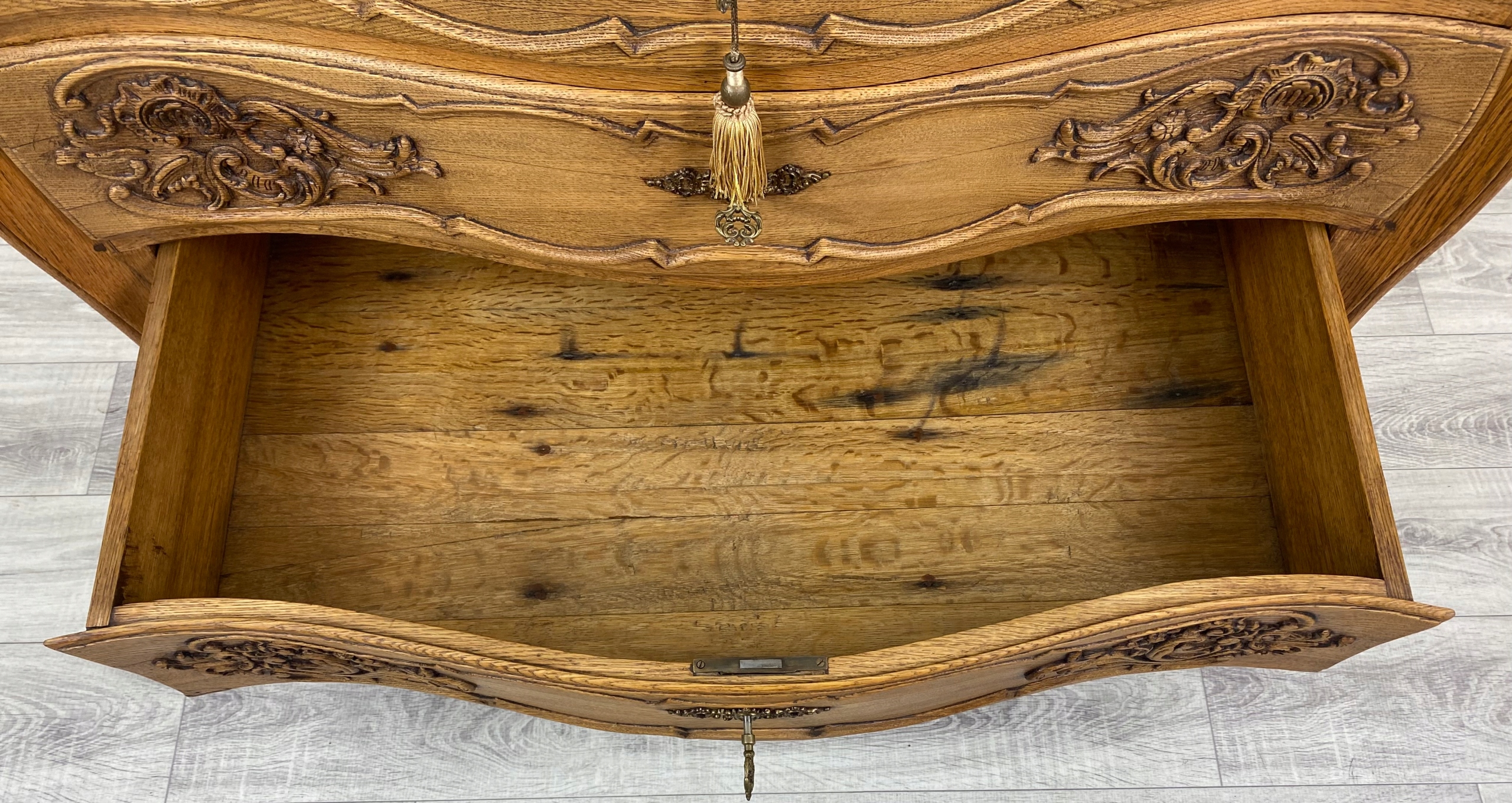 Весь комод має чітко вигнуту, пишну форму - сторони та передня частина хвилясті, що характерно для меблів у стилі рококо.