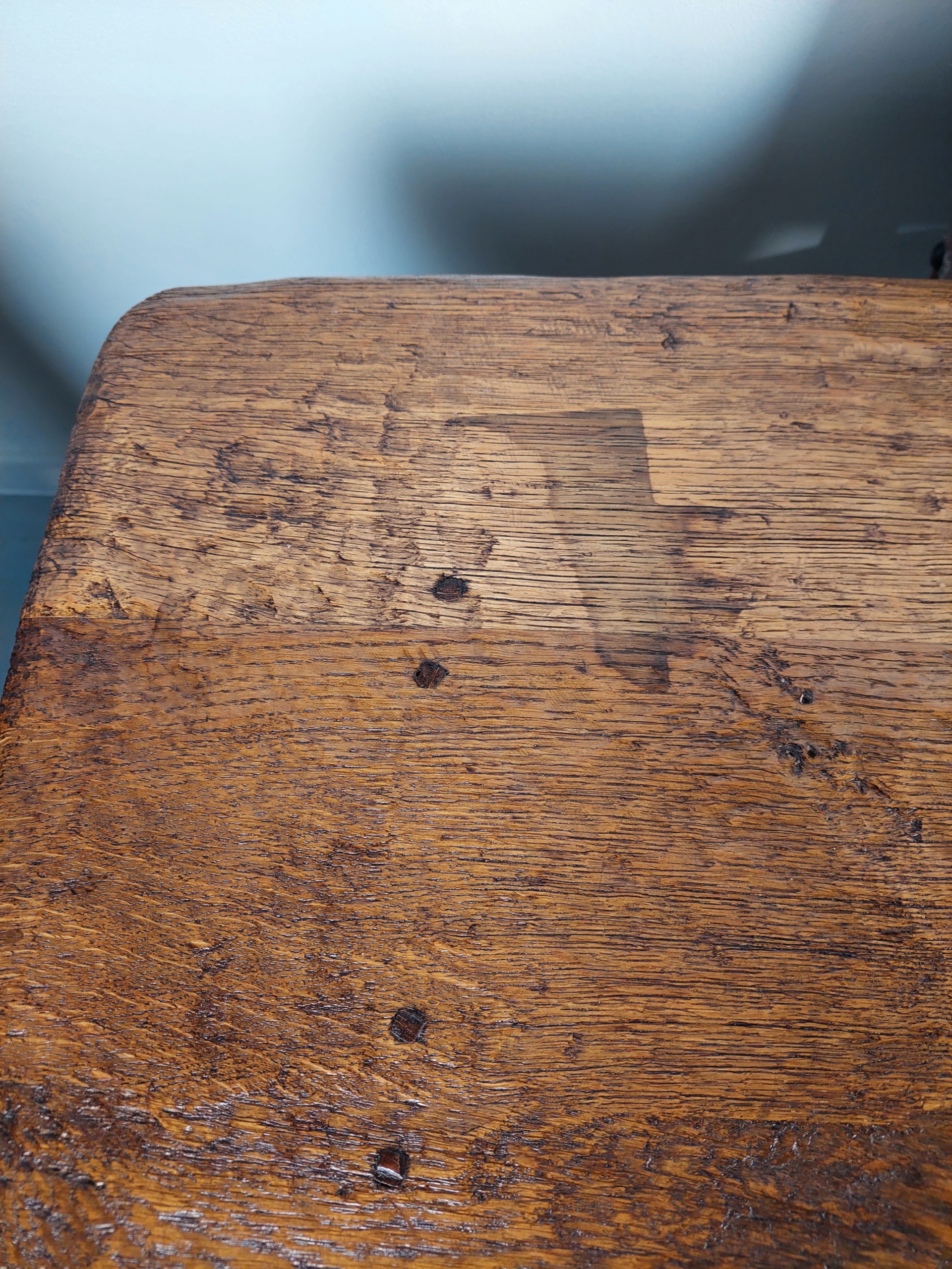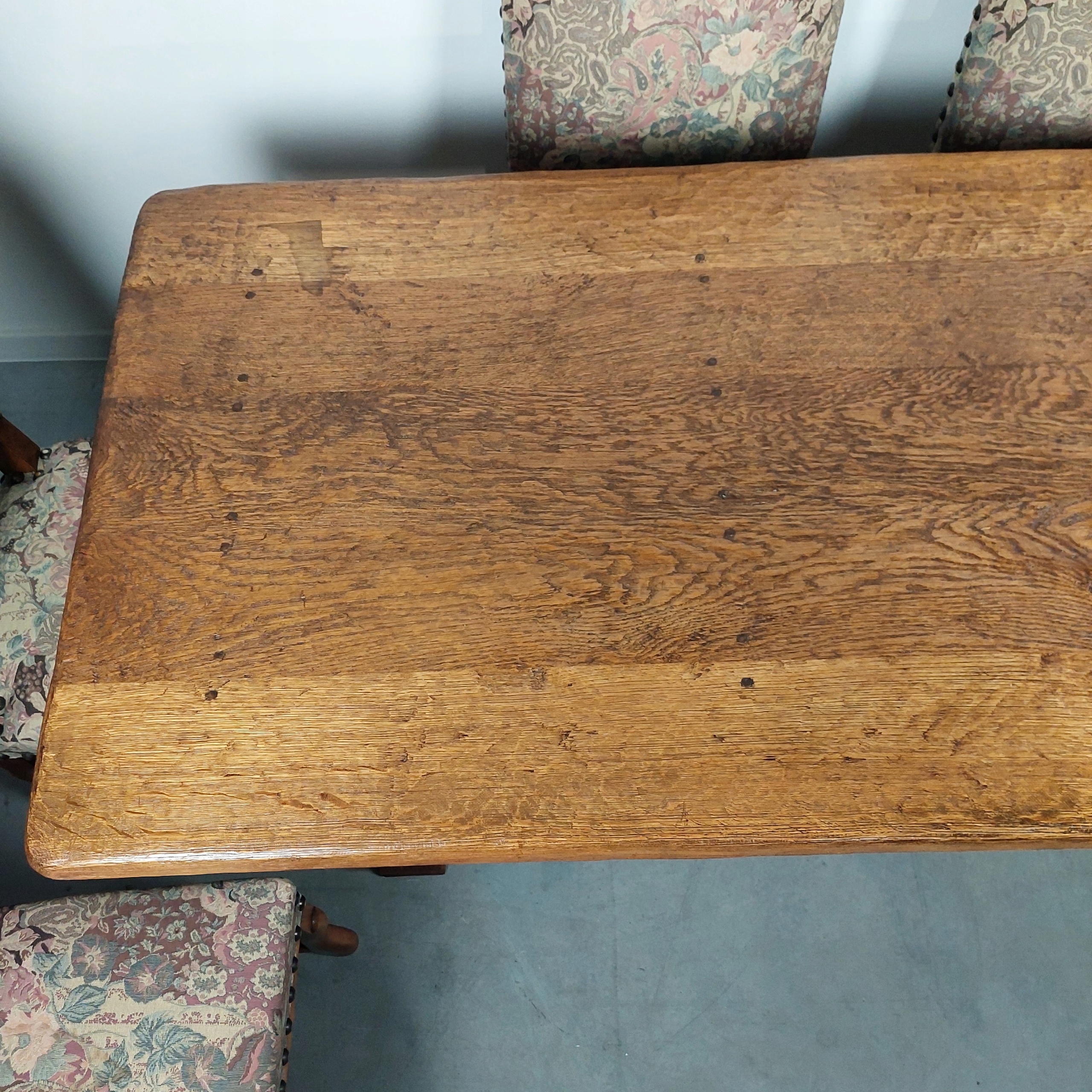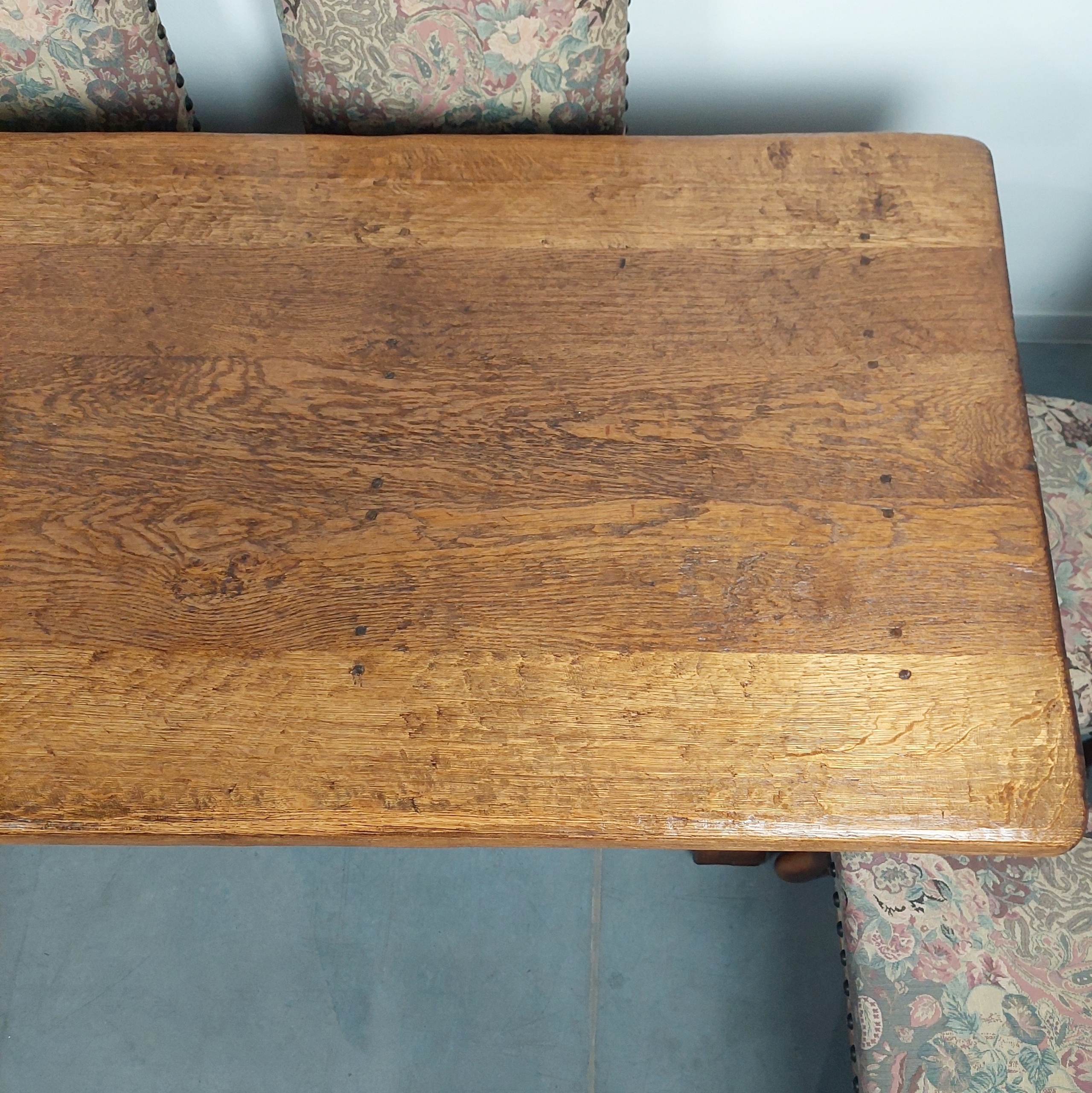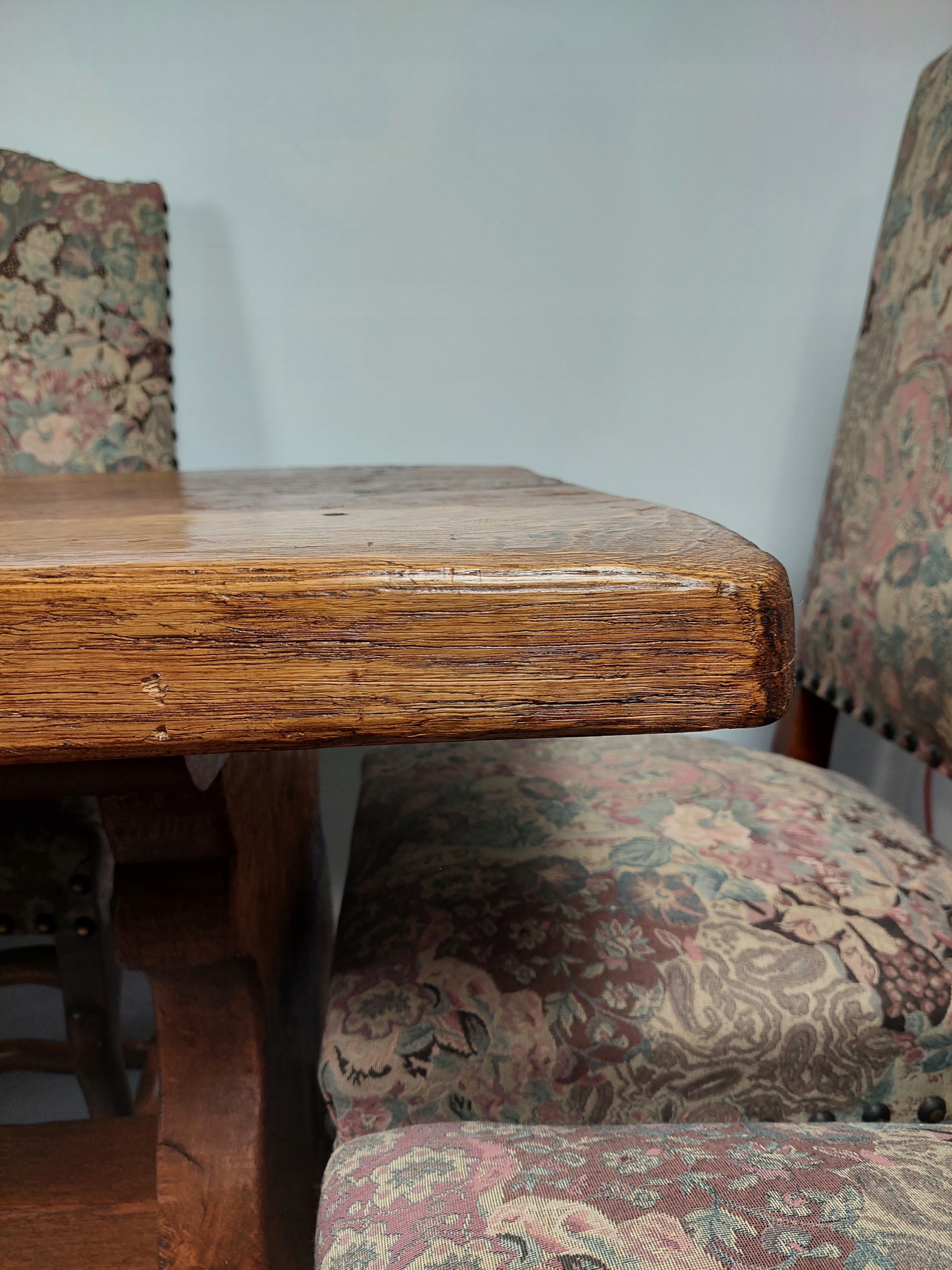 Стильний дубовий лицарський стіл з шістьма м'якими стільцями. Стіл виготовлений з тесаного масиву дуба (товщина стільниці до 5,5 см). Типові подряпини від зносу та природне висихання верху та ніжок. Стіл дуже міцний, масивний і стійкий. Меблева конструкція закріплена шипами та гвинтами. Стільці не вимагають жодного догляду, вони жорсткі та в дуже хорошому стані, лише одне потребує оновлення (майже непомітне місце). Подробиці на фото нижче. Ціна вказана за стіл в комплекті з 6 стільців.