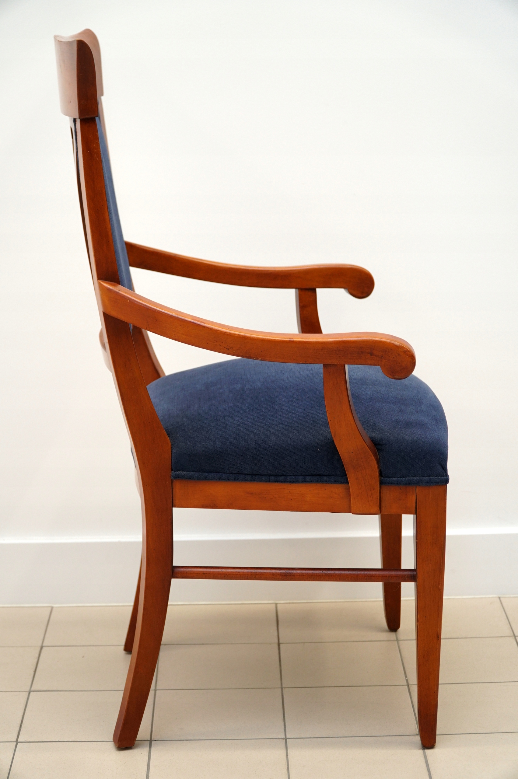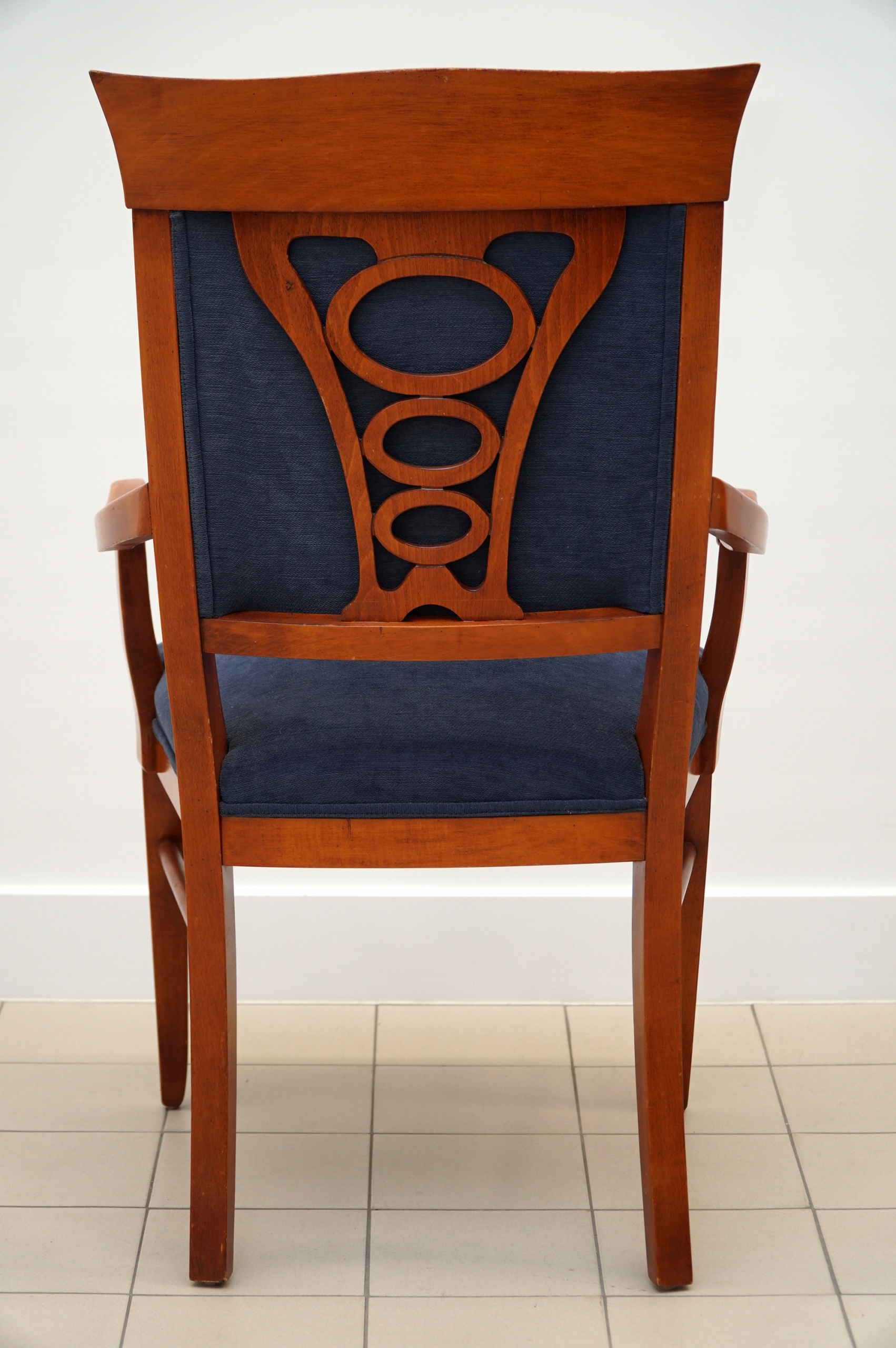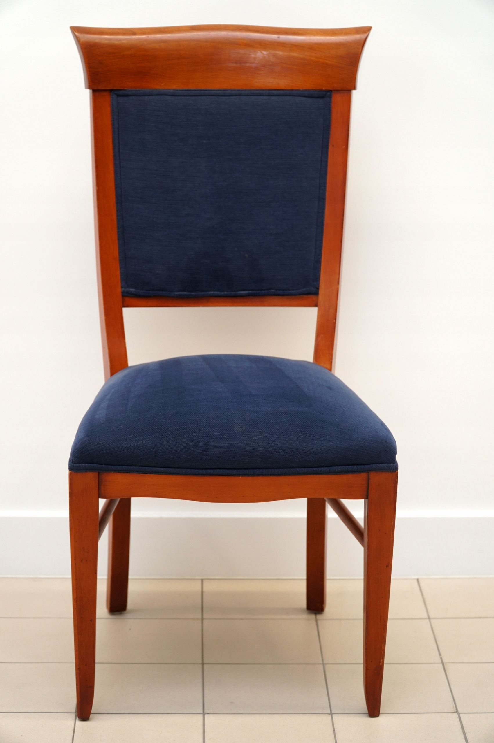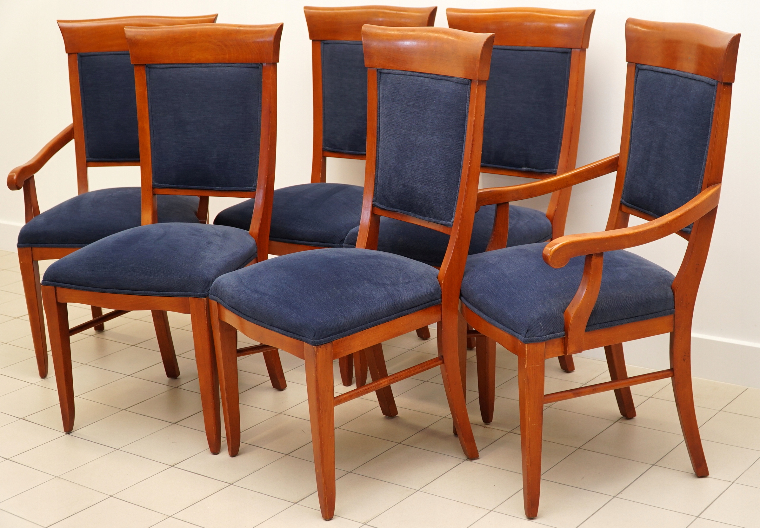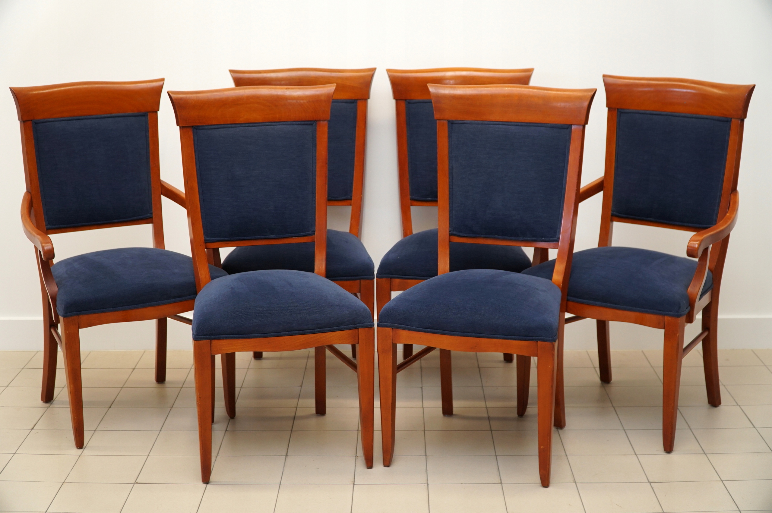 Стильний комплект, що складається зі столу, чотирьох стільців і двох м'яких крісел. Зроблено у вишні. Походження: Західна Європа, приблизно 30 років.