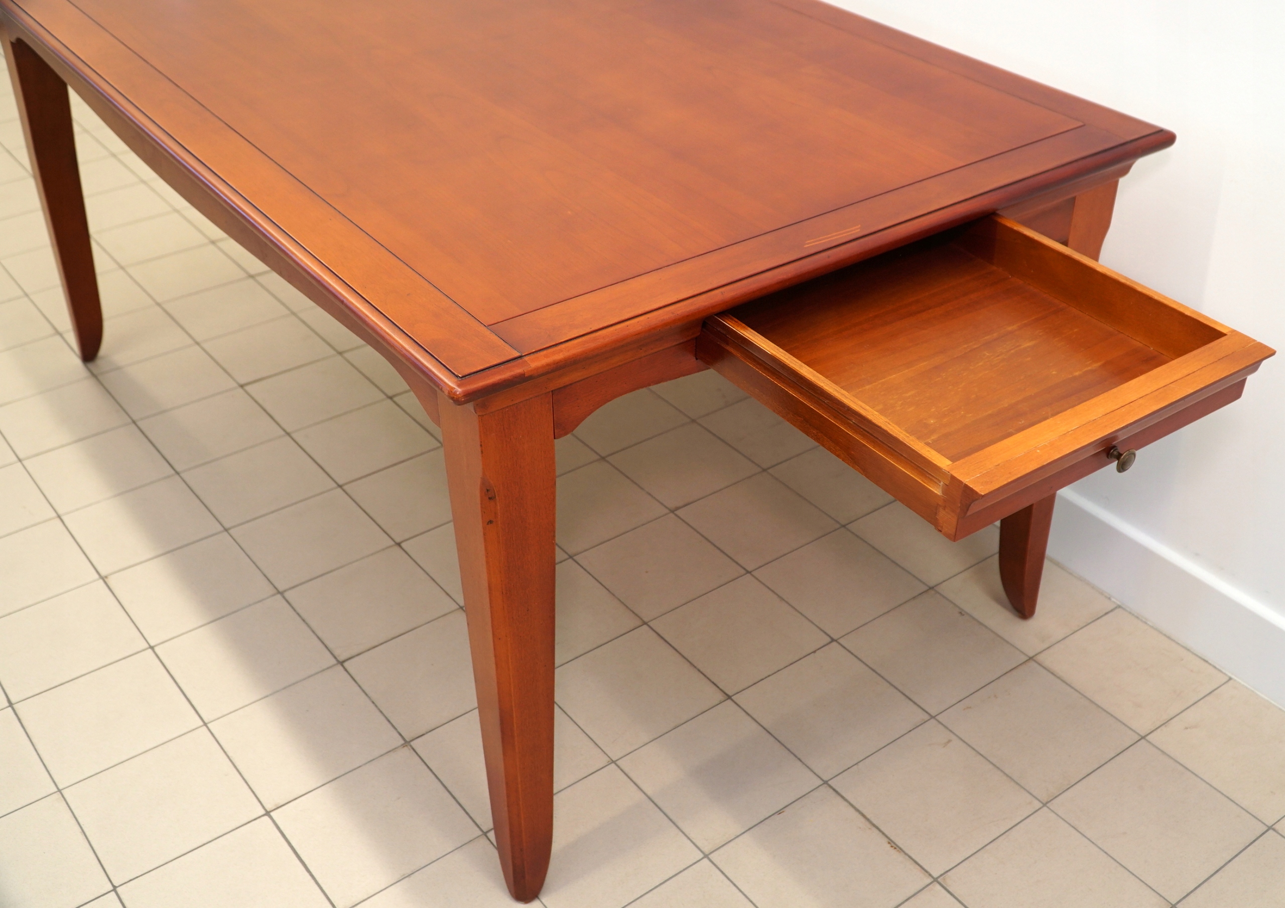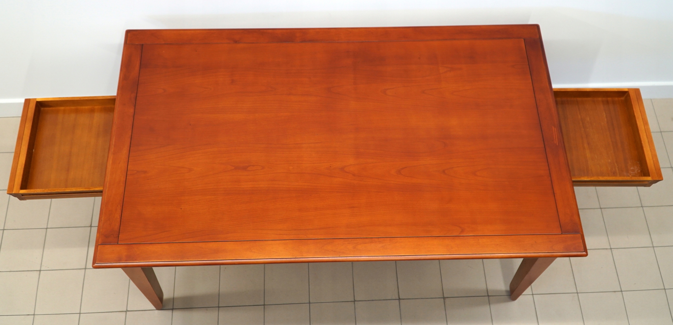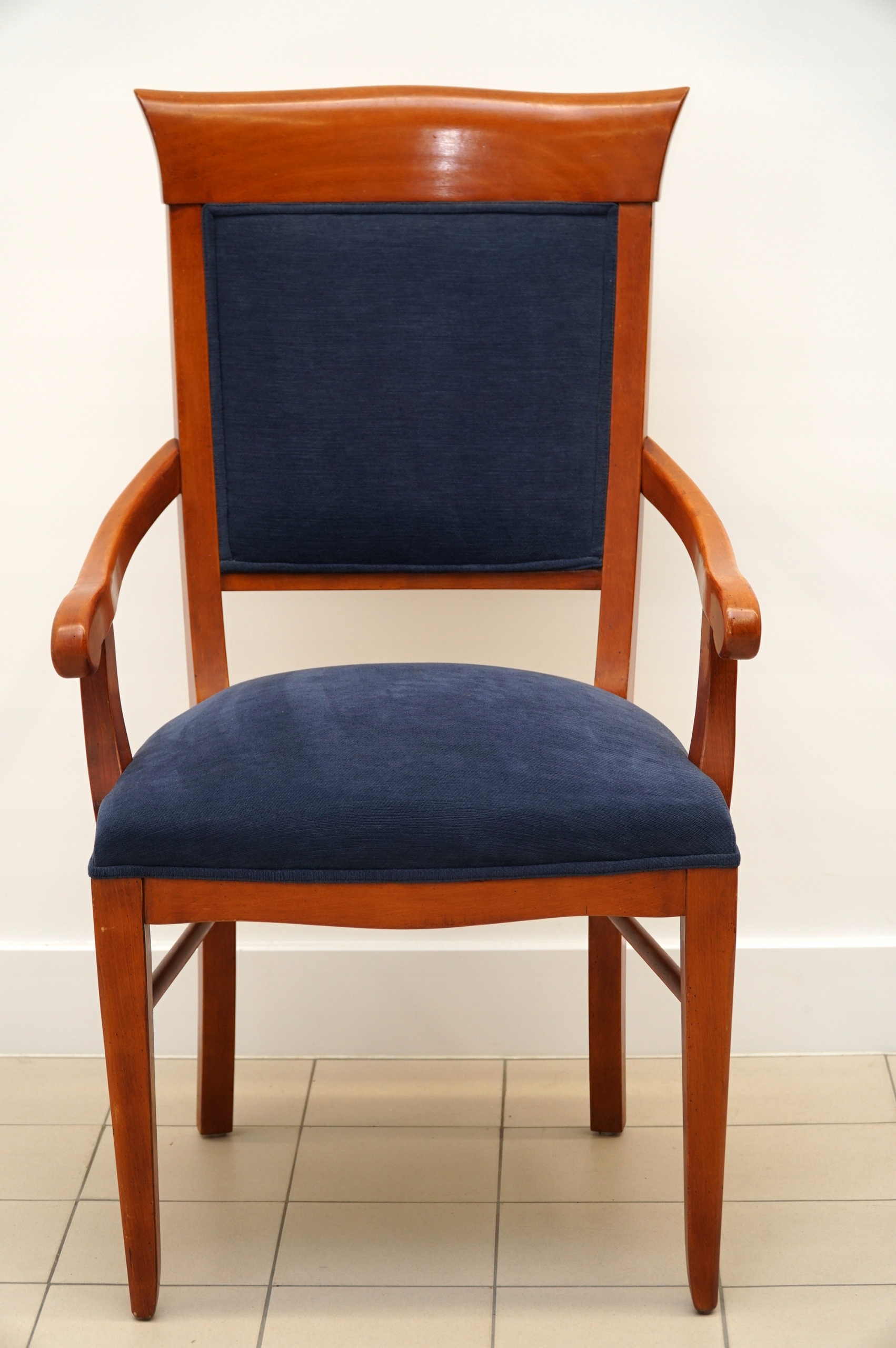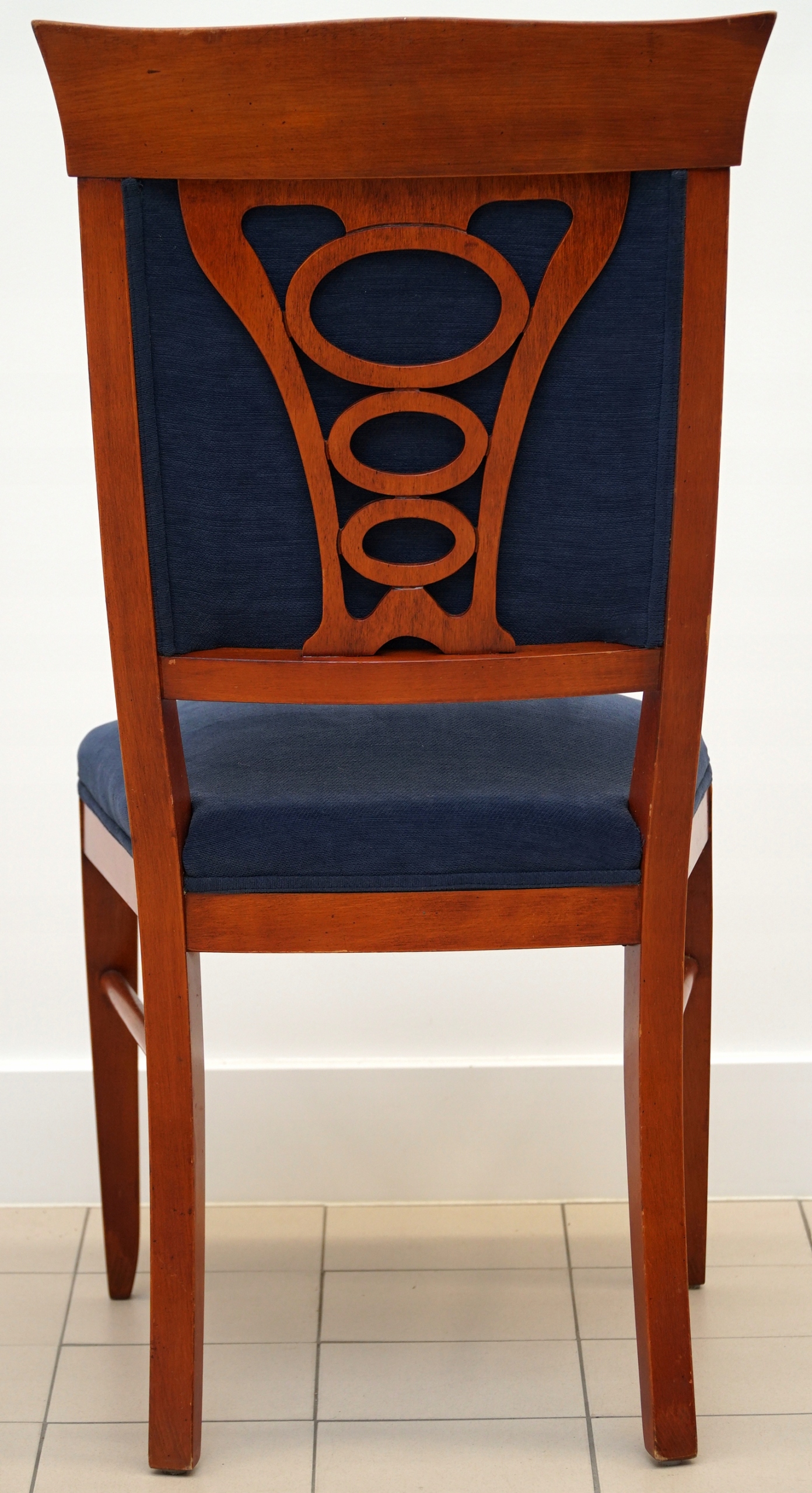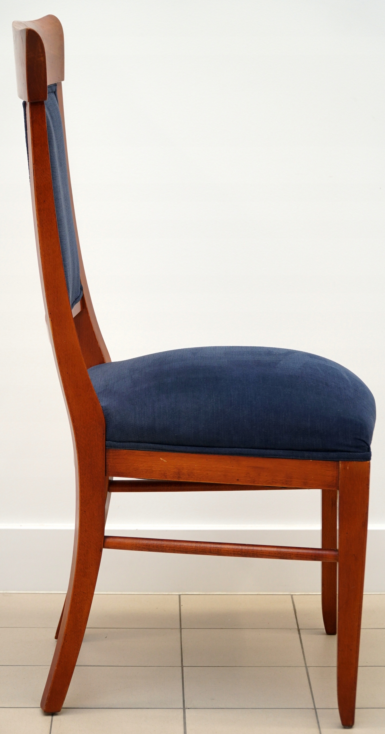 Стильний комплект, що складається зі столу, чотирьох стільців і двох м'яких крісел. Зроблено у вишні. Походження: Західна Європа, приблизно 30 років.