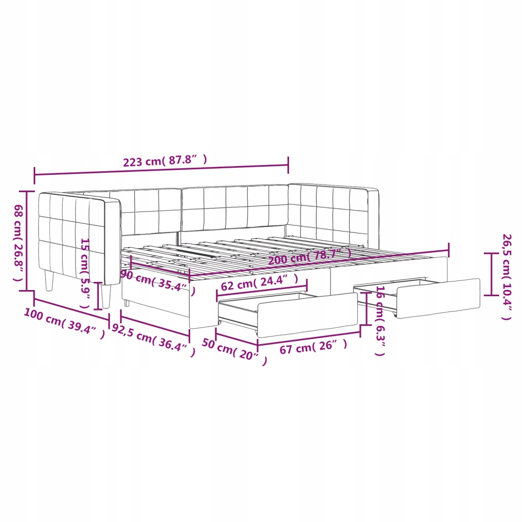 Цей складаний предмет меблів 2-в-1, який одночасно виконує функції ліжка та дивана, стане практичним і привабливим доповненням до вашої вітальні чи спальні. Універсальне денне ліжко: кушетка функціонує як диван вдень і легко перетворюється на ліжко вночі, забезпечуючи комфортне рішення для розміщення гостей і максимального використання простору. Достатній простір для зберігання: це гостьове ліжко містить два ящики на коліщатках, які забезпечують багато місця для зберігання одягу, шкарпеток, іграшок, подушок тощо. М’який оксамит і міцна конструкція: кушетка має міцний каркас із дерева та металу та приємно оббитий оксамитом. Сучасний дизайн: диван зі спальною функцією представляє сучасний дизайн, який характеризується простими лініями та мінімалістичним виглядом, завдяки чому він внесе нотку сучасного стилю у ваш інтер'єр. Корисно знати: матрац не входить у комплект. Пропонуємо широкий вибір матраців. Ви можете знайти відповідний матрац на нашому веб-сайті.
