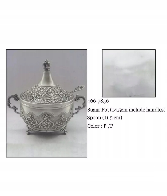 Високоякісний продукт - срібна цукорниця. Виготовлена з плакованого металу оброблений у високому глянці. Він привертає увагу своїм інтенсивним блиском і унікальним дизайном. Цукорниця створена за зразком старовинних цукорниць і має красиві опуклі прикраси, які видно на зовнішній стороні корпусу. Делікатно декоровані ручки з боків. Кришка має стриманий декор, верхня частина з ніжним малюнком і ручкою. Всередині є скляна вставка для цукру - ви зможете легко підтримувати ємність в чистоті. У набір входить ложка. Виріб надзвичайно декоративний і водночас функціональний. Варто мати його вдома. Про це варто пам’ятати, якщо ви шукаєте ідею для цікавого подарунка.