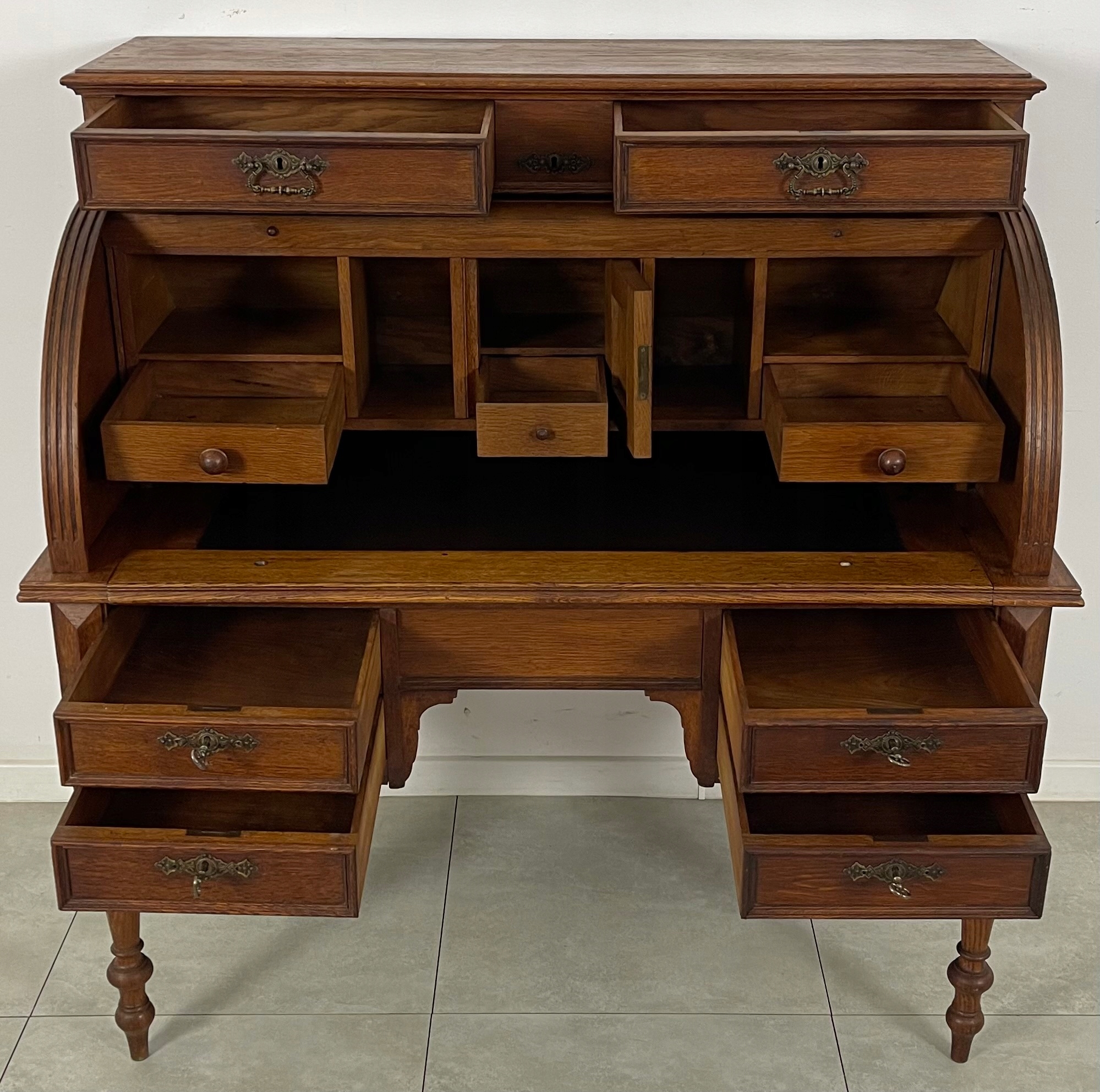 Інтер'єр, прихований за рулонною шторою, пропонує численні невеликі ящики та відділення, центральне відділення, що замикається, висувну стільницю та простір для документів у нижній частині.