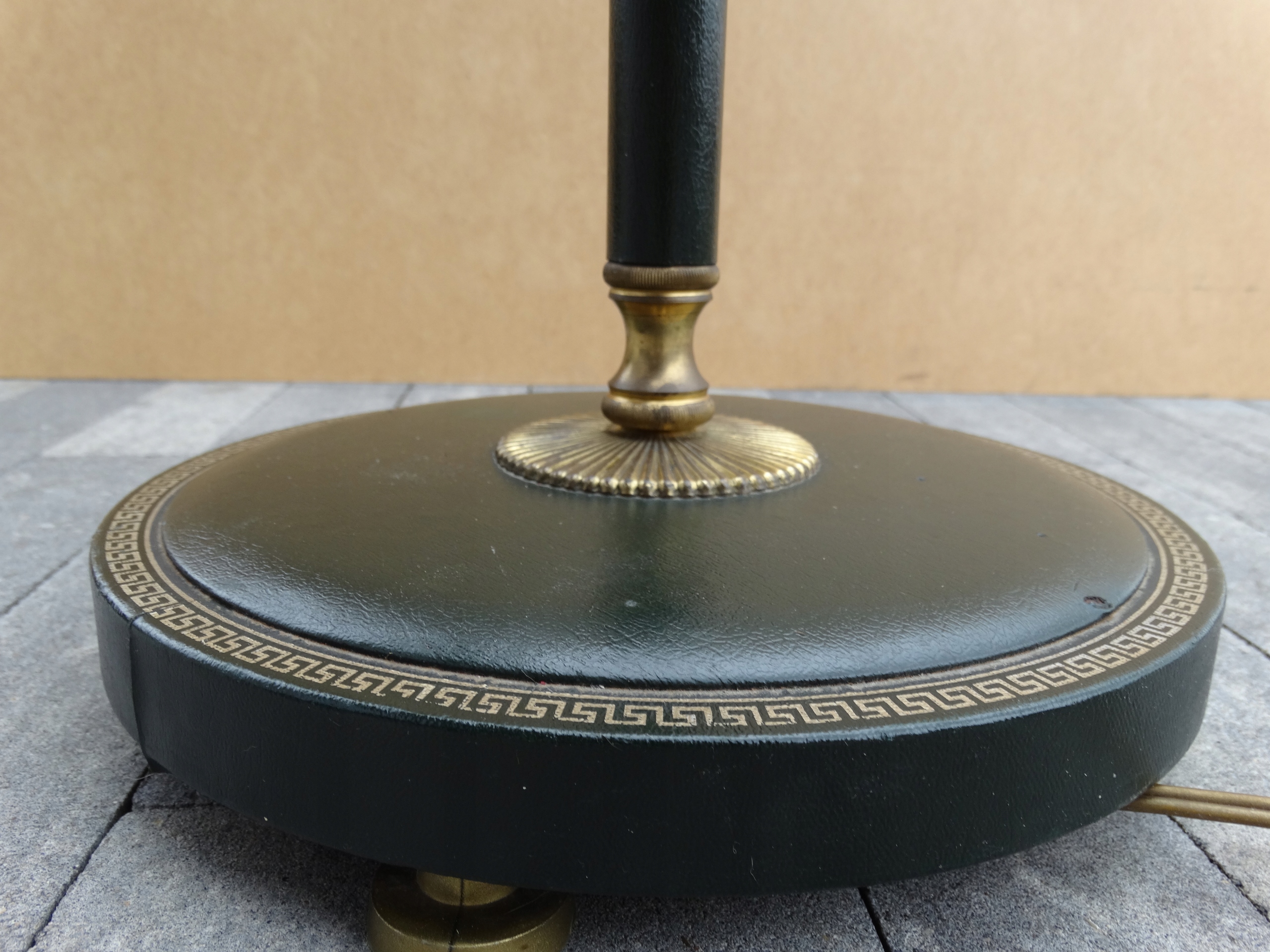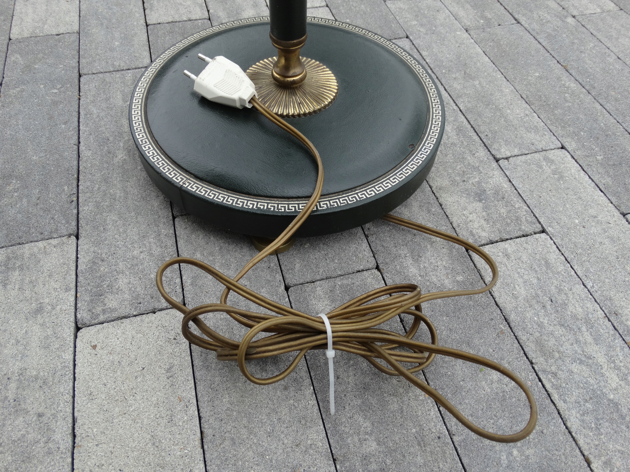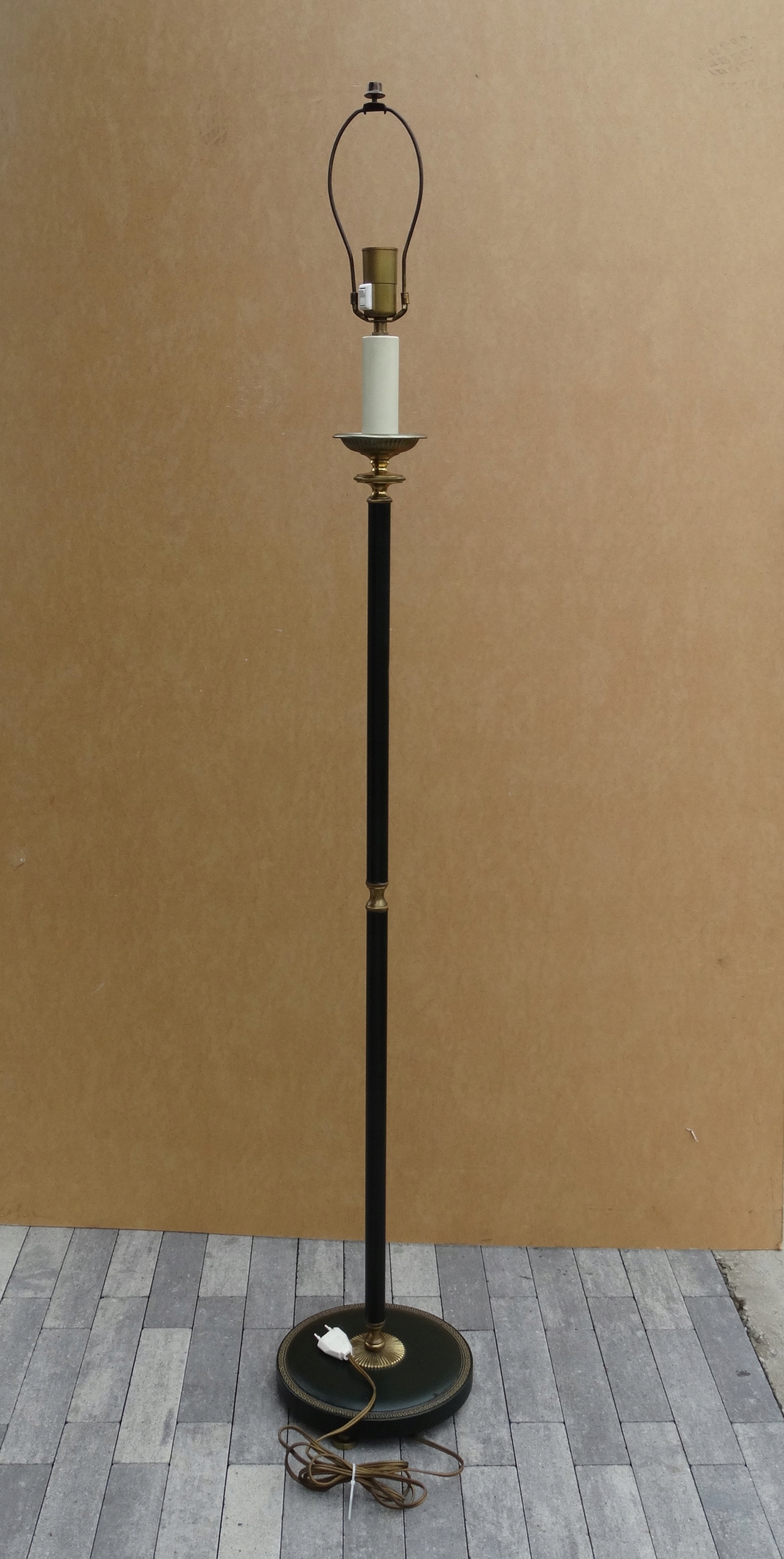 Стильний торшер, обтягнутий зеленою шкірою з латунними аксесуарами.