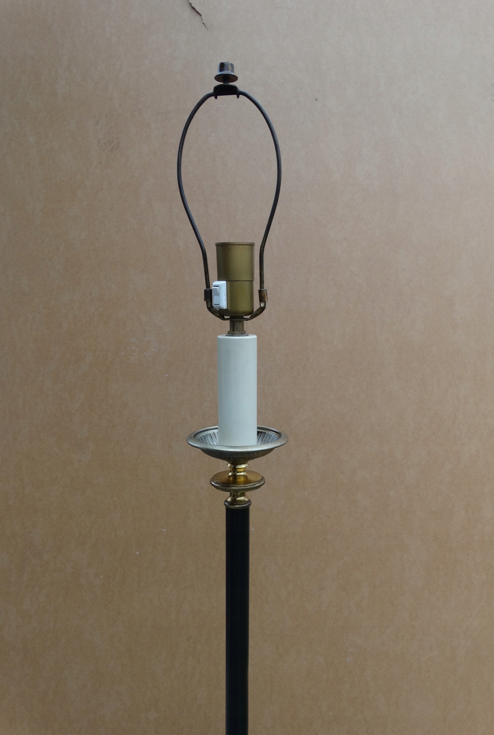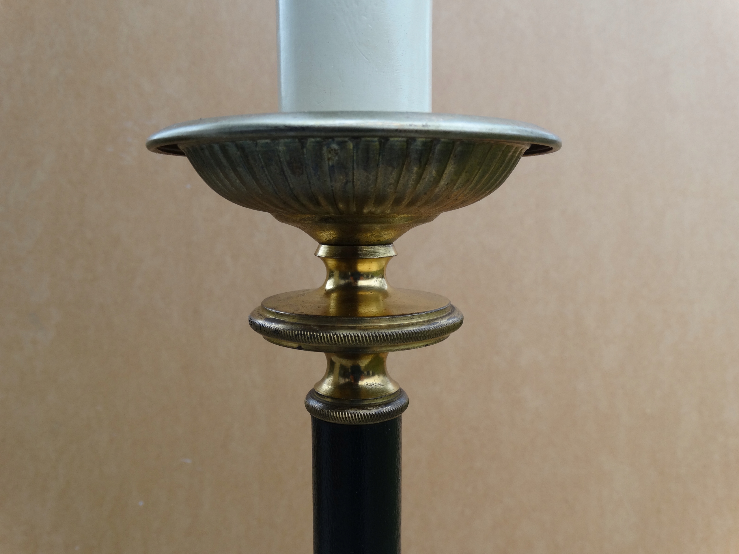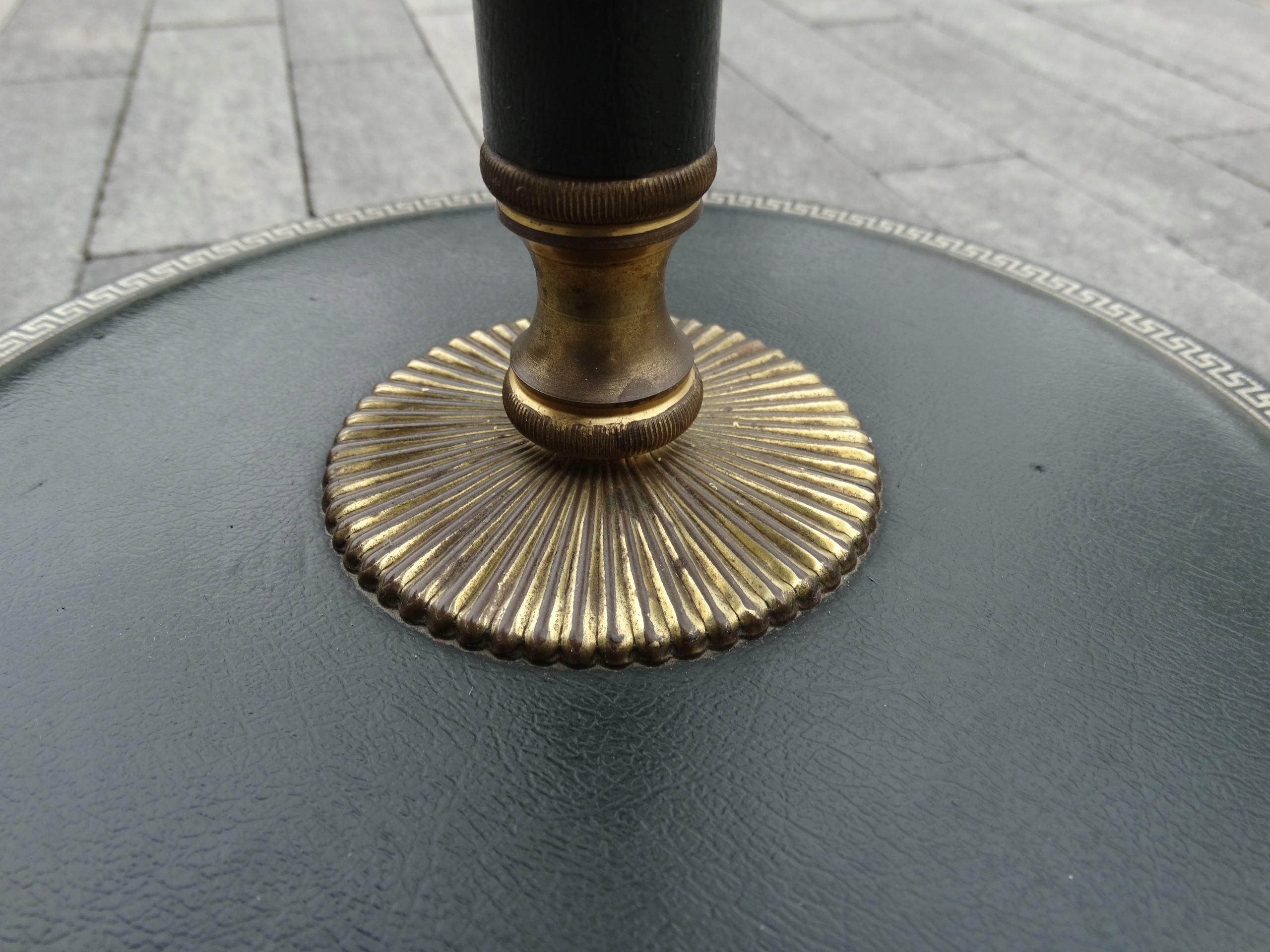 Стильний торшер, обтягнутий зеленою шкірою з латунними аксесуарами.