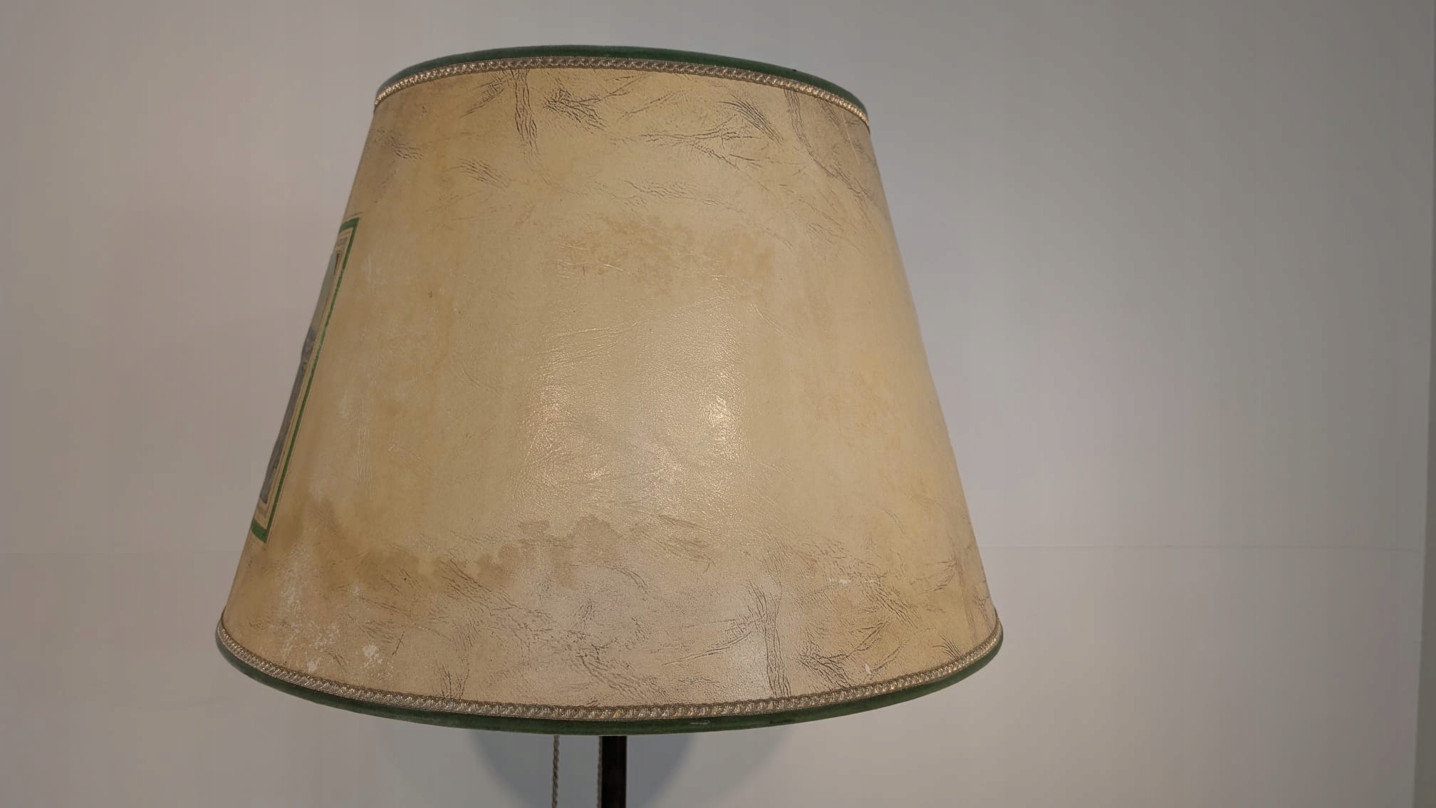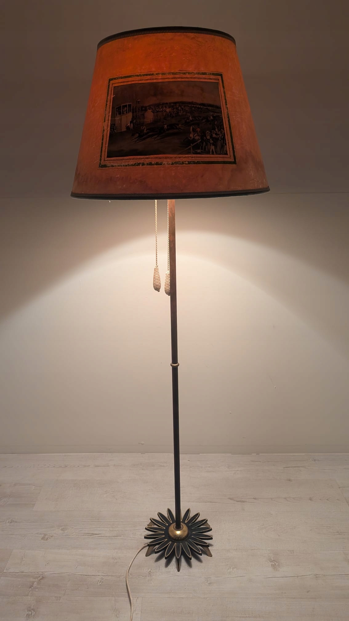 Стильний вінтажний латунний торшер 1950-х або 1960-х років. Абажур прикрашений унікальною графікою із зображенням сцени з минулого. Лампа в хорошому стані та готова до використання у вашому домі, створюючи унікальну атмосферу.
