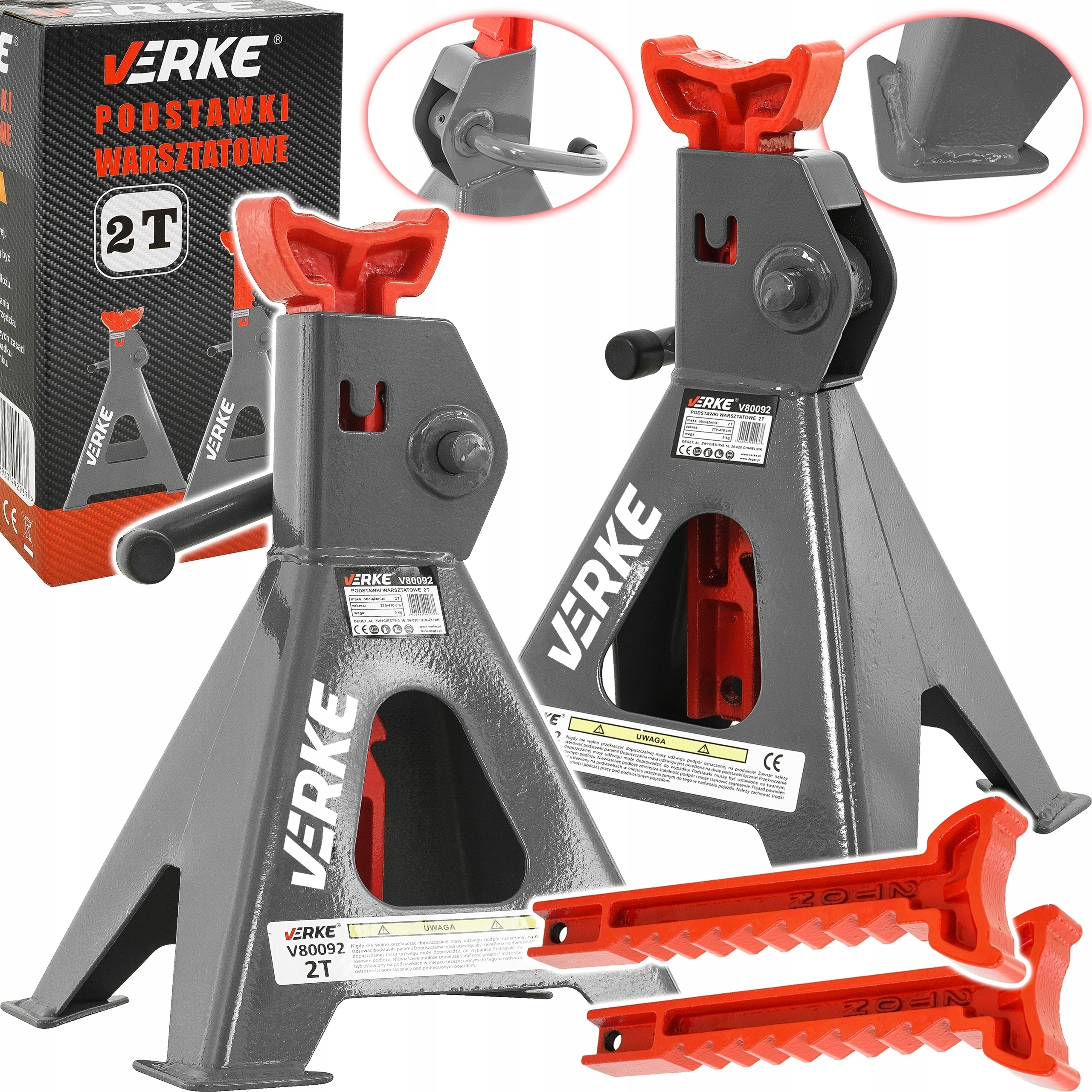 Професійний автомобіль 2Т стоїть біля Verke. Стійки виготовлені з товстих сталевих профілів і мають простий у використанні фіксатор висоти. Додатковою перевагою цих підставок є ніжка з широкою лапкою, завдяки чому підставки не вриваються в землю під тиском опорного предмета. Це захищає основу від пошкоджень і підвищує стійкість опор. Їх міцна і міцна конструкція забезпечує ефективне і тривале використання. Особливо призначений для професійних автомобільних майстерень, але його також можна використовувати в домашніх гаражах. Ідеальні інструменти для механіків і всіх автомобілістів.