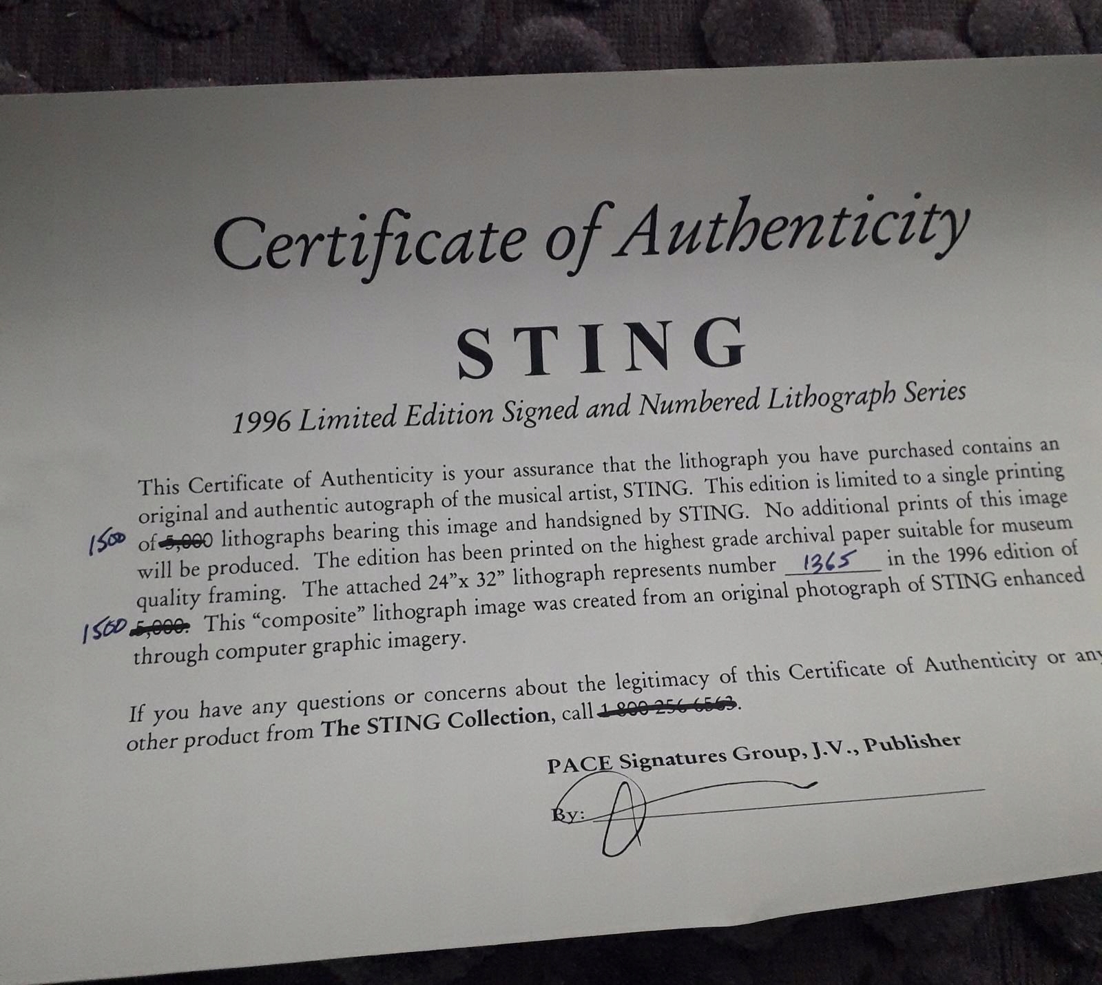 STING - велика літографія з рукописним автографом легенди + СЕРТИФІКАТ. Ідеально підходить для демонстрації в рамці для вашої власної колекції або як унікальний подарунок для близької людини. Він має сертифікат автентичності COA.