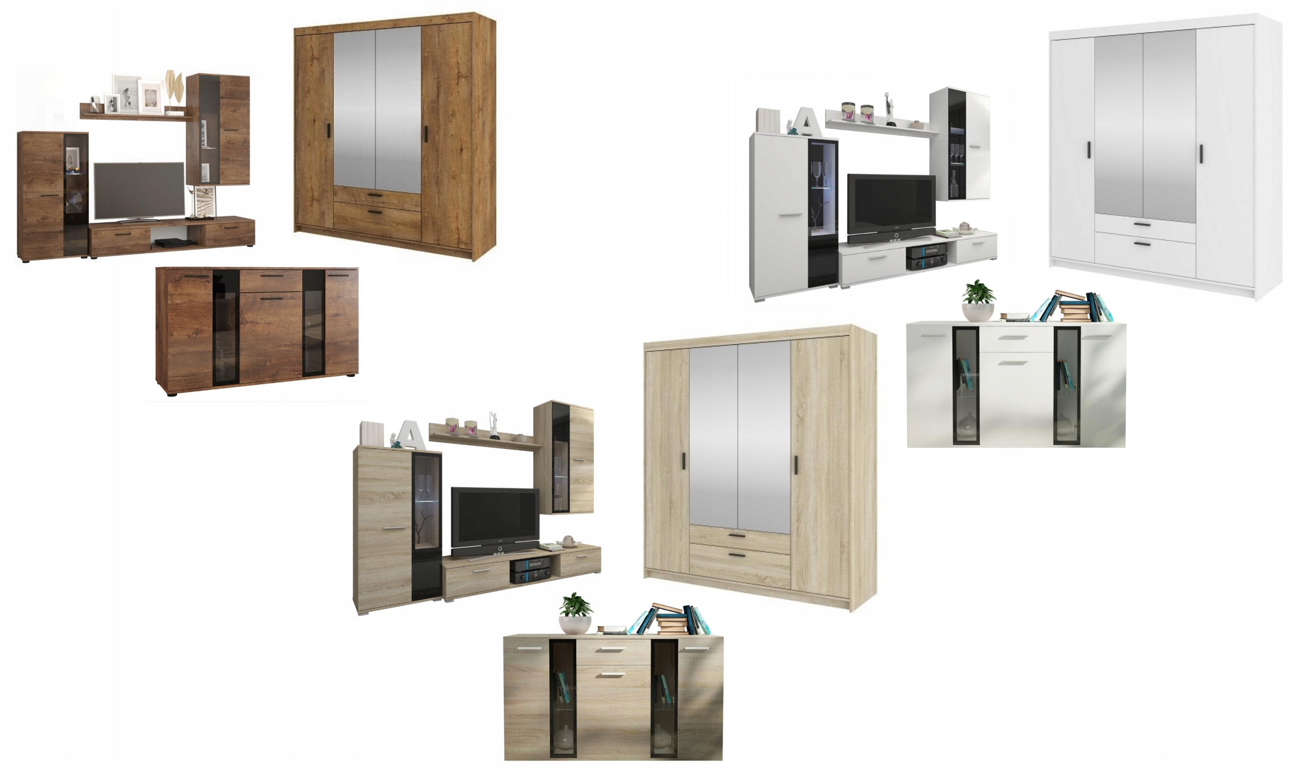 Меблі виготовлені з високоякісної ламінованої стрічки, стійкої до подряпин, з країв АБС, що збільшує термін експлуатації елементів із щоденним використанням. Металеві петлі дозволяють точно регулювати. Набір включає 4 елементи. Висіла полиця, шафа RTV, де ви покладете телевізор, 2 скляні ділянки (висять і стоячи). Всі з опцією світлодіодної підсвічування, якщо ви хочете.