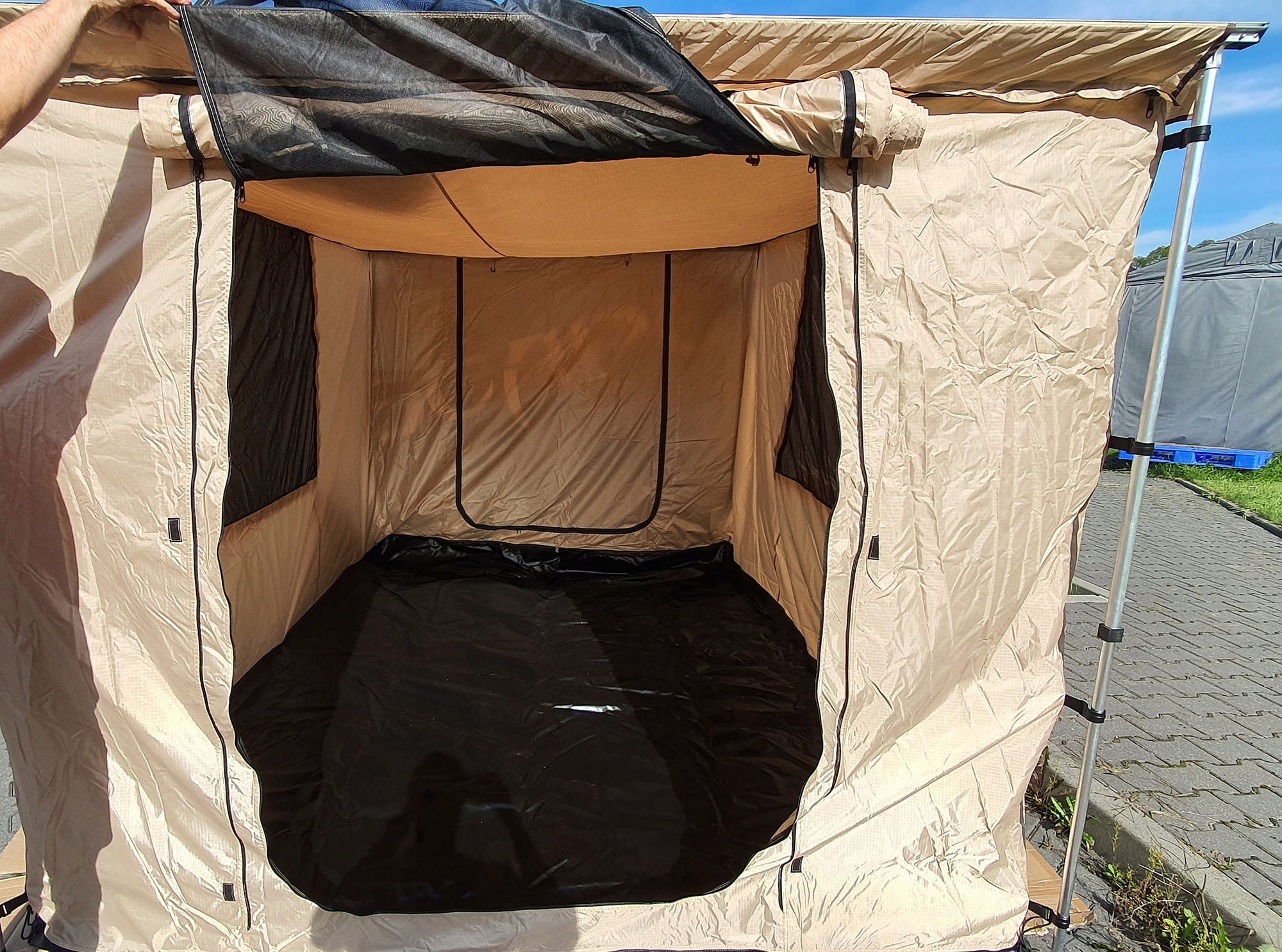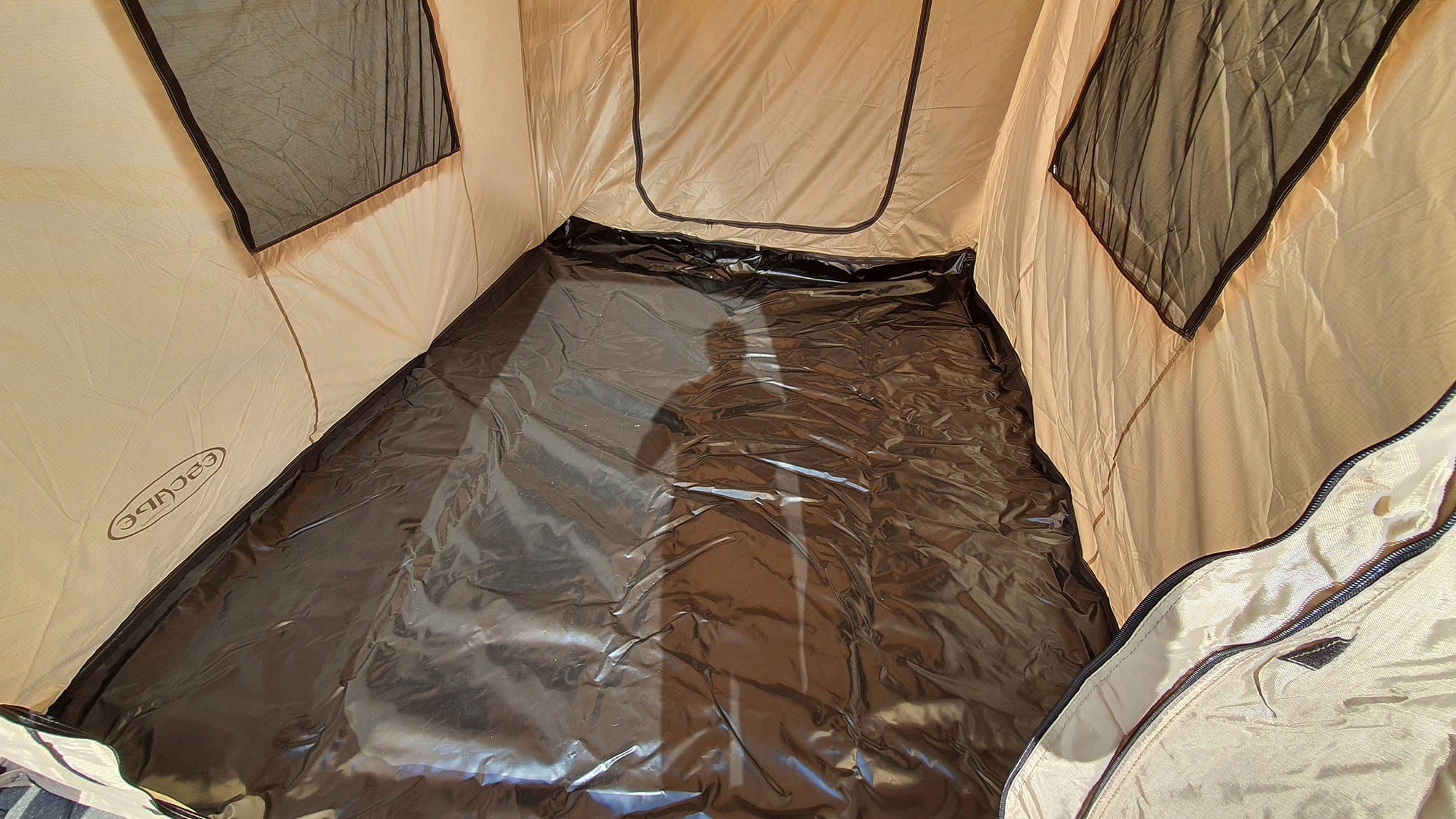 Внизу, прикріплений на блискавку, є чорна підлога, яка, коли в розкладеному вигляді створює щільний намет, дозволяючи розслабитися в будь-яких умовах.