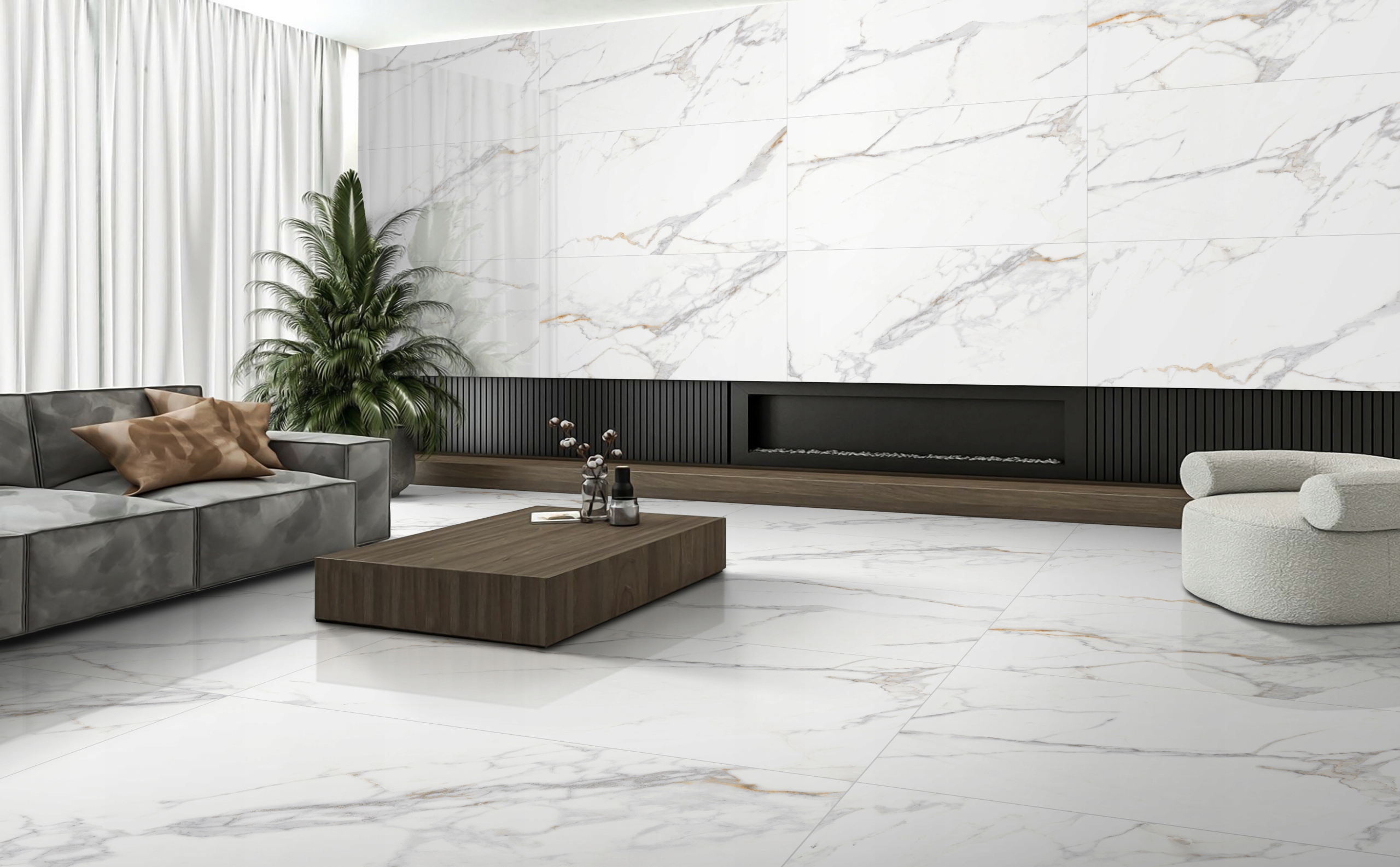 ✔ Розміри: плитка - 60х120 см, що все частіше вибирається в сучасних конструкціях інтер'єру. Вони ідеально підходять для середніх і великих просторів, надаючи їм рівномірний характер. Великі плитки додають простору простору та сучасності.