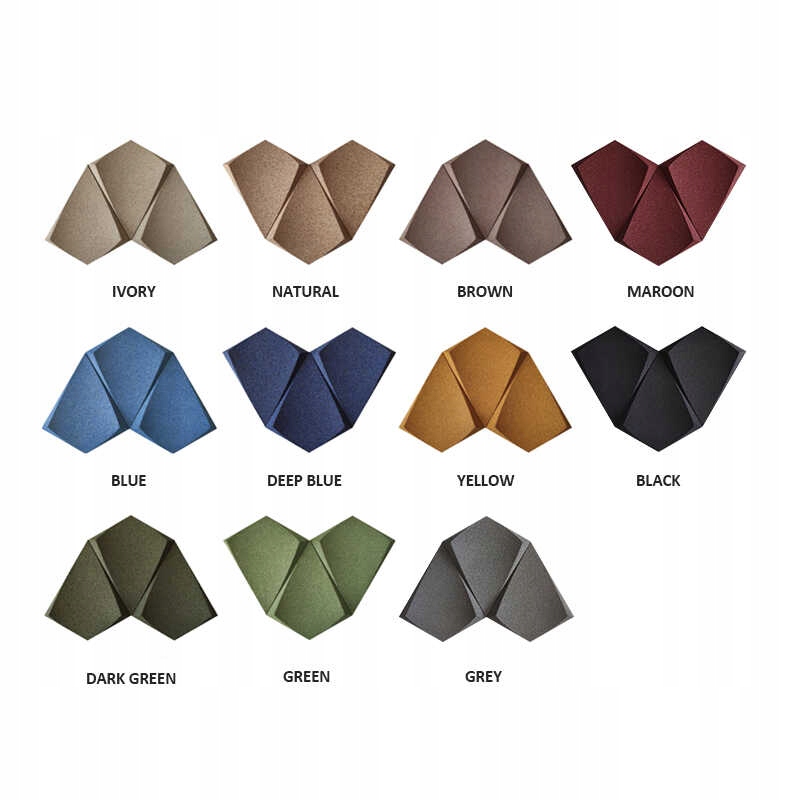 Об'ємна стінова панель доступна в 11 кольорах: слонова кістка, натуральний, коричневий, жовтий, зелений, темно-зелений, темно-синій, синій, бордовий, чорний і сірий. На цьому аукціоні ми продаємо всі кольори, наведені нижче, за винятком натурального кольору, який доступний на нашому іншому аукціоні.