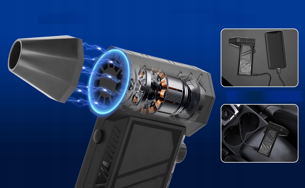 Цей електричний вакуумний очищувач має швидкість 130 000 об/хв і пікова швидкість вітру протягом 52 м/с (супер -тайфун ≥51,0 м/с), що міцно. Стислий пилосос може легко видалити бруд з клавіатур або електронних пристроїв, які зручні в домашніх умовах, офісі та автомобілі.