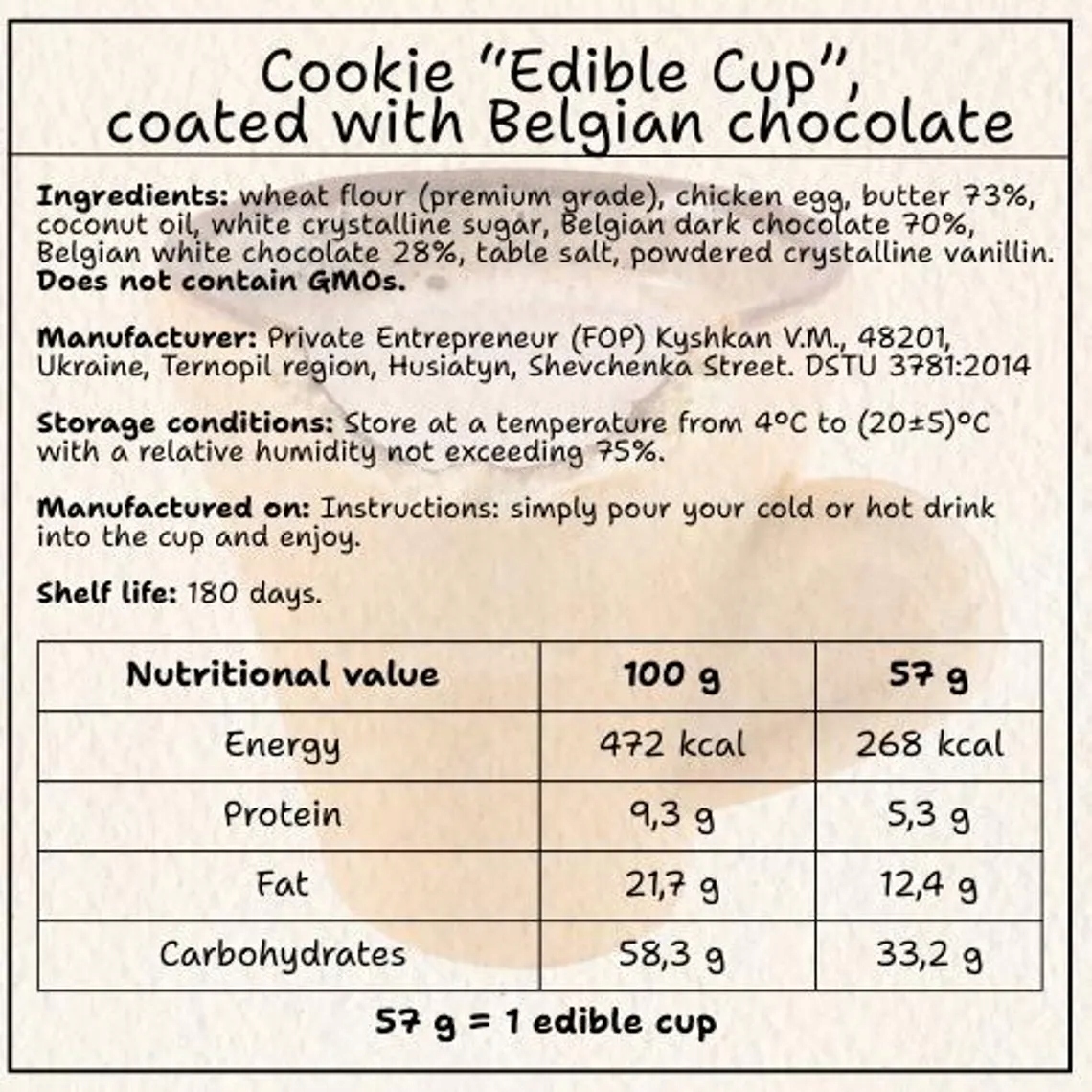 Наша чашка для пиття та їжі – це пісочне тісто ручної випічки, покрите бельгійським шоколадом – залийте гарячою кавою, какао чи молоком, а через деякий час... з’їжте все!