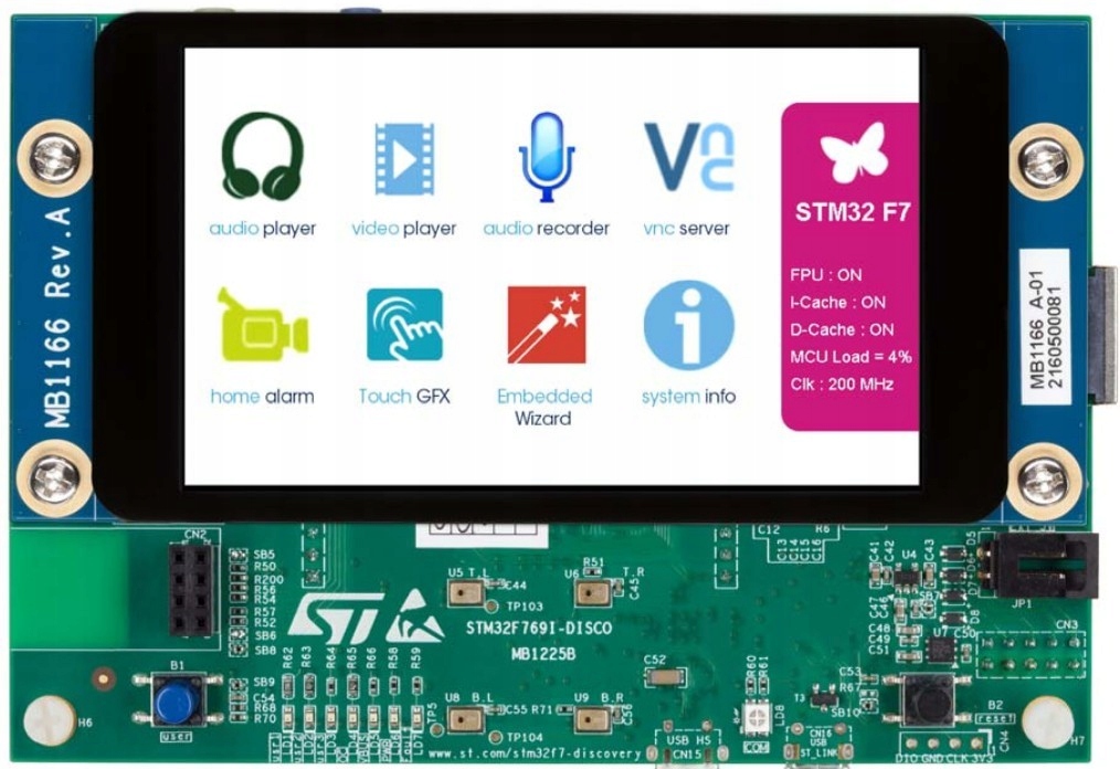Плата з вбудованим сенсорним дисплеєм (ємнісна сенсорна панель), керована ефективним мікроконтролером STM32F769NIH6. Завдяки вбудованому програматору ST-LINK/V2-1 для роботи плати не потрібен зовнішній модуль. Незвичайною особливістю плати є можливість її живлення через дротову мережу (PoE - Power Over Ethernet). Плата оснащена роз’ємами з відстанню, сумісною з Arduino™ UNO R3.