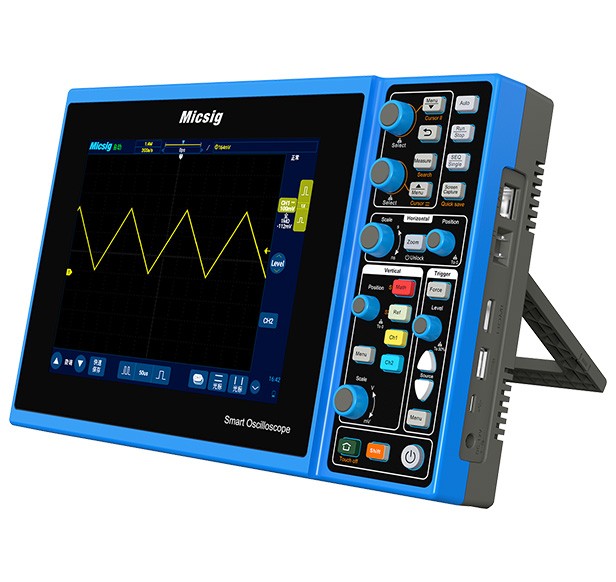 Портативний осцилограф із серії Smart від Micsig — це цифровий осцилограф із 8-дюймовим РК-дисплеєм і сенсорним екраном. Пристрій має два канали і характеризується хорошими параметрами вимірювання: смуга пропускання 200 МГц, частота дискретизації 2 Гвиб./с і буфер пам'яті 280 Мпц. Він має численні виходи, що дозволяють підключатися до іншого пристрою через USB (хост і пристрій), HDMI, LAN і WiFi. Крім того, осцилограф оснащений роз'ємом живлення і акумулятором ємністю 7500 мАг, що дозволяє працювати до 5 годин на одному заряді. У корпусі також є підставка, що дозволяє розмістити осцилограф під кутом 45° для зручності роботи.