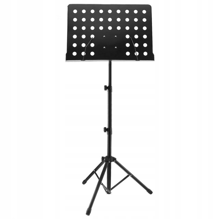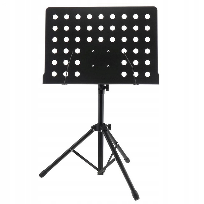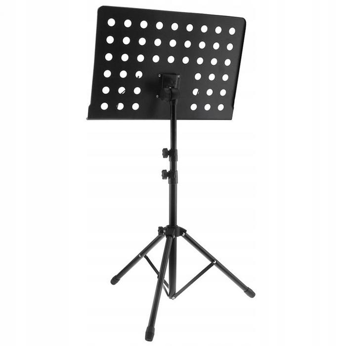 Ажурна структура стільниці забезпечує легкість і зручність використання. Встановлений на регульовану головку, він дозволяє маневрувати кутом нахилу. Широка полиця з фіксаторами дозволяє зберігати великий нотний лист!