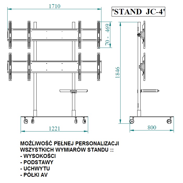 Таблиця. База, персоналізована на 4 телевізійних моніторів MAX 75 "MAX 120KG ::- Можна намалювати стійку в будь-якому кольорі з палітри RAL