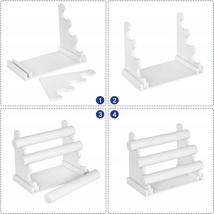 Тримач браслета можна легко скласти за лічені секунди. Вертикальні частини можна з’єднати двома способами для створення високого або низького профілю, адаптуючи підставку до ваших потреб. Гнучкість і легкість монтажу є додатковими перевагами цього продукту.