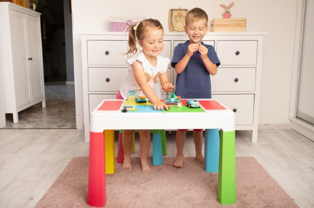 - Під стільницею знаходяться три контейнери, два менших і один більший, приблизно 8 см у глибину. У них можна зберігати іграшки, кольорові олівці та інші дрібниці.