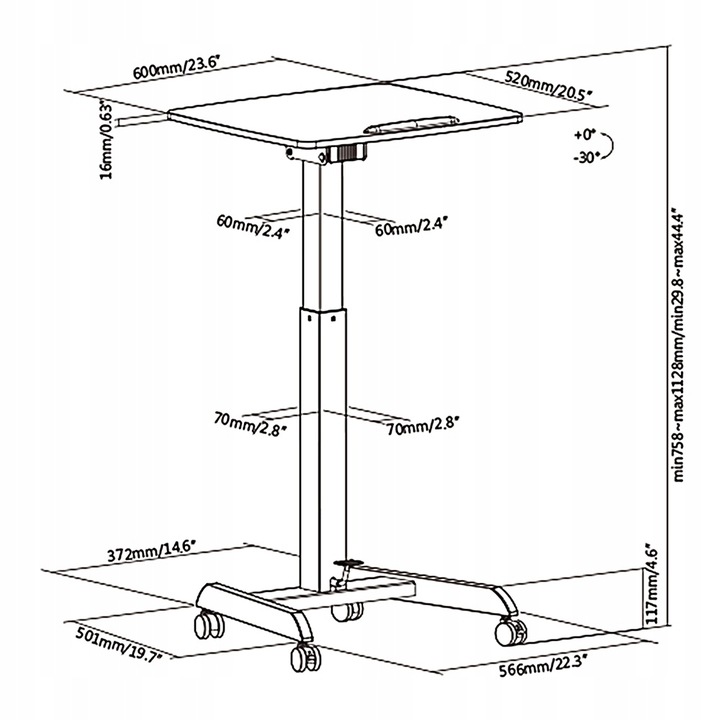 - Регулювання нахилу стільниці від 0 до 30 градусів