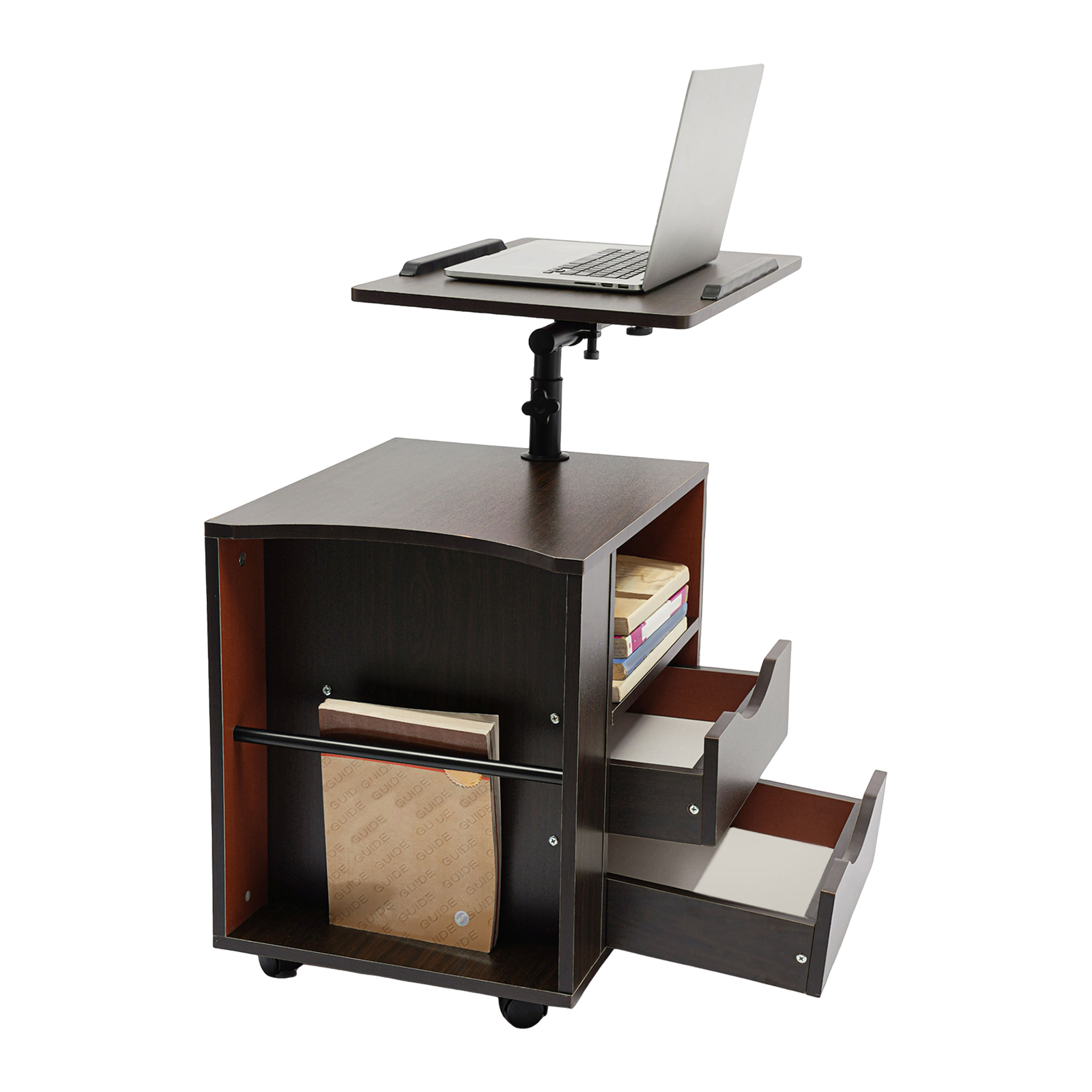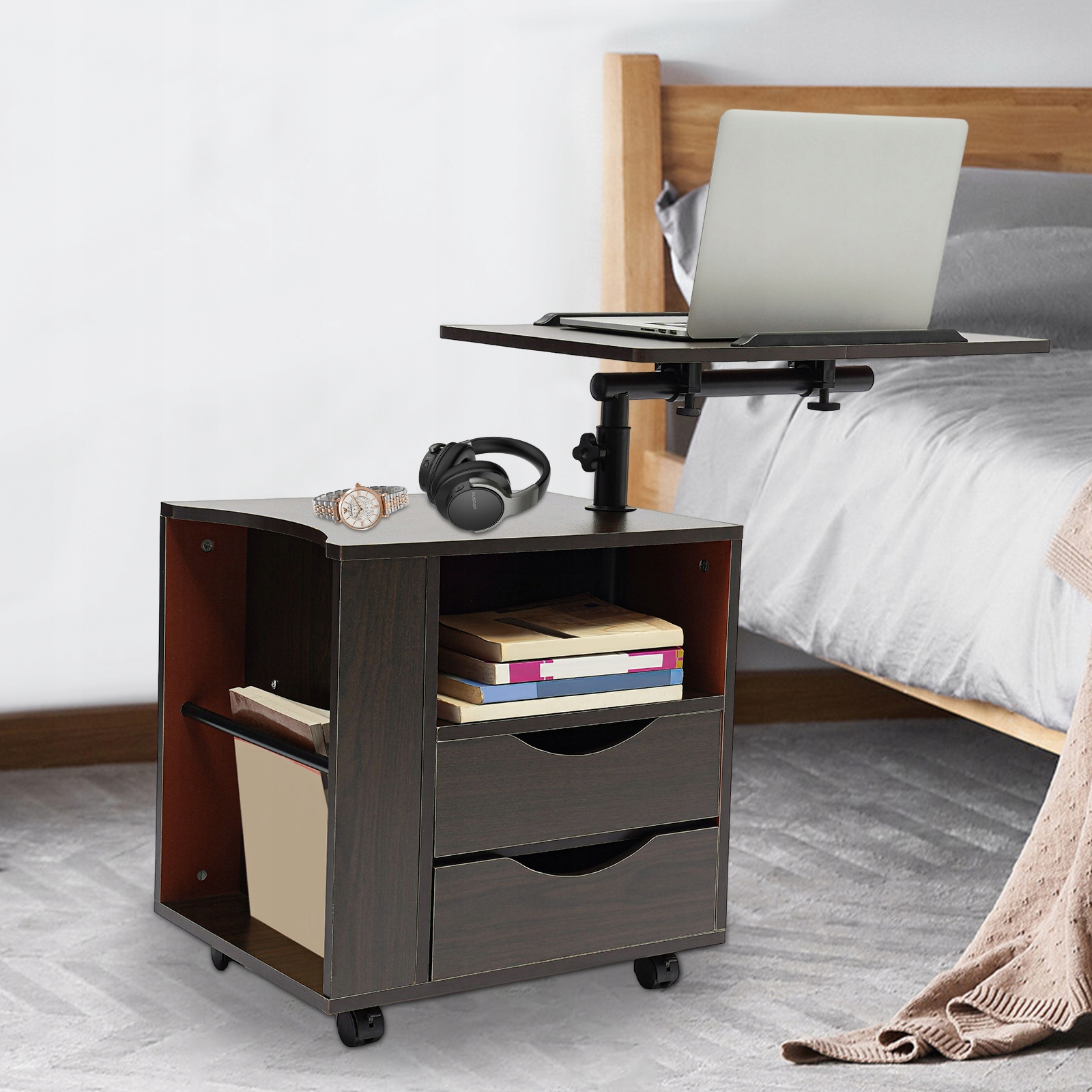 Хочете, щоб ваша тумбочка була більш функціональною? Не пропустіть нашу тумбочку з підйомником, яка оснащена поворотною підйомною пластиною з регульованою висотою та кутом нахилу, завдяки чому вам буде зручніше використовувати ноутбук, планшет та інші пристрої на ліжку чи дивані. Між тим, чотири універсальні колеса також дозволяють легко переміщати цей продукт, незалежно від того, чи ви можете використовувати його в спальні чи вітальні.
