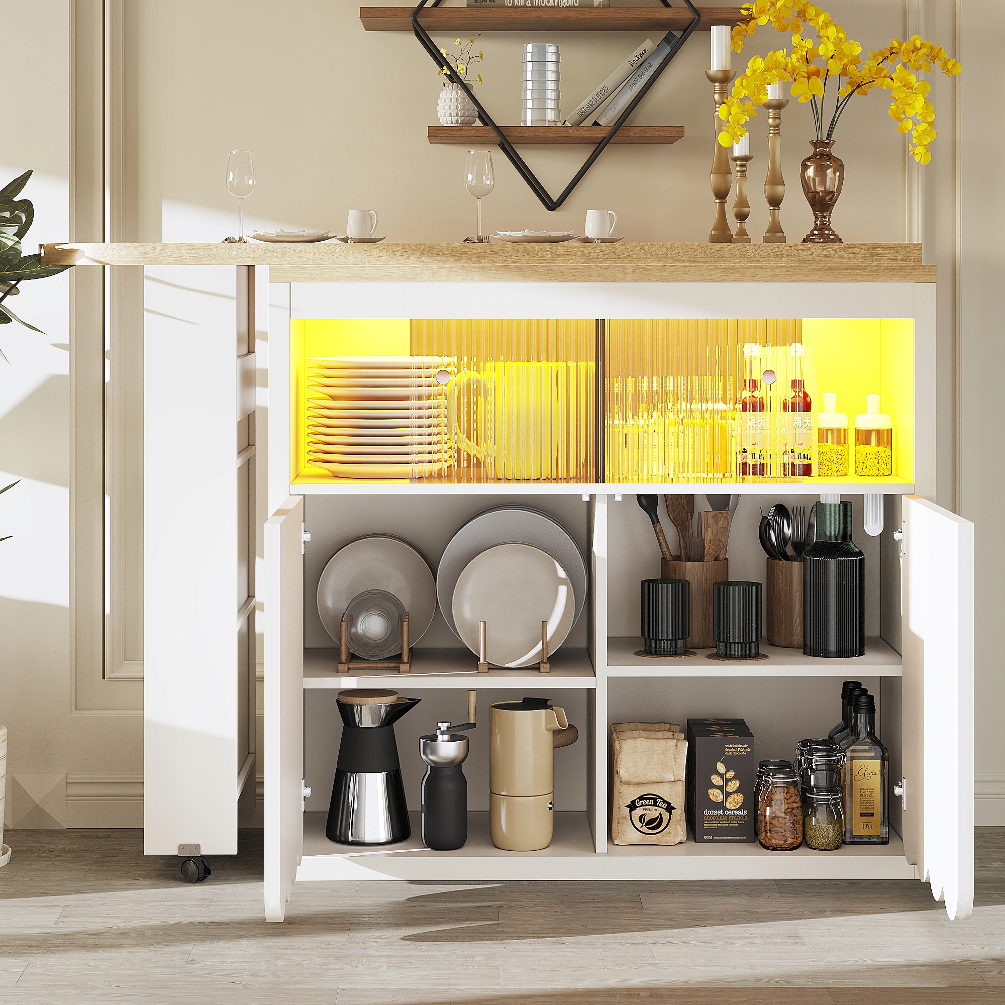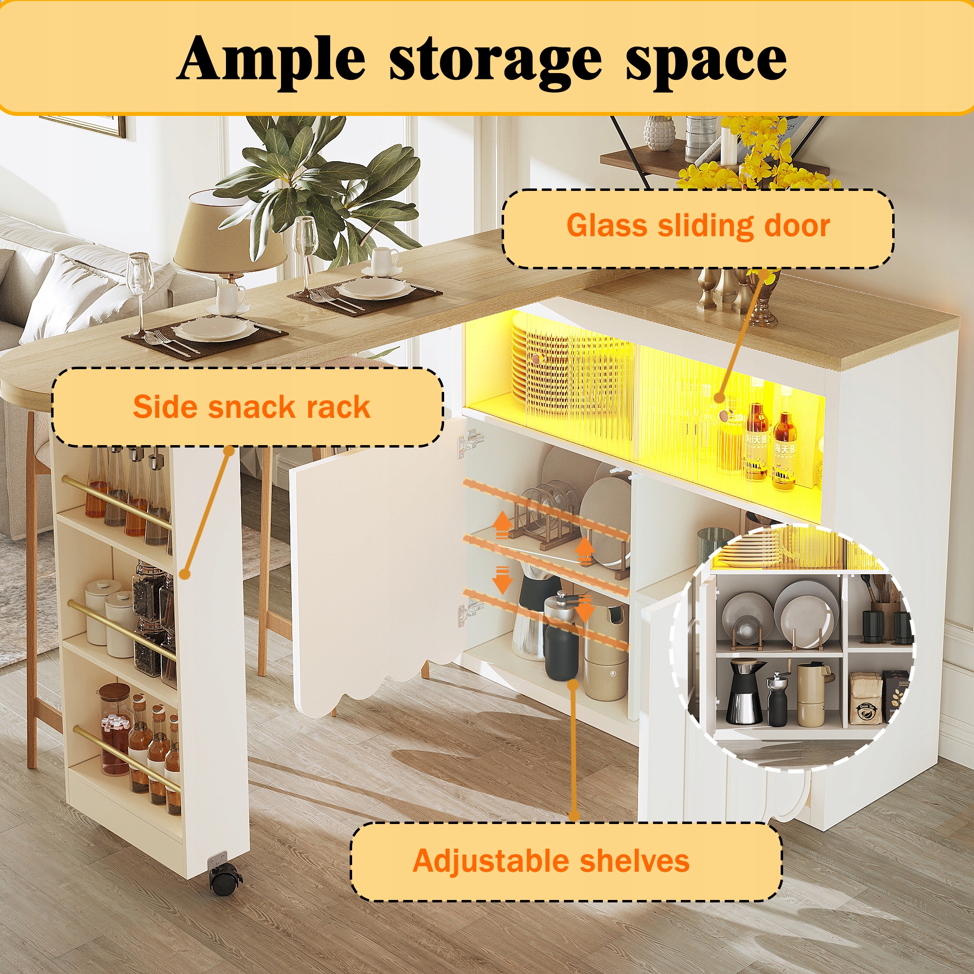 Добре спроектоване та організоване зберігання:з боковою полицею для закусок, розсувними скляними дверцятами та регульованими відділеннями він пропонує багато місця для зберігання. Завдяки цьому ваша вітальня чи їдальня завжди охайні та організовані.