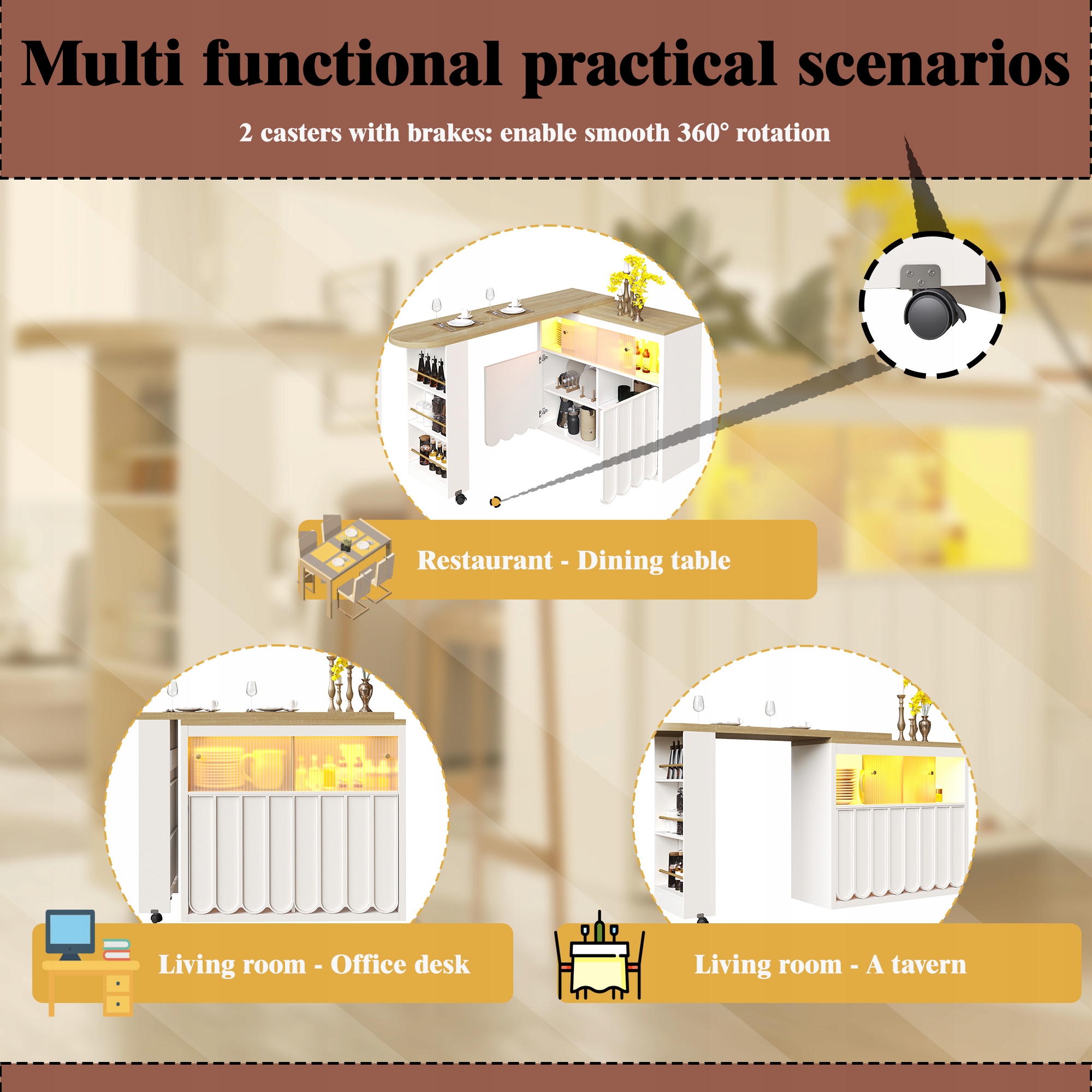 Розумна мобільність і різноманітні сценарії застосування: Оснащений коліщатками з гальмами, він легко ковзає та може бути надійно зафіксований на місці. Цей універсальний предмет меблів можна миттєво перетворити з обіднього столу на барний стіл у вітальні, письмовий стіл у кабінеті чи елегантну тумбу та ідеально впишеться в компактну кімнату. Будучи ідеальним центральним предметом меблів для більшої гнучкості у вашому домі, він служить багатьом цілям.