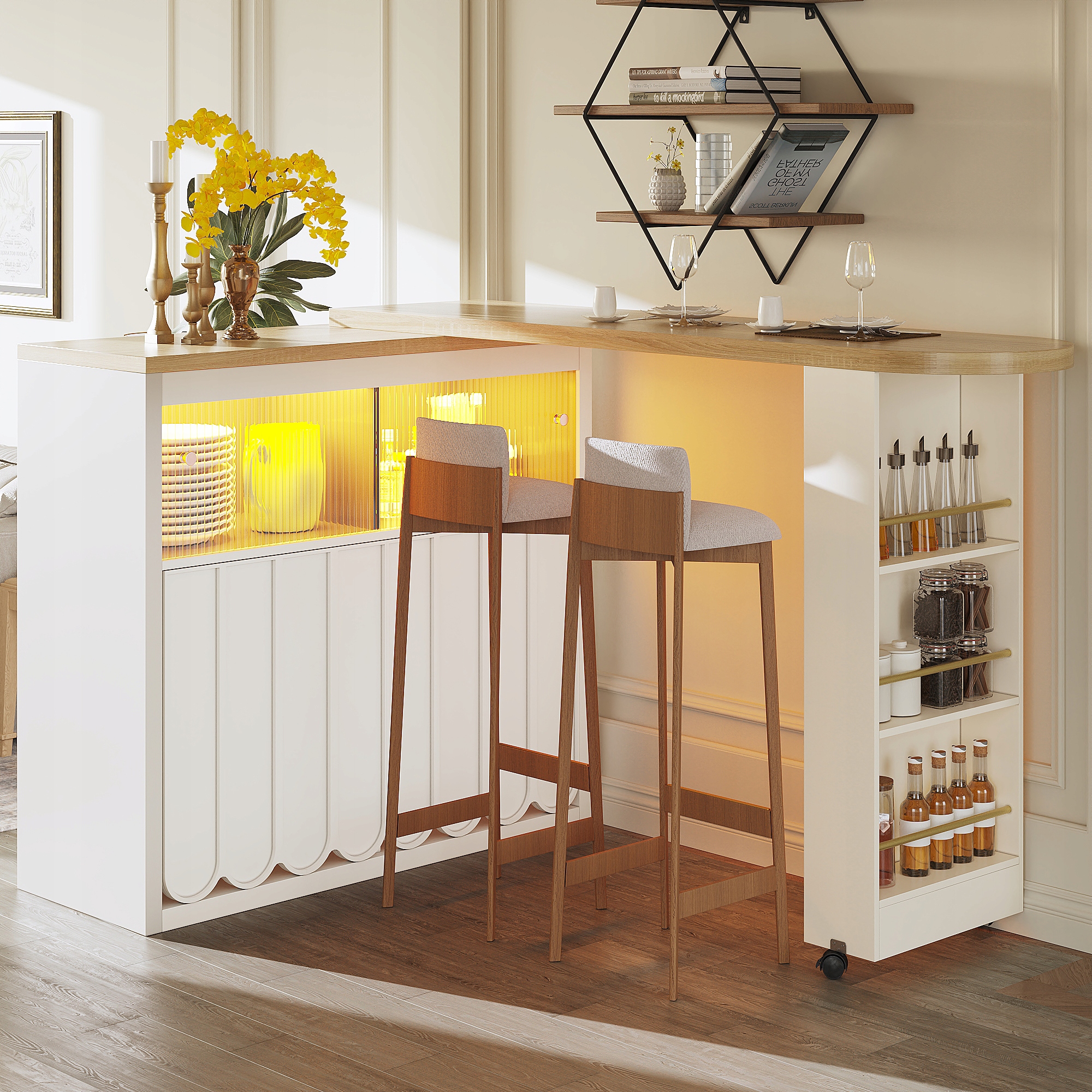 Пропонує великий організований простір із розсувними скляними дверцятами, інтегрованою боковою стійкою для закусок і регульованими полицями відповідно до ваших потреб у сховищі.