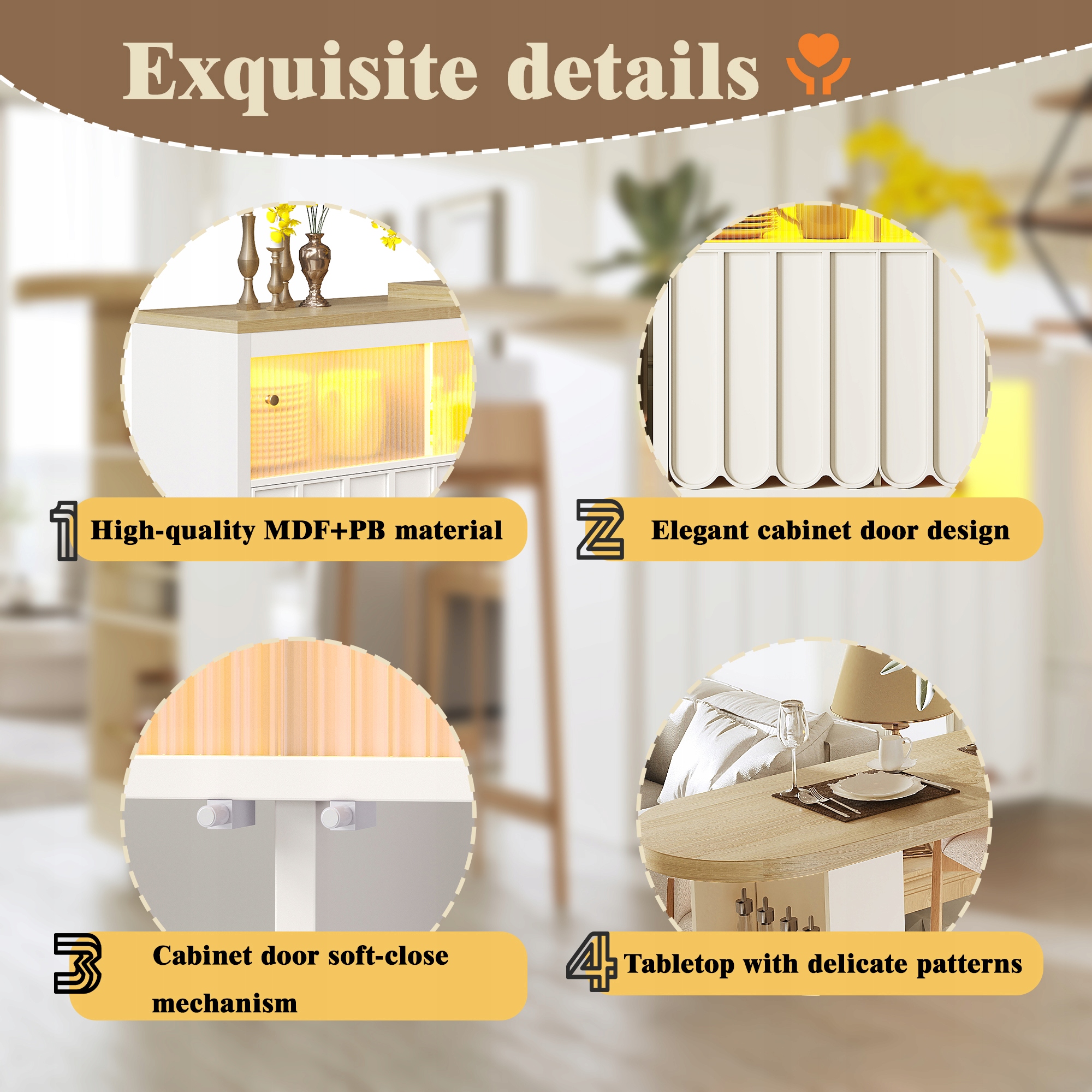 Цей виріб, виготовлений із високоякісного МДФ і ПБ, має елегантні дверцята шафи з механізмами плавного закривання та верхню частину з делікатним малюнком для тривалого стилю.