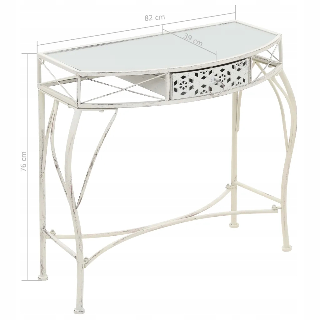 Стіл з металевого каркаса і скляної стільниці стійкий і легко миється. Стіл оснащений висувним ящиком і прикрашений унікальними деталями, які надають йому вигляд під старовину. Завдяки цьому він привнесе у ваш дім нотку елегантності. Його легко зібрати.