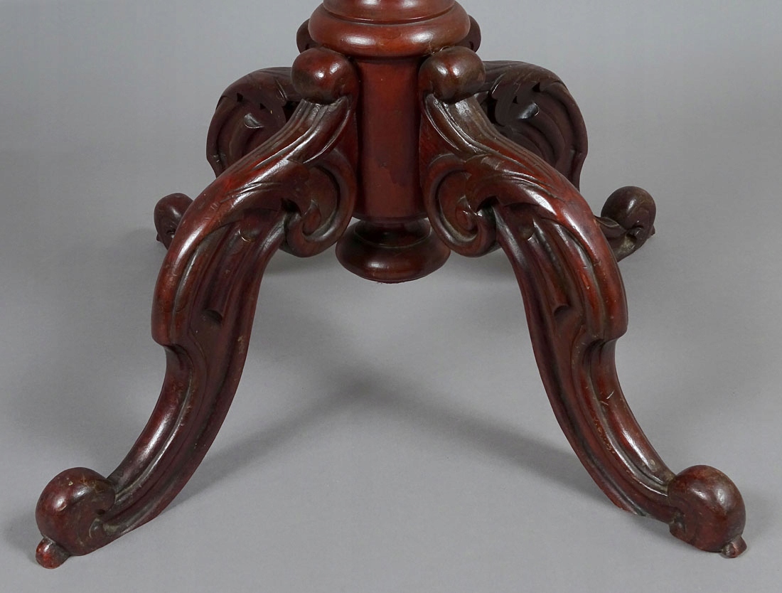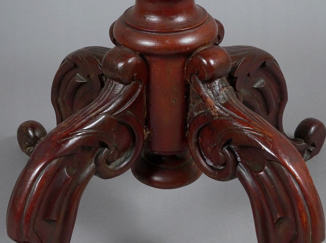 з круглою стільницею, що підтримується точеним різьбленням у формі листа. В основі чотири різьблені широкі ніжки, прикріплені до тулуба. Стіл стійкий, з лакованою стільницею, інші елементи поліровані.