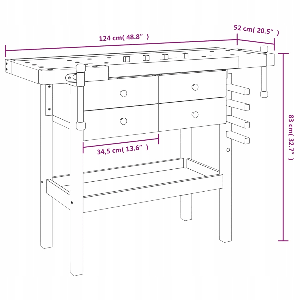Stolik roboczy z szufladami i imadłami, 124x52x83 cm, akacjowy