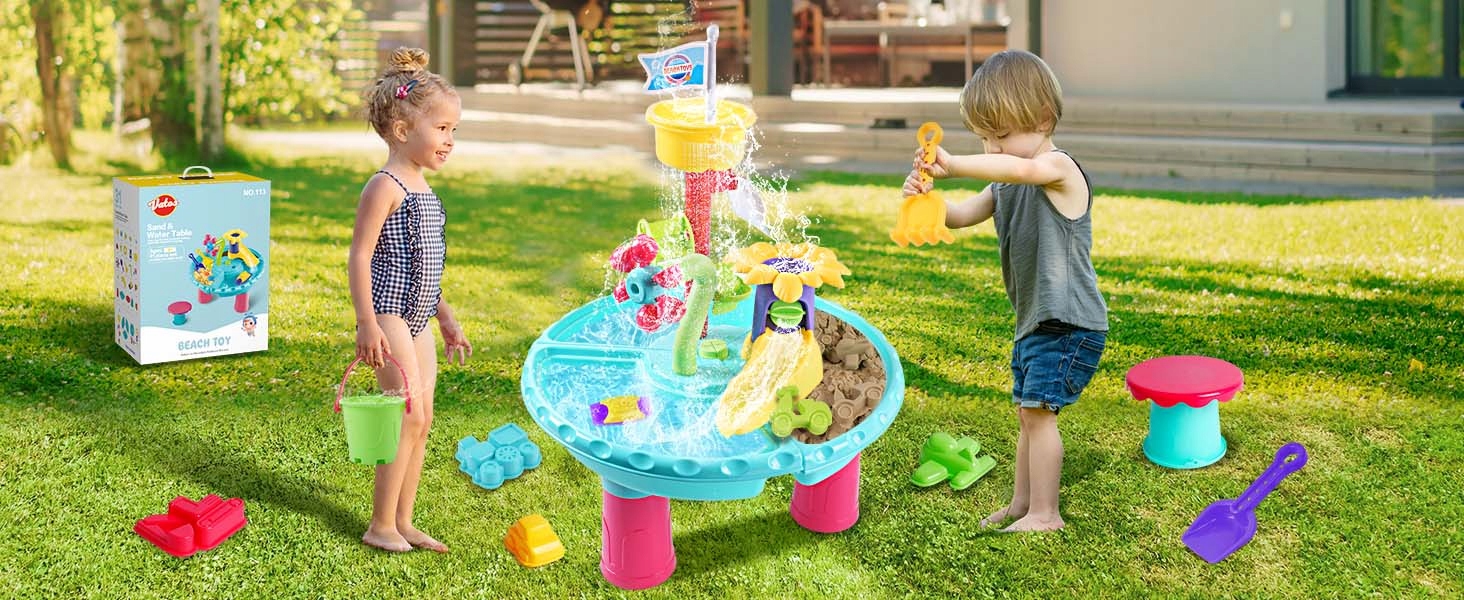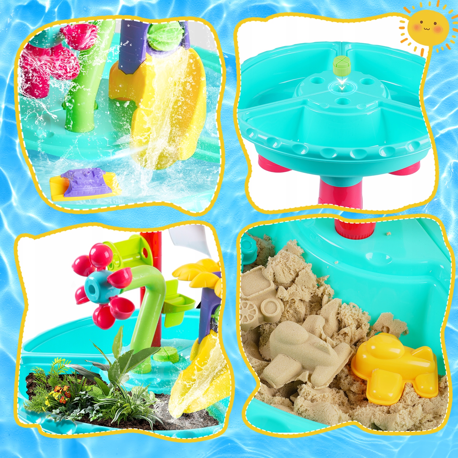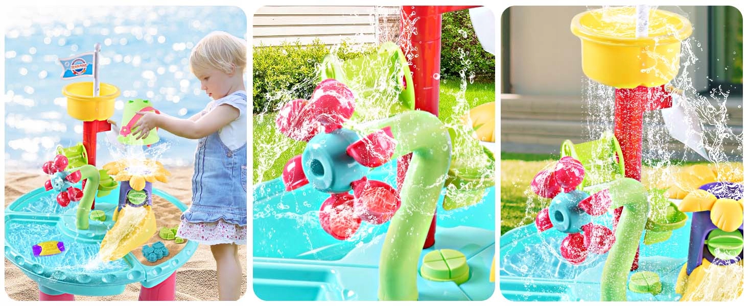 - ⭐Цей дитячий водний столик постачається з кольоровими аксесуарами, зокрема водяним столиком, квітковим колесом, доріжкою до дерев, спринклерною вежею, прапорцем, табуретом, водяним колесом, відерцем, човен, ситечко, лопата та граблі, різноманітні форми з піском тощо.